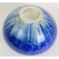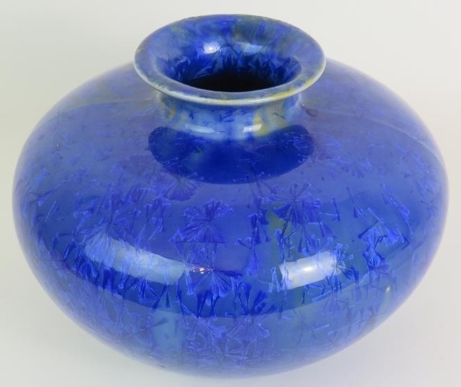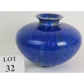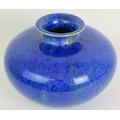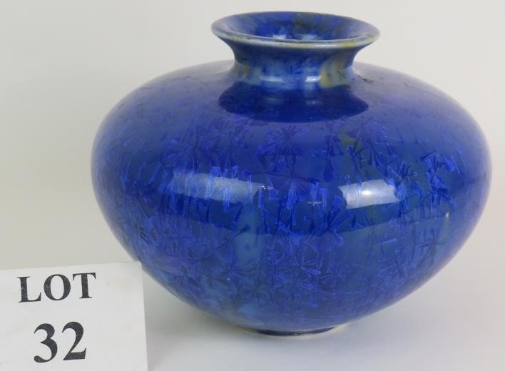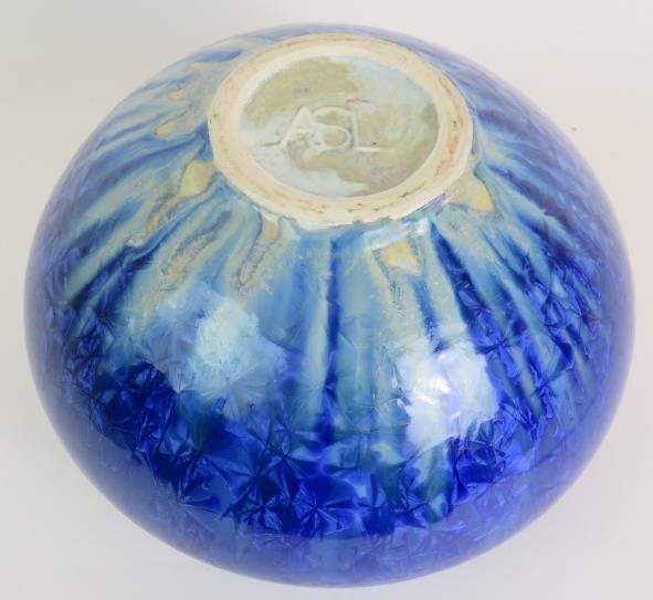 A large squat blue studio pottery vase by Tony Lamerick with overall seed head decoration. Marked ASL to base. Diameter 25cm. Height 19cm.