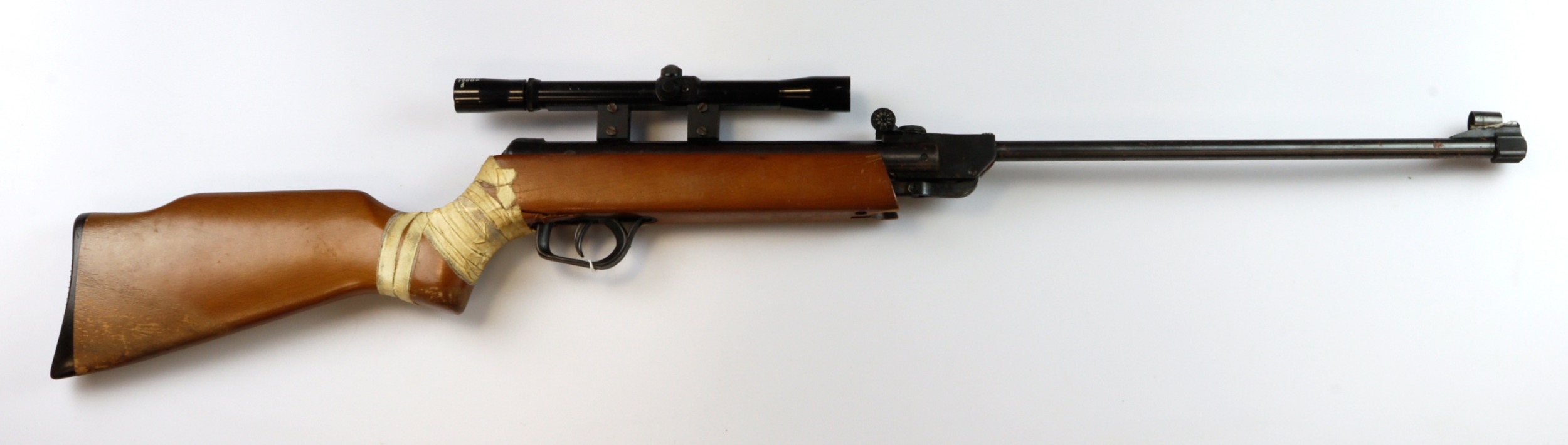 Air Rifle .22 calibre ASI Rangemaster air rifle with telescopic sight. In very good working order. The stock has a bandage repair at the wrist. It seems to be an adequate repair with no movement. The metalwork retains virtually all original blued finish. A decent gun. Made in Spain. A/F