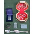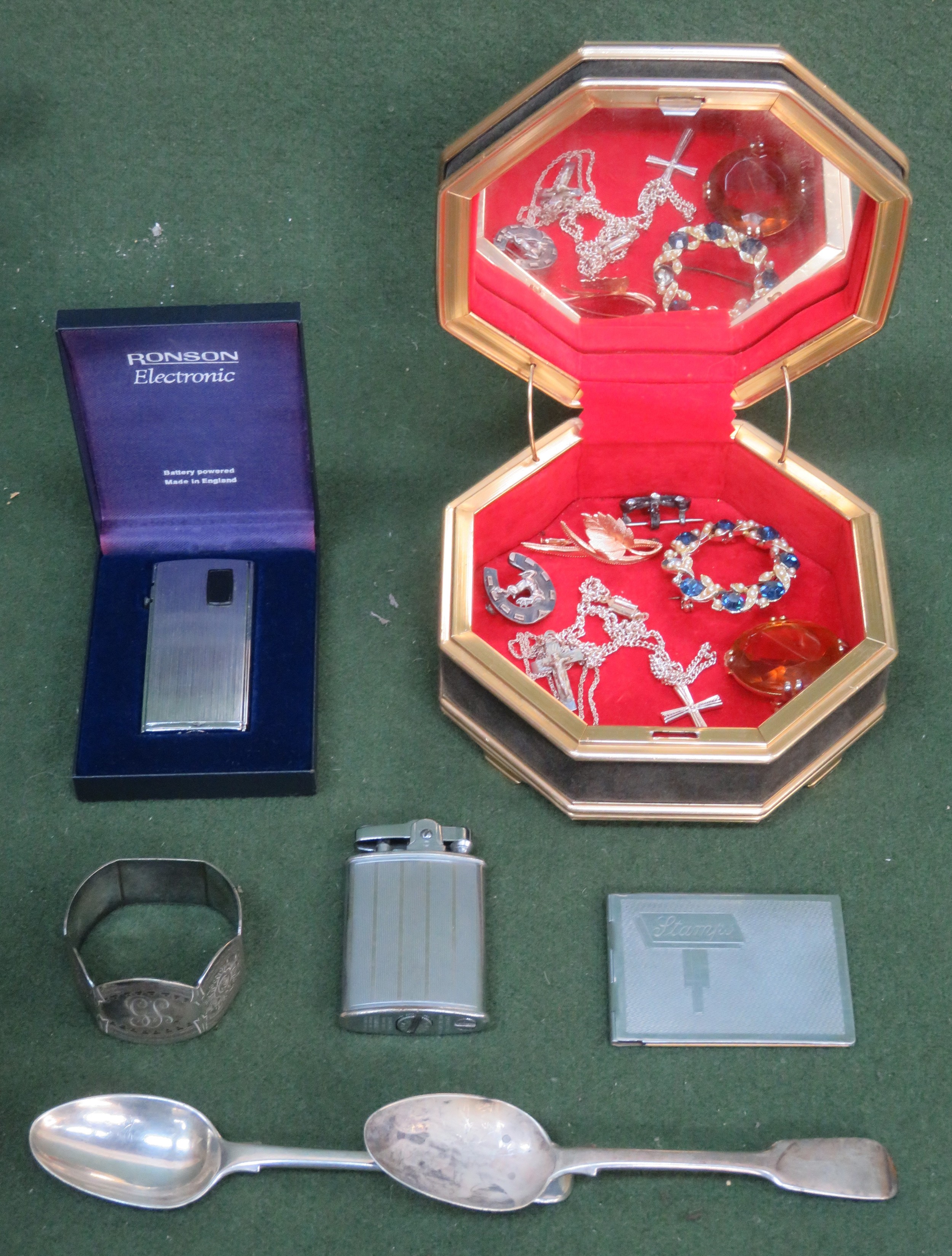 Sundry lot including two silver spoons, brooches, crosses on chains, napkin ring, lighters, stamp case etc