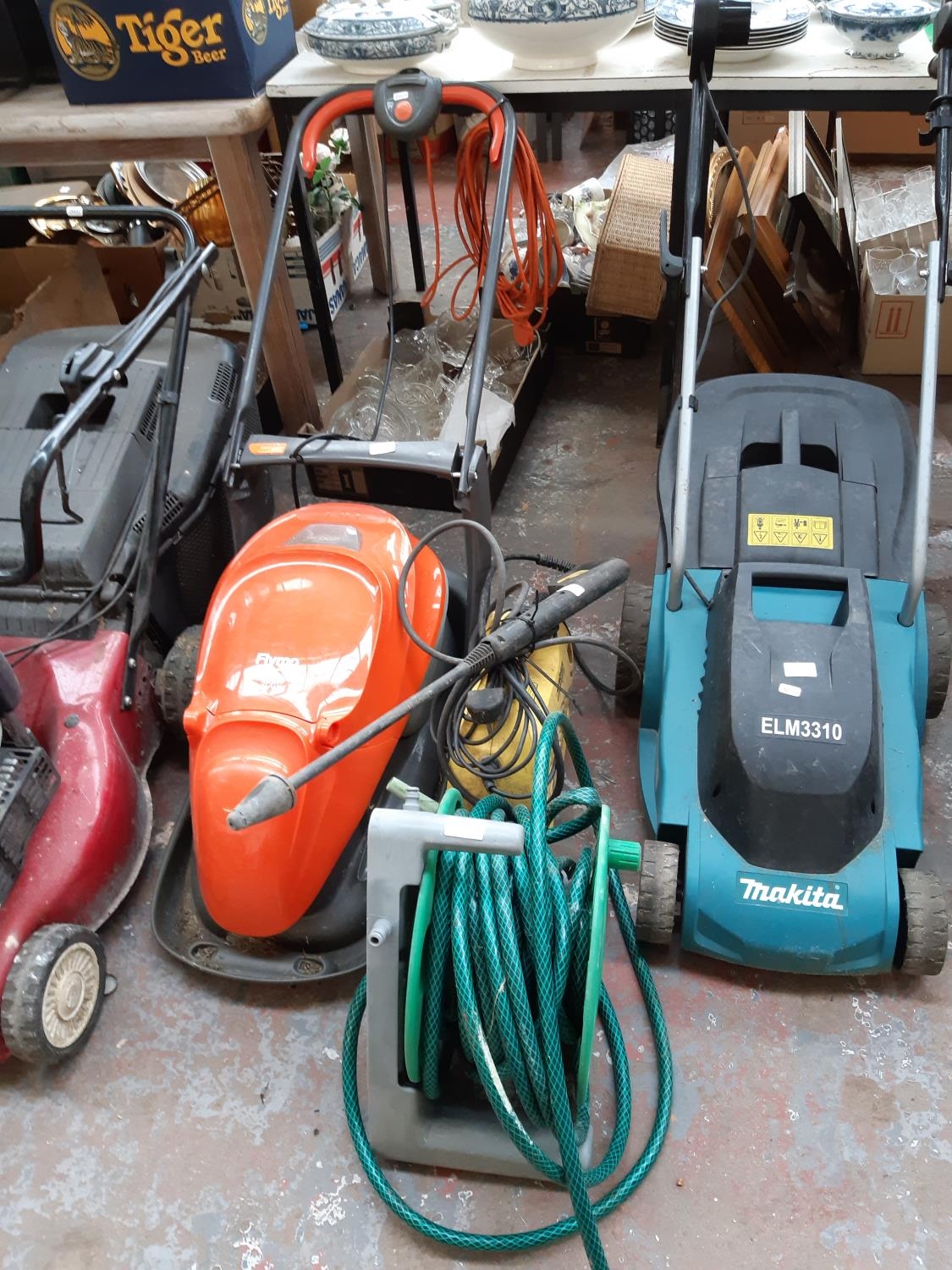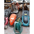 THREE ITEMS TO INCLUDE AN ORANGE AND GREY FLYMO EASI GLIDE 300V ELECTRIC HOVER MOWER, KARCHER K2.01 PRESSURE WASHER WITH HOSE AND LANCE AND A HOZELOCK HOSE REEL