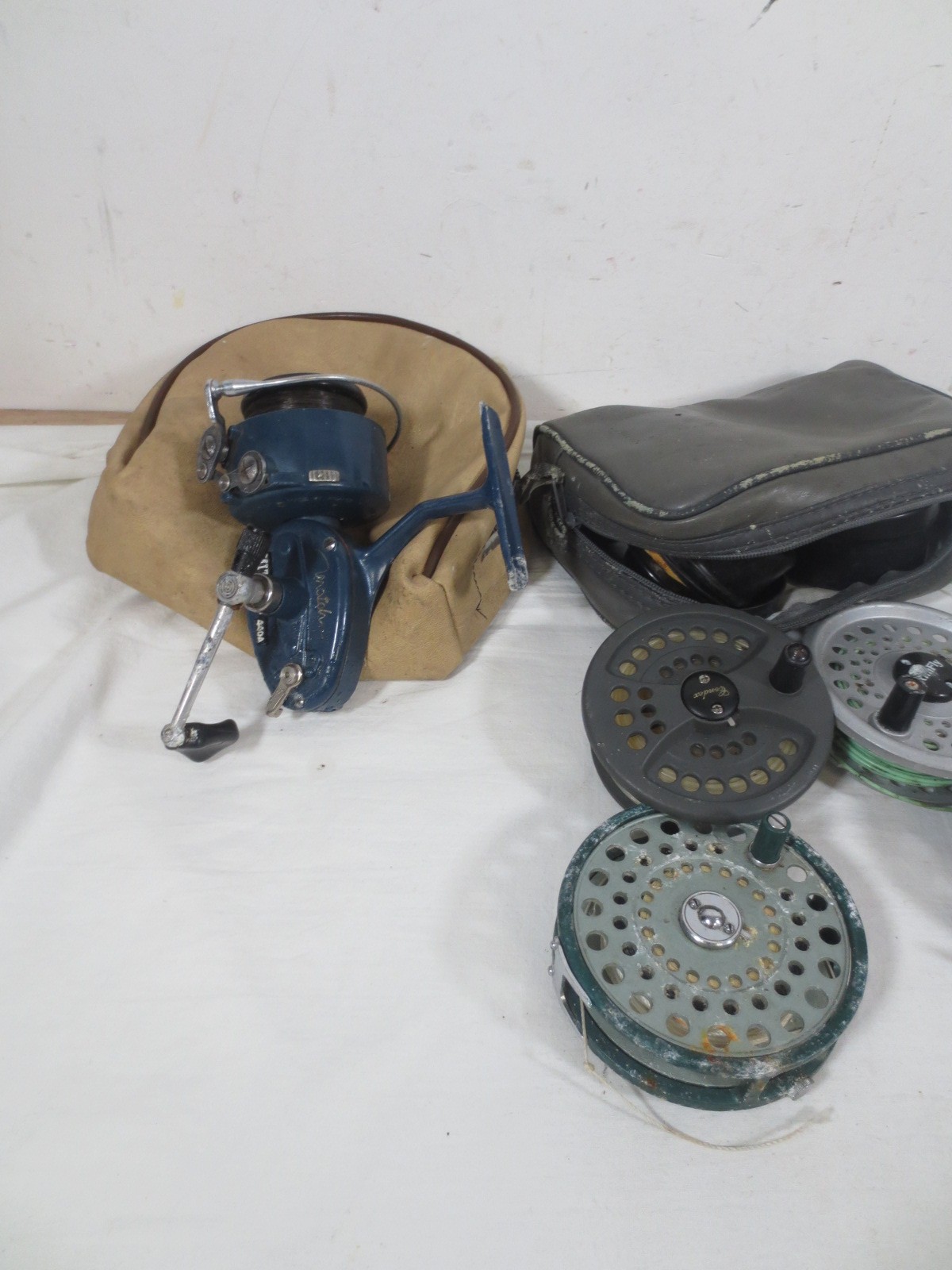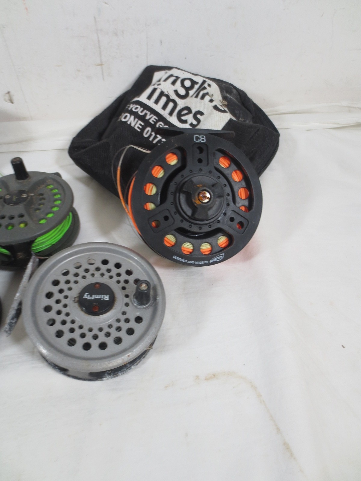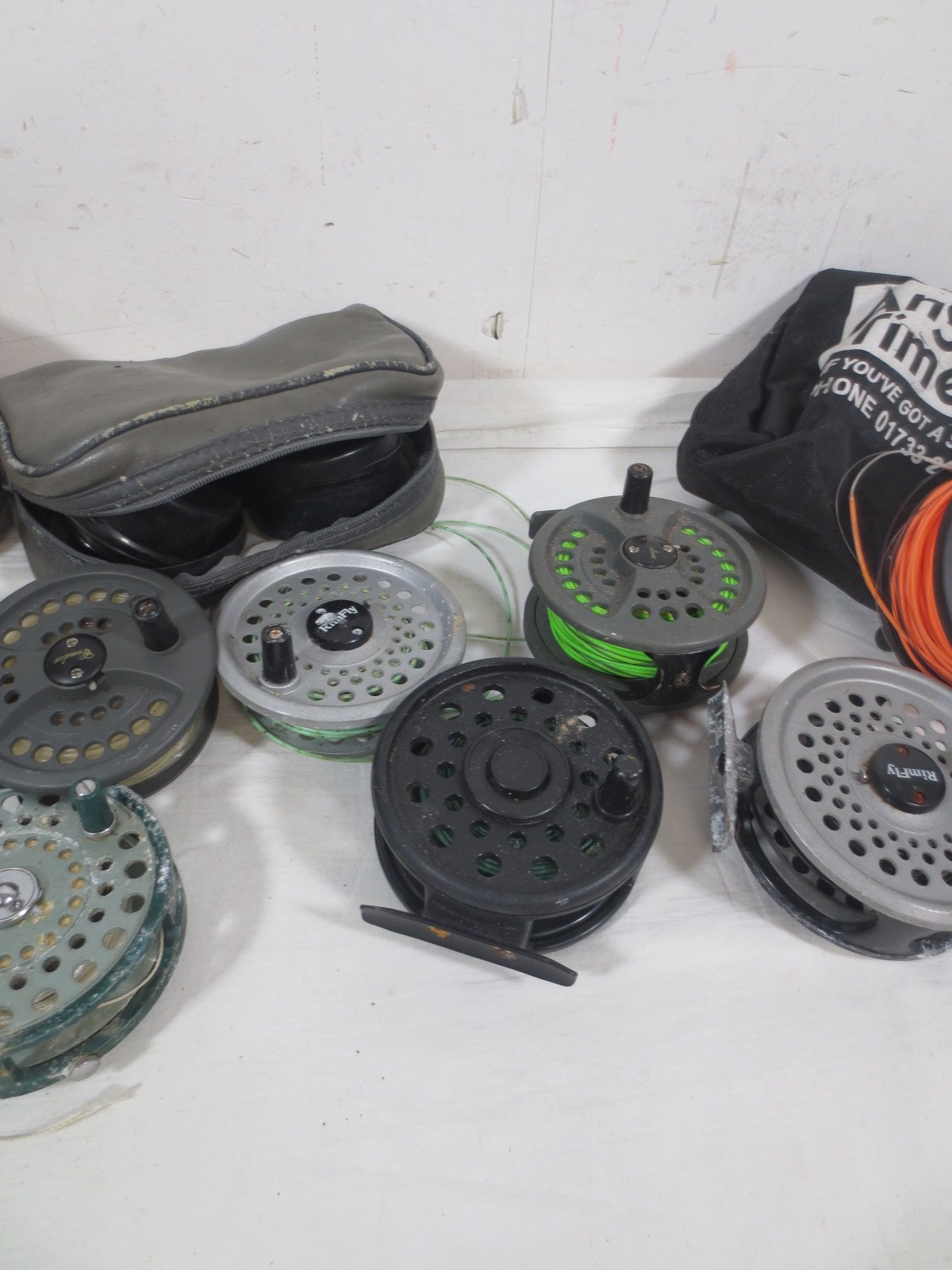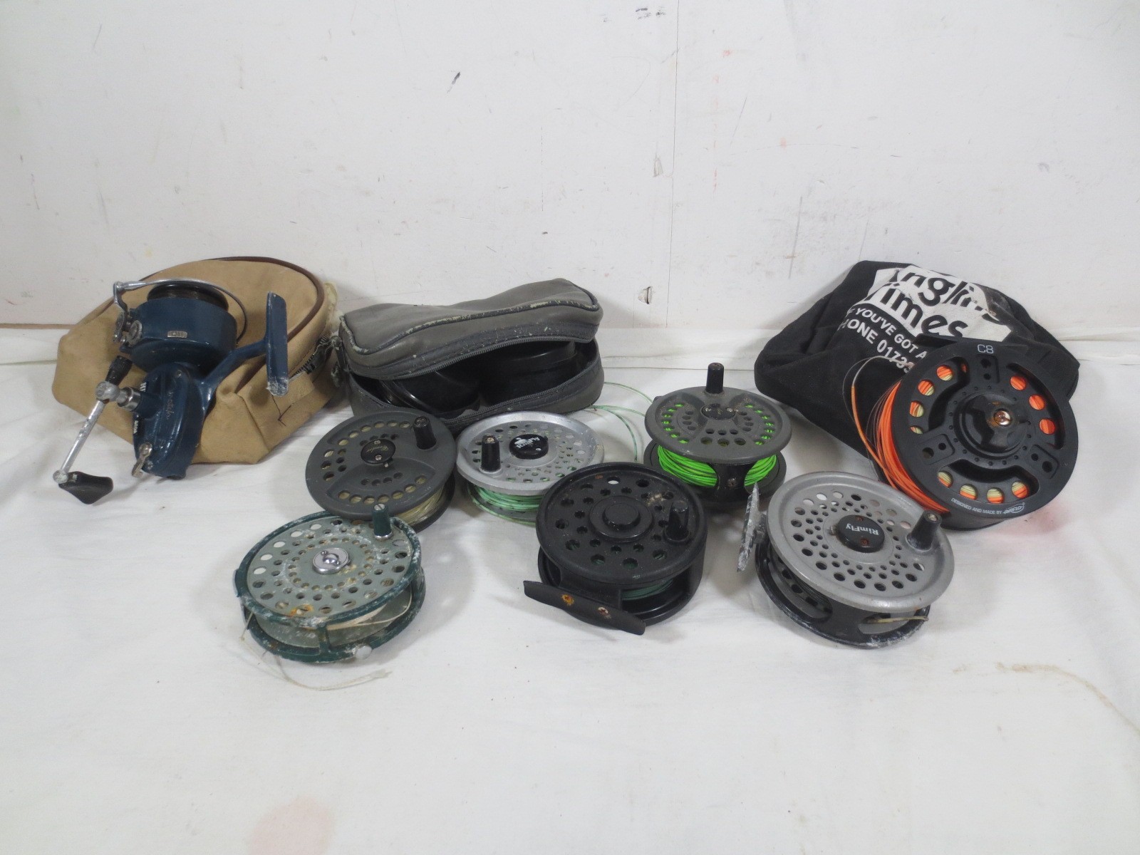 A selection of 8 fishing reels, mainly fly fishing, plus various spools etc