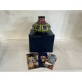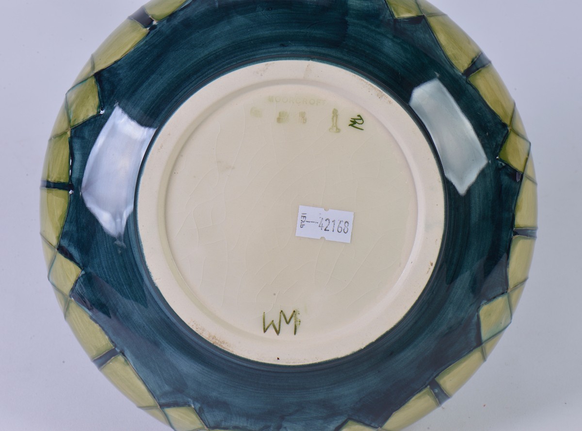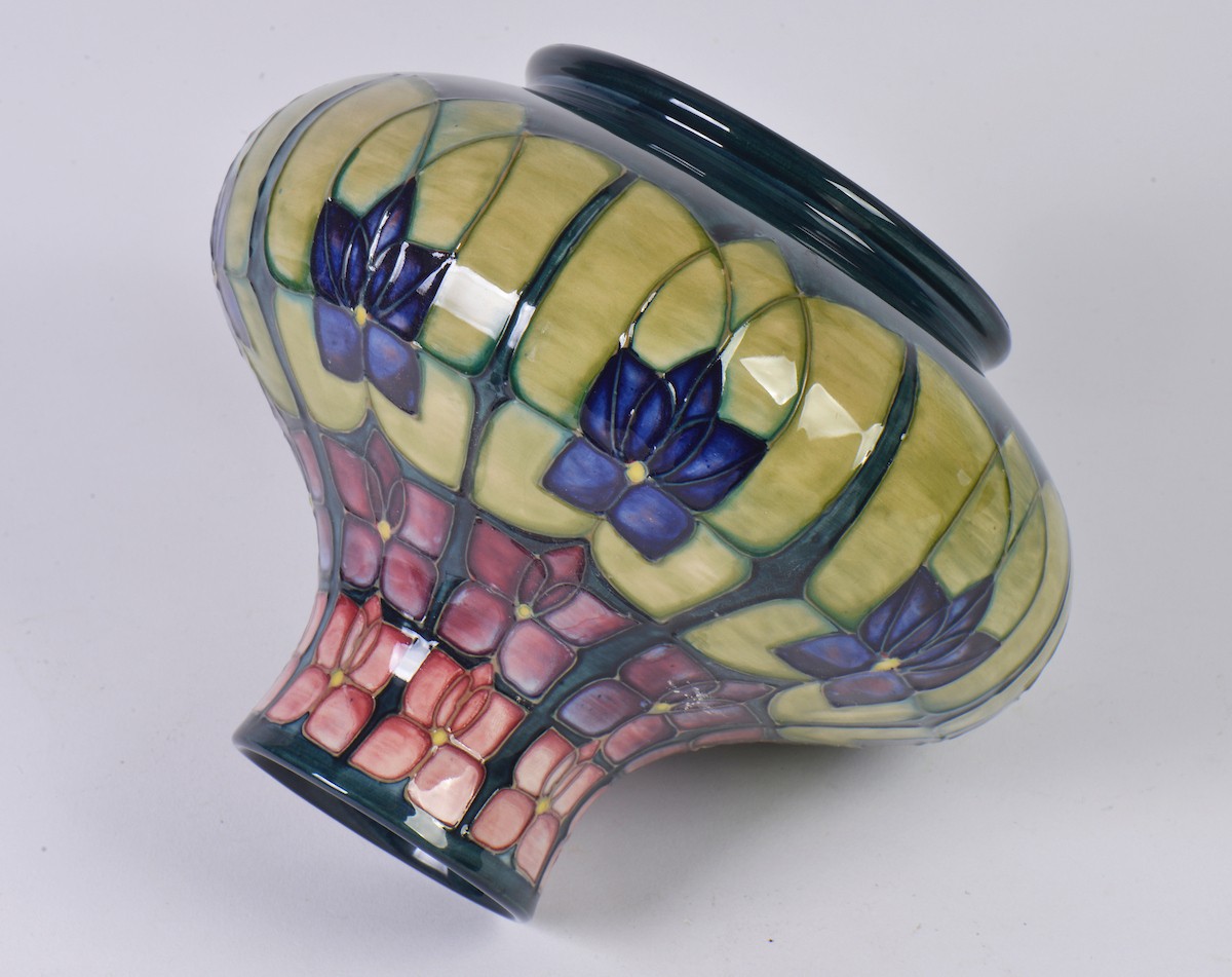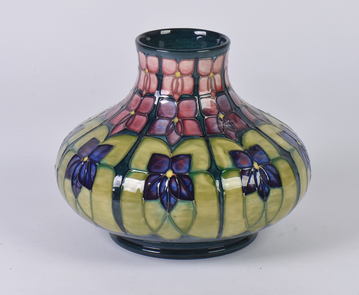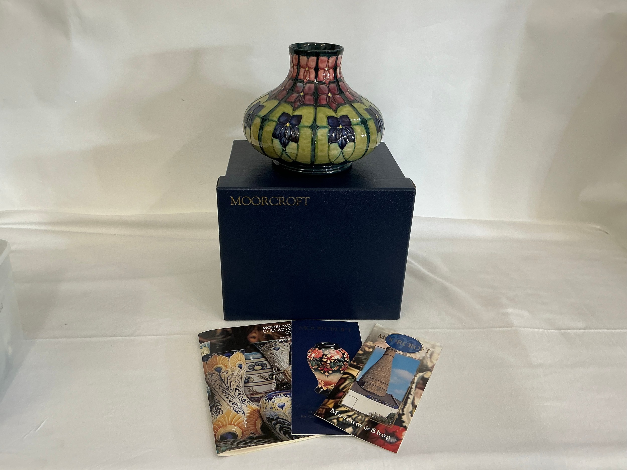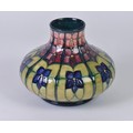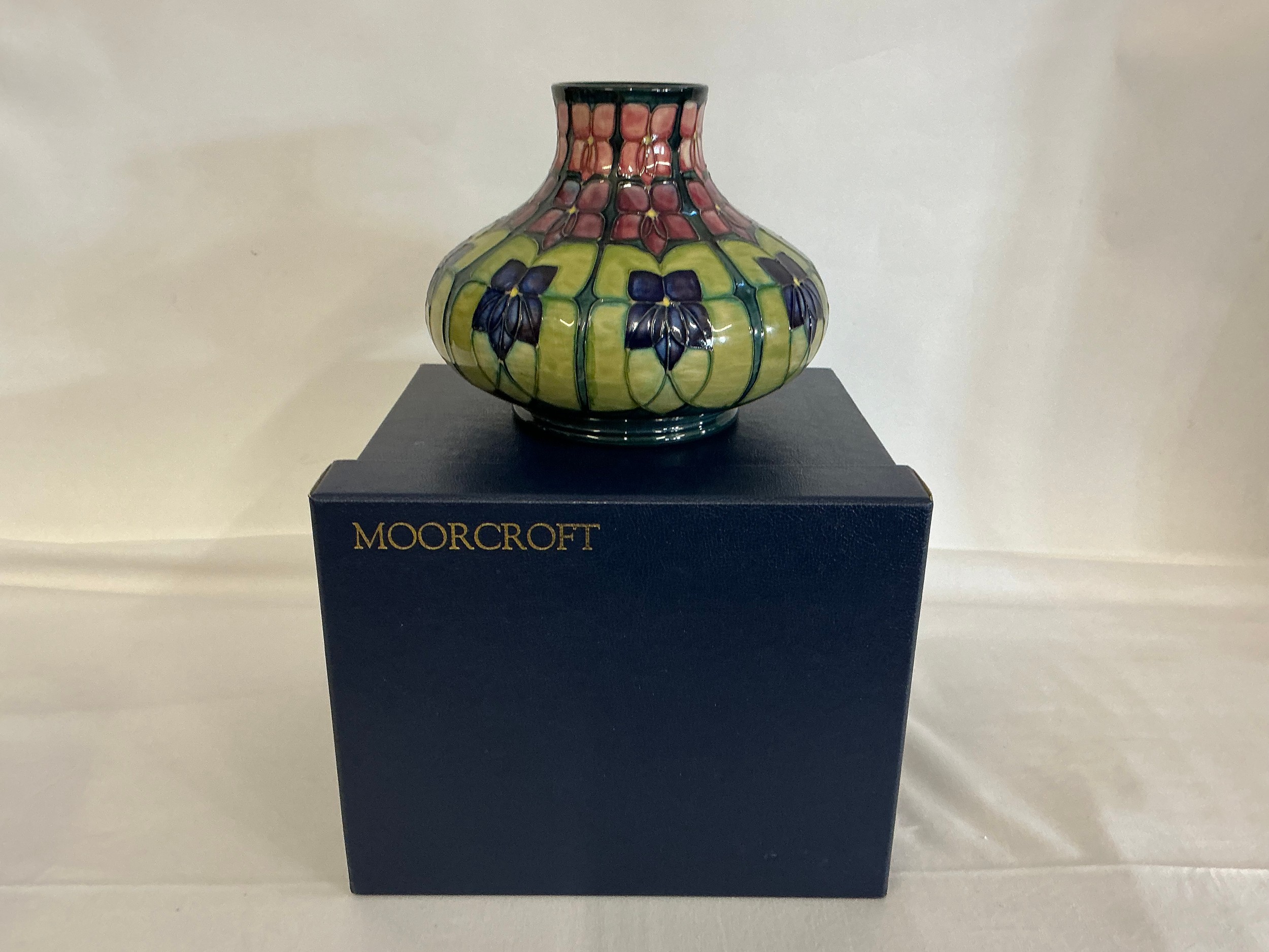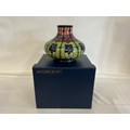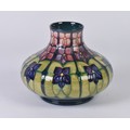 An Art Nouveau design Squat patterned Moorcroft Vase decorated in Purple & Green Complete with Original Box & Paperwork. Measuring: 16cms high.