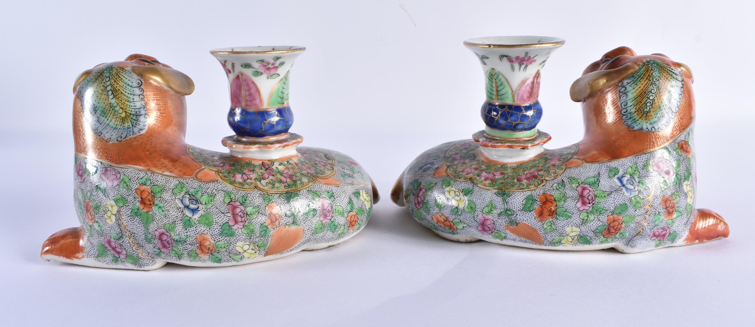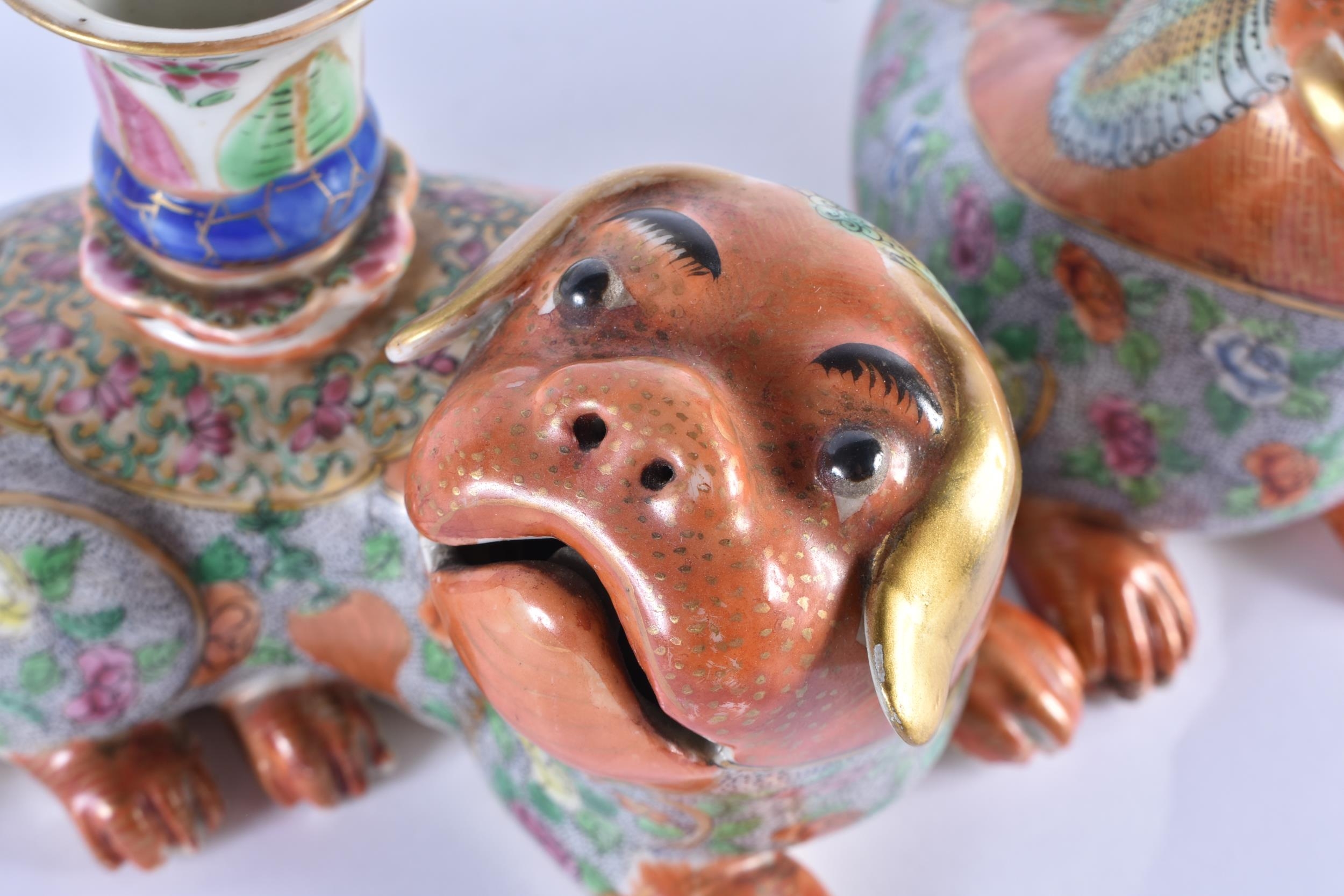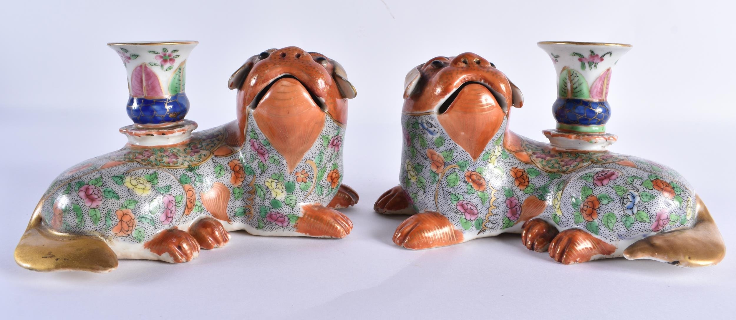 A PAIR OF EARLY 19TH CENTURY CHINESE CANTON FAMILLE ROSE JOSS STICK HOLDERS Qing, modelled as coral painted recumbent dogs. 18 cm x 12 cm. Note: Famille rose is a type of Chinese porcelain introduced in the 18th century and defined by pink overglaze enamel. It is a Western classification for Qing dynasty porcelain known in Chinese by various terms: fencai, ruancai, yangcai, and falangcai.