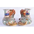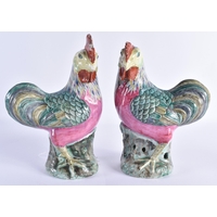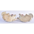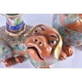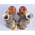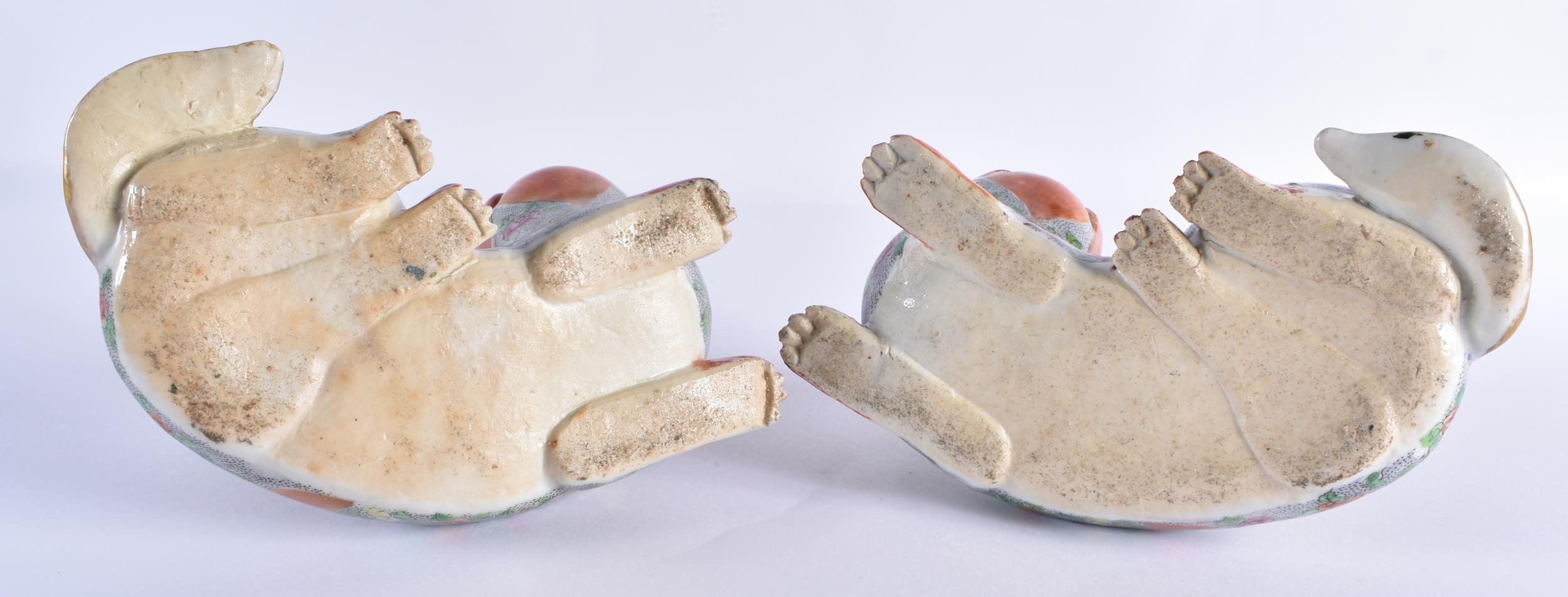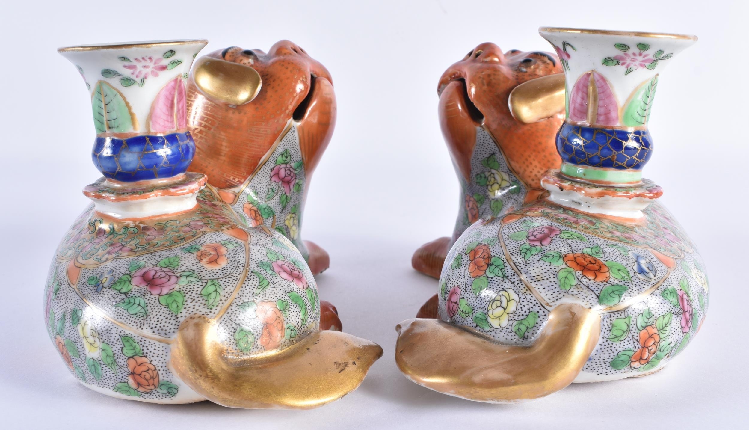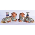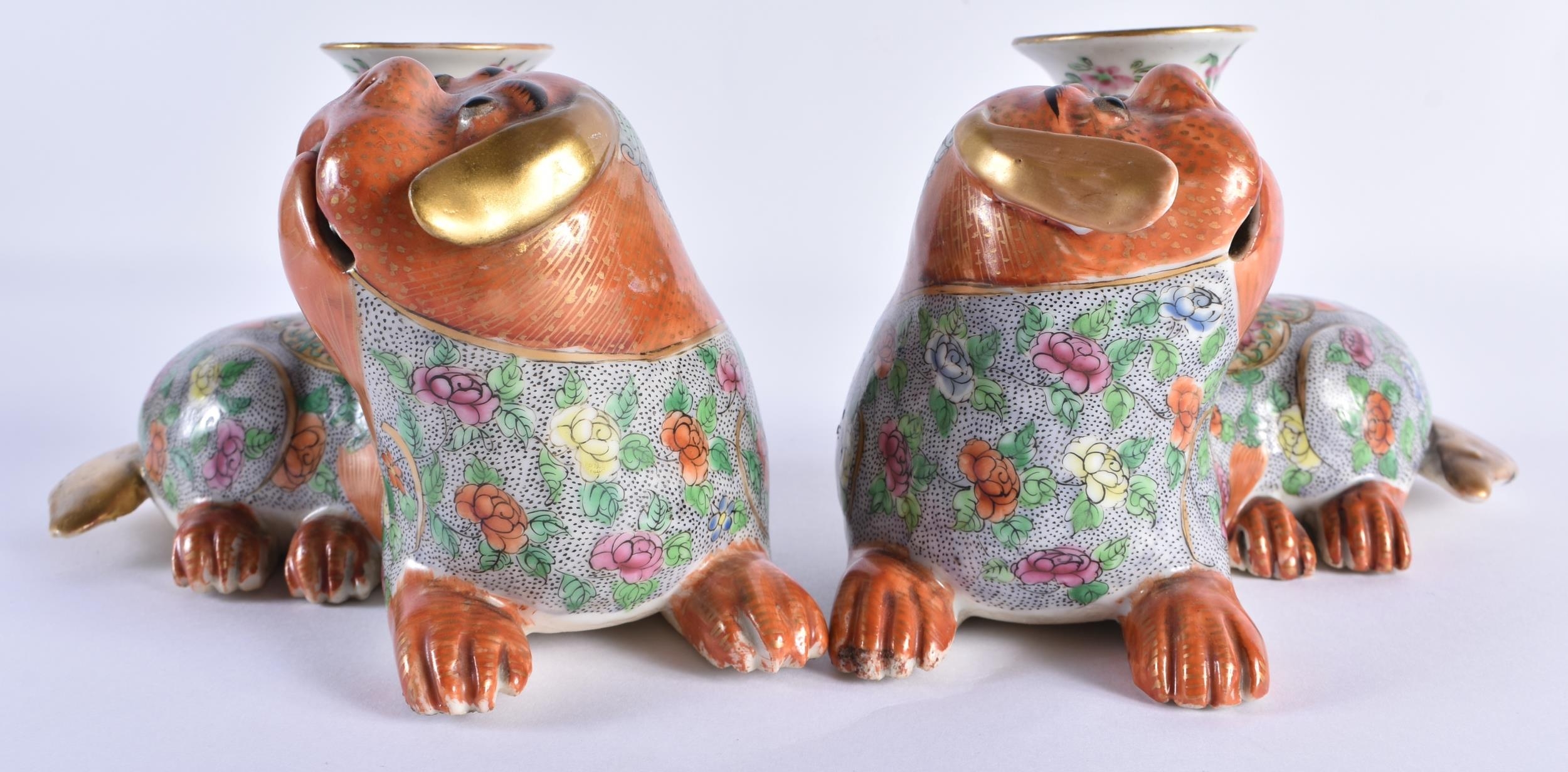 A PAIR OF EARLY 19TH CENTURY CHINESE CANTON FAMILLE ROSE JOSS STICK HOLDERS Qing, modelled as coral painted recumbent dogs. 18 cm x 12 cm. Note: Famille rose is a type of Chinese porcelain introduced in the 18th century and defined by pink overglaze enamel. It is a Western classification for Qing dynasty porcelain known in Chinese by various terms: fencai, ruancai, yangcai, and falangcai.