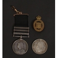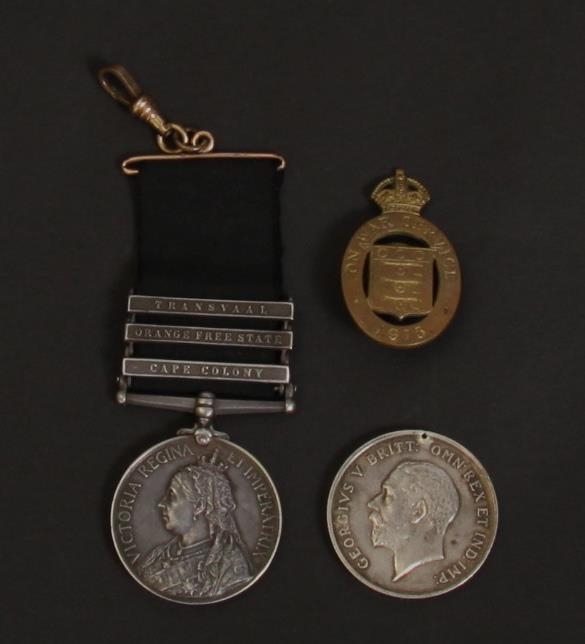 Medals, Boer War, Queen's South Africa, Three bars, Transvaal, Orange Free State, Cape Colony, 3015 PTE W. COOK 1 LEIC: REGT, mounted with black ribbon, gold coloured bar, worn by widow, family tradition says Killed in Action, not confirmed; with World War One, BWM, disc only, 40599 PTE W.L. FIELD HAMPS R; On War Service 1915, no.61215 [3]