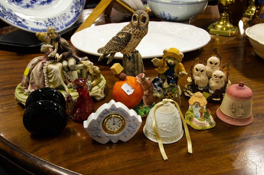 2X PORCELAIN GROUP LADY + GENT FIGURES, BIRD FIGURES, ETC + EMPIRE STYLE TABLE LAMP AF
