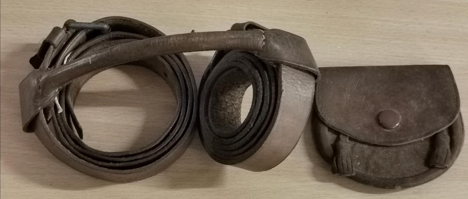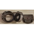 2 x vintage leather belts in holder and vintage leather pouch purse