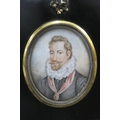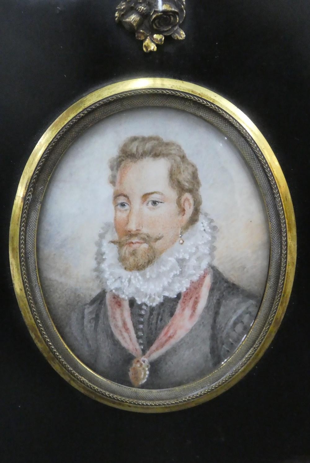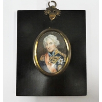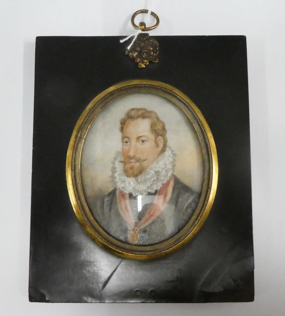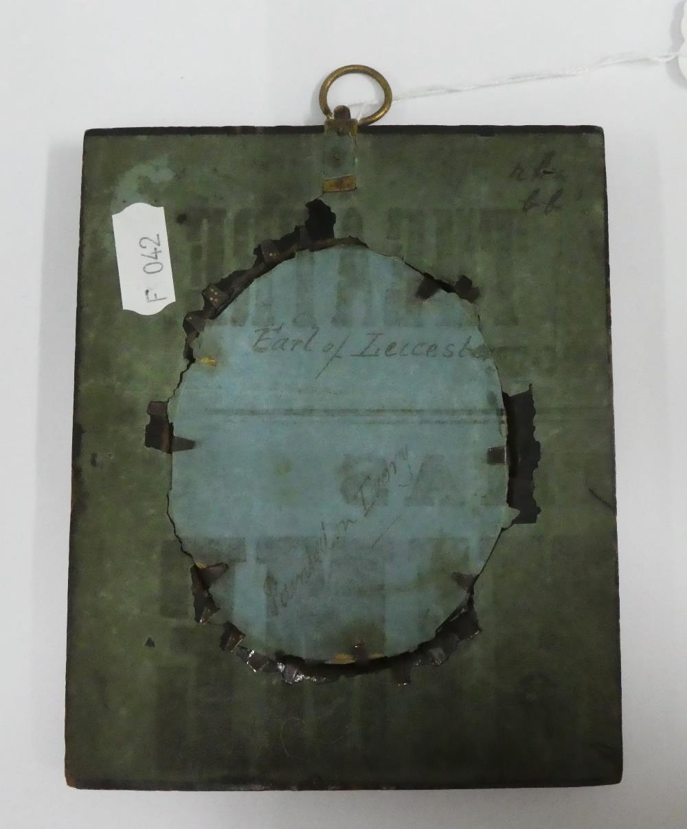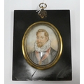 19th century portrait miniature on ivory of the Earl of Leicester, contained within a glazed and ebonised frame with a rose and thistle suspension loop, miniature size is approx 7 x 9cm