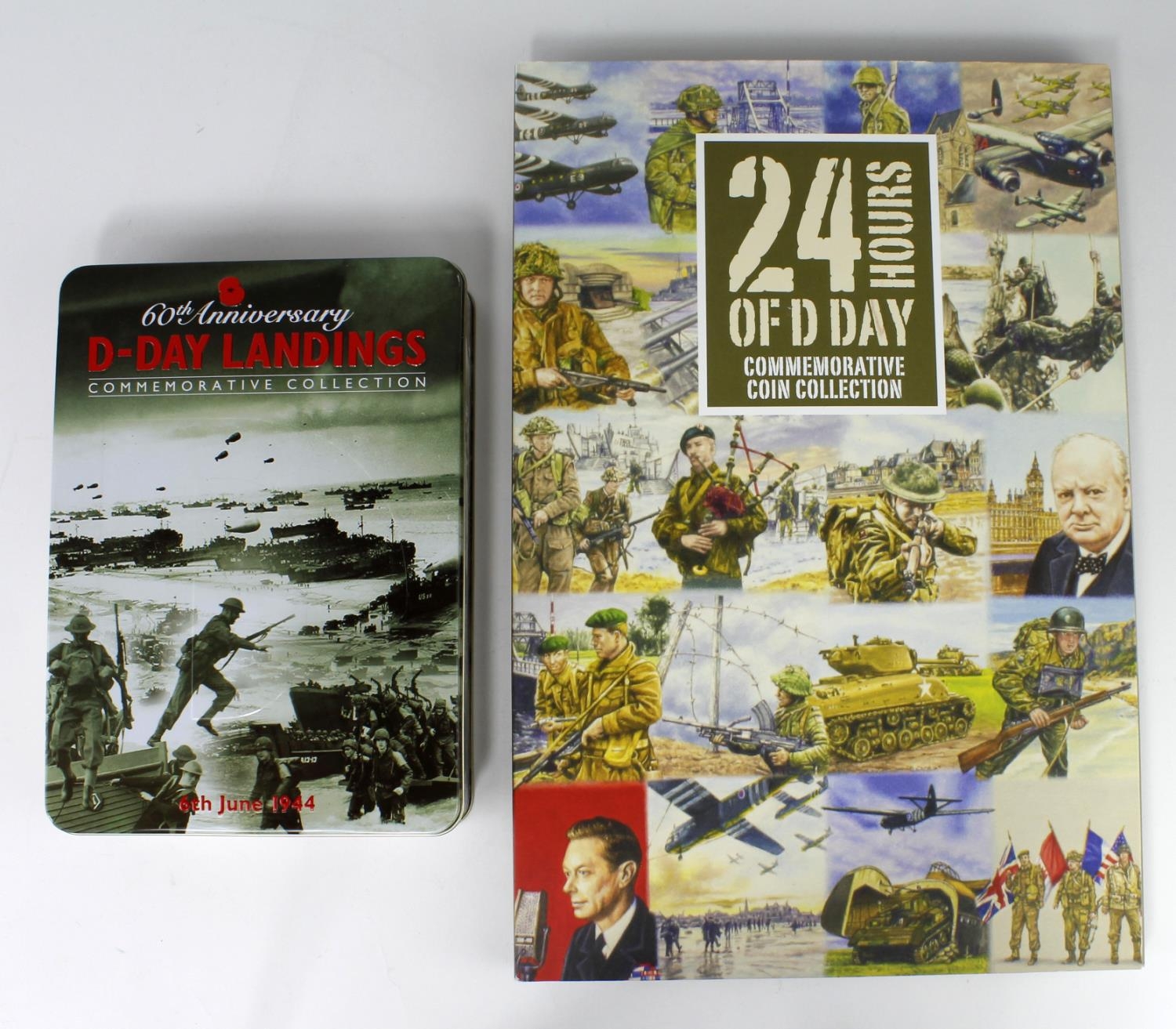 Channel Islands: Silver proofs (3) and base proofs (6), comprising the 60th Anniv. D-Day Landings set by the Royal Mint aFDC in original tin with all bits and pieces, plus a Westminster folder '24 Hours of D-Day' containing the other various crowns in capsules.