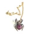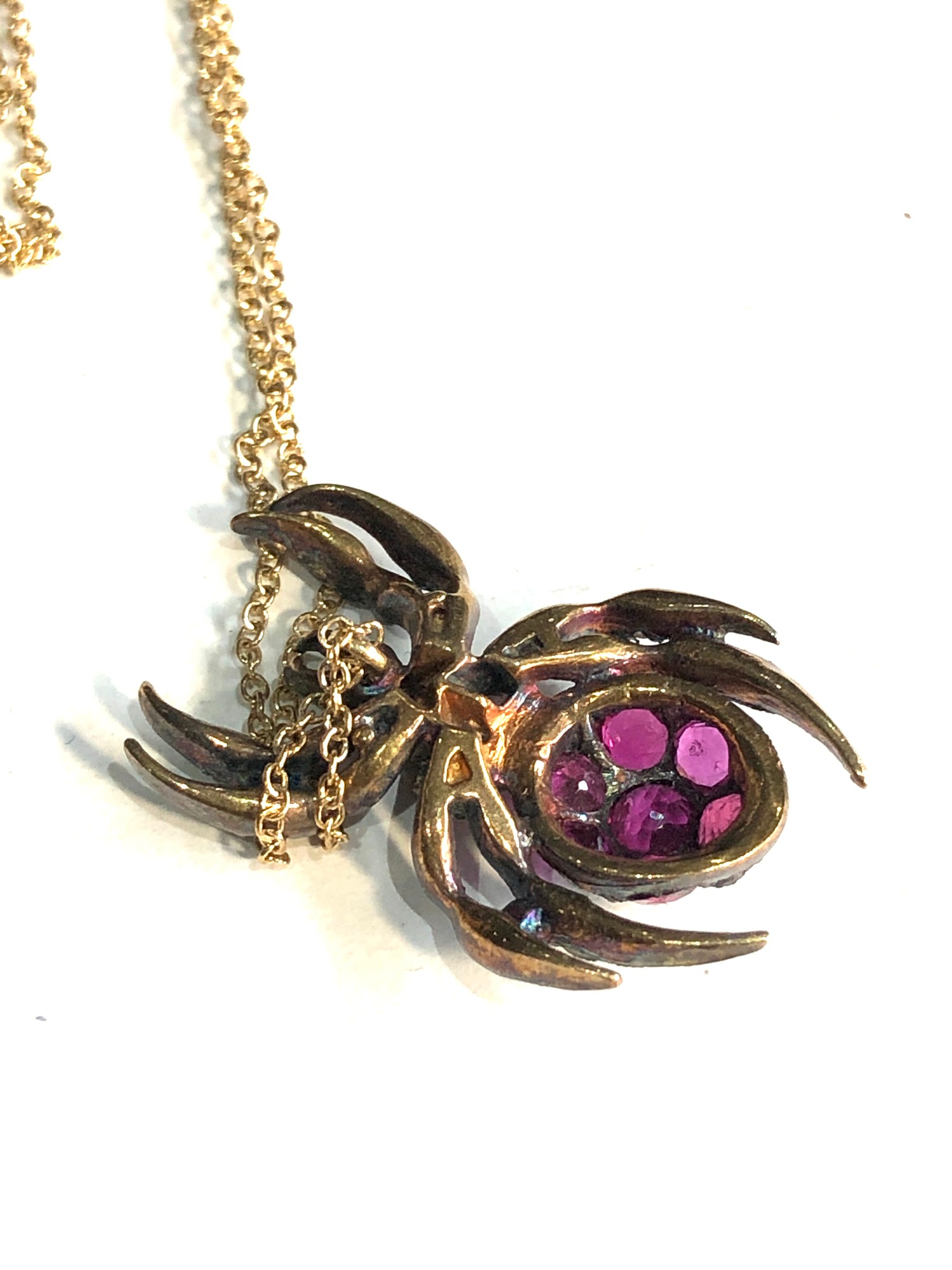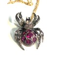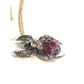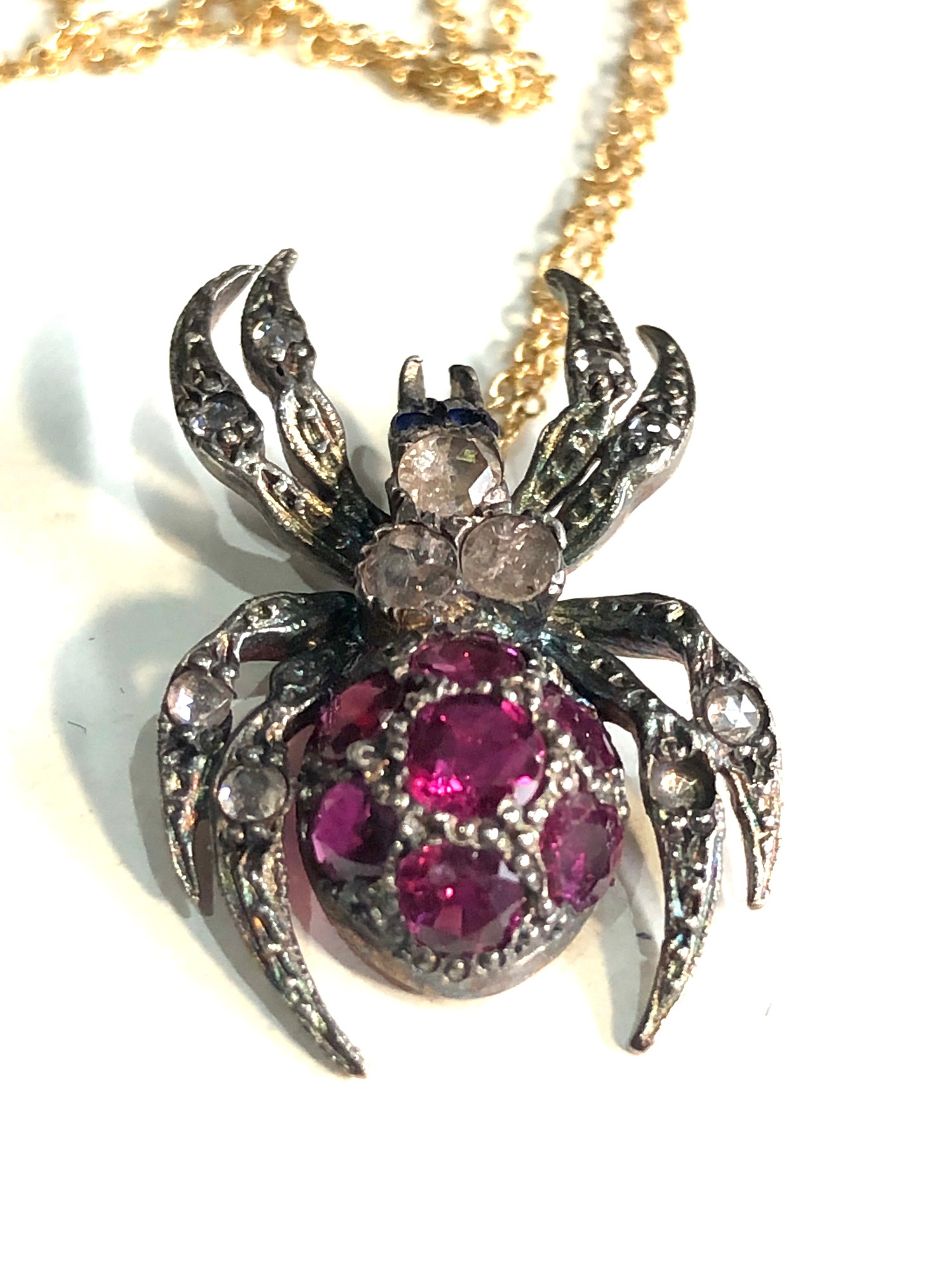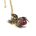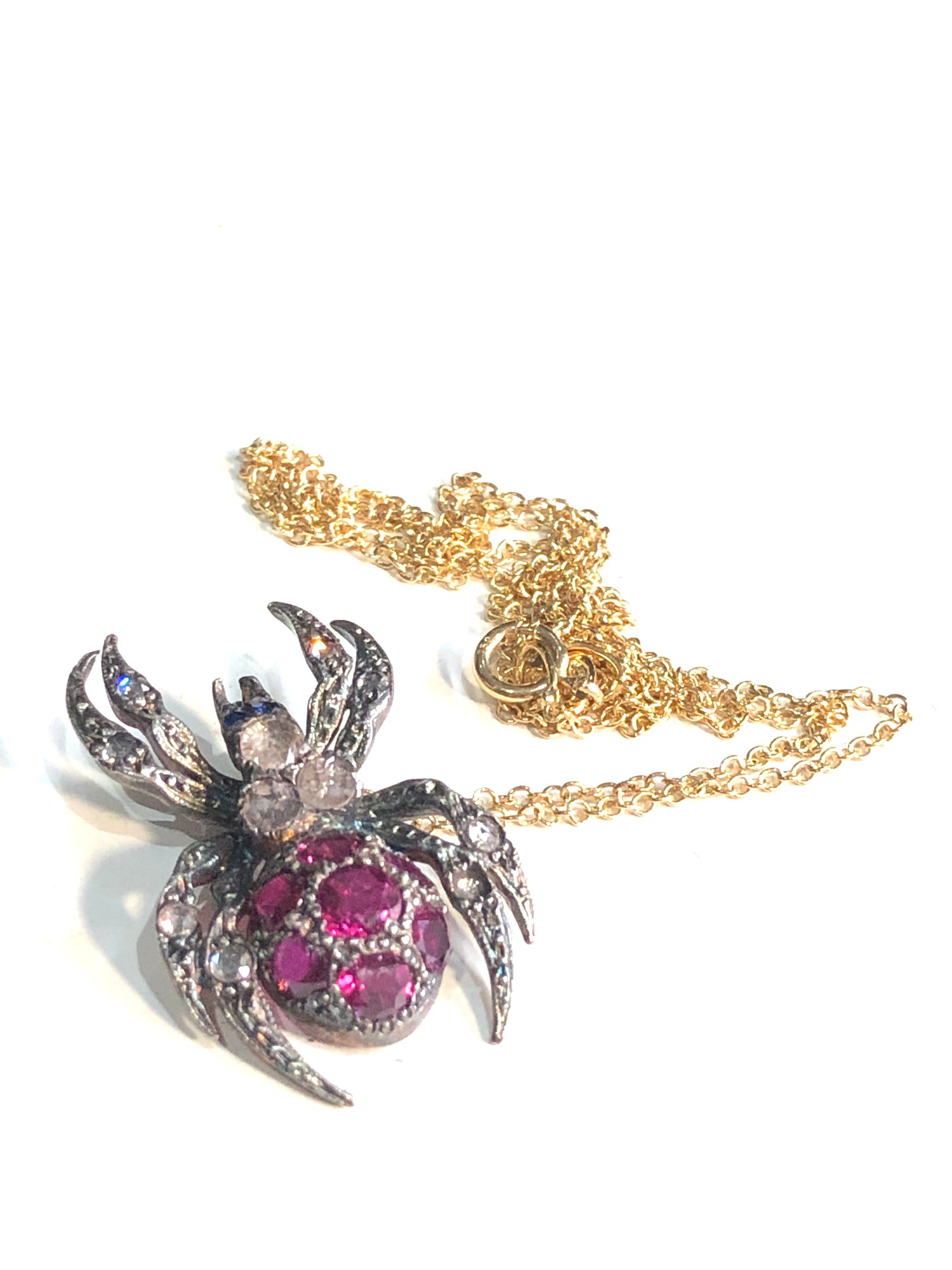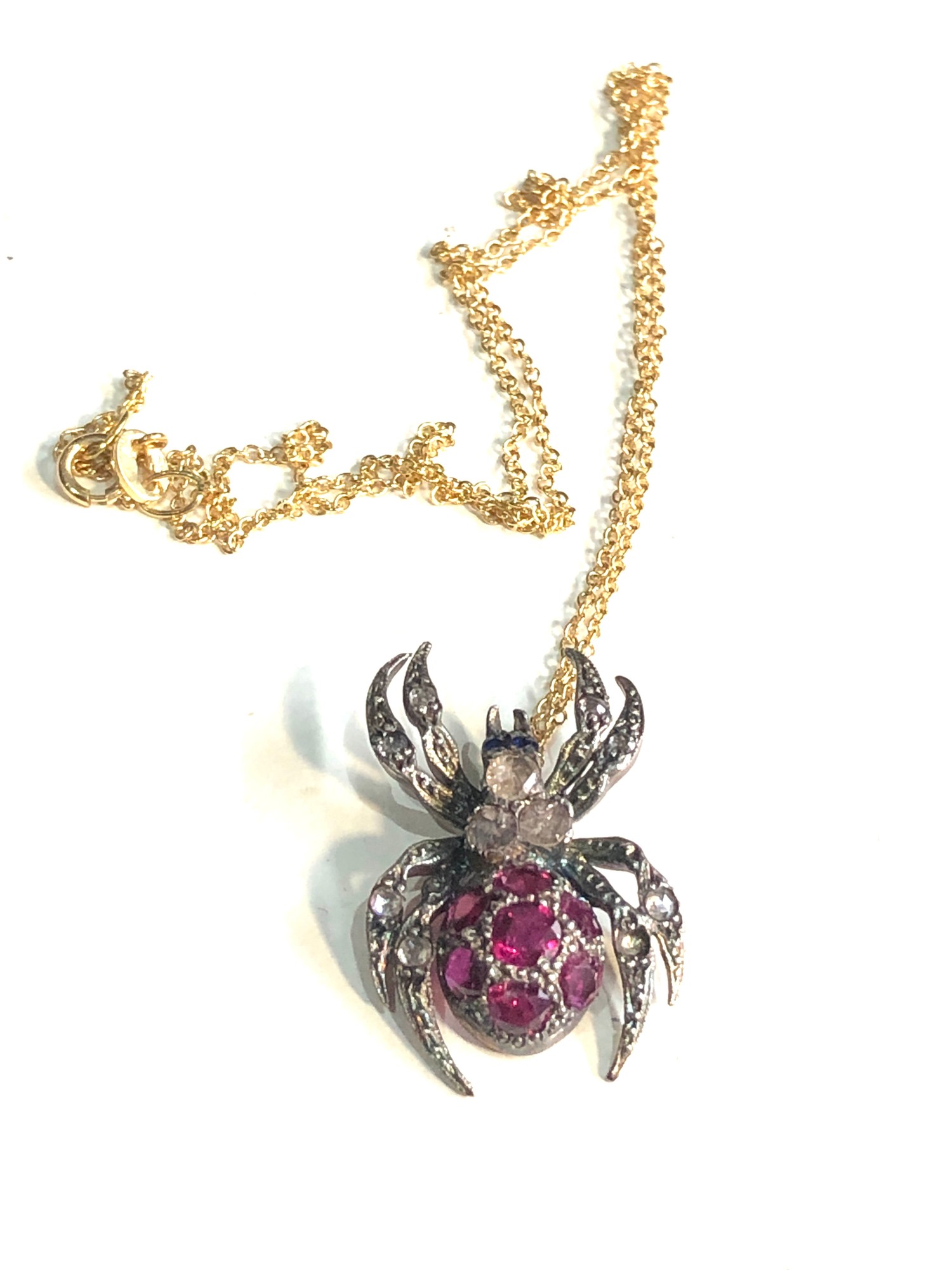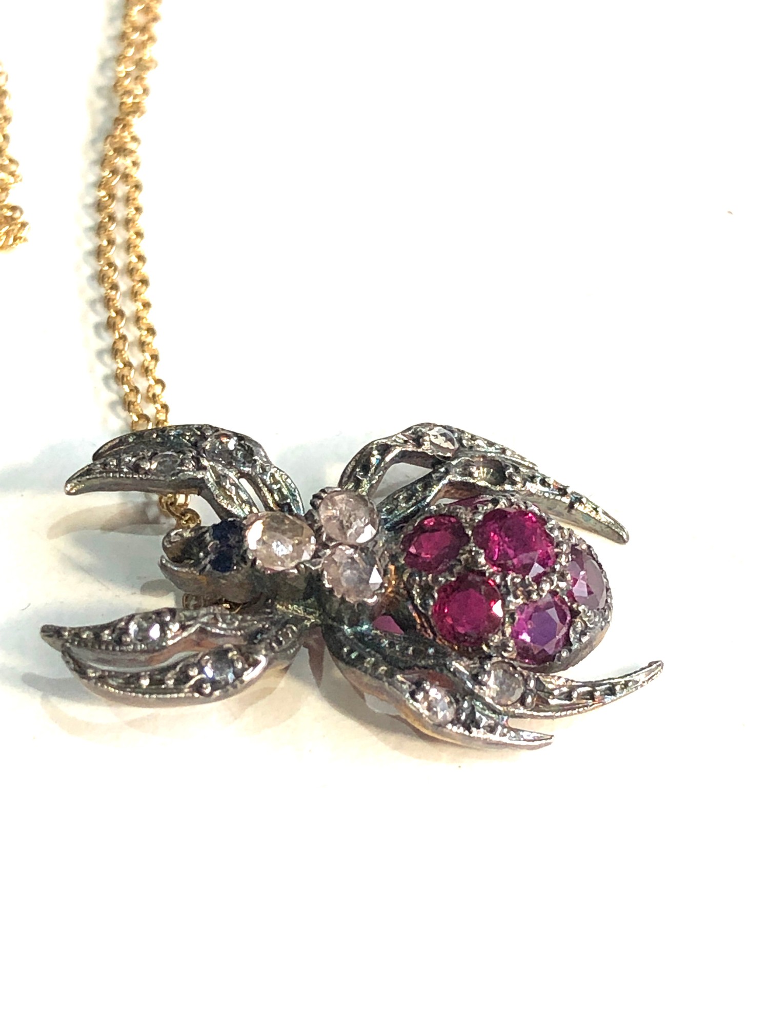 Fine rose diamond & ruby spider pendant on 18ct gold chain pendant gold back silver front measures approx 2.5cm by 1.5cm