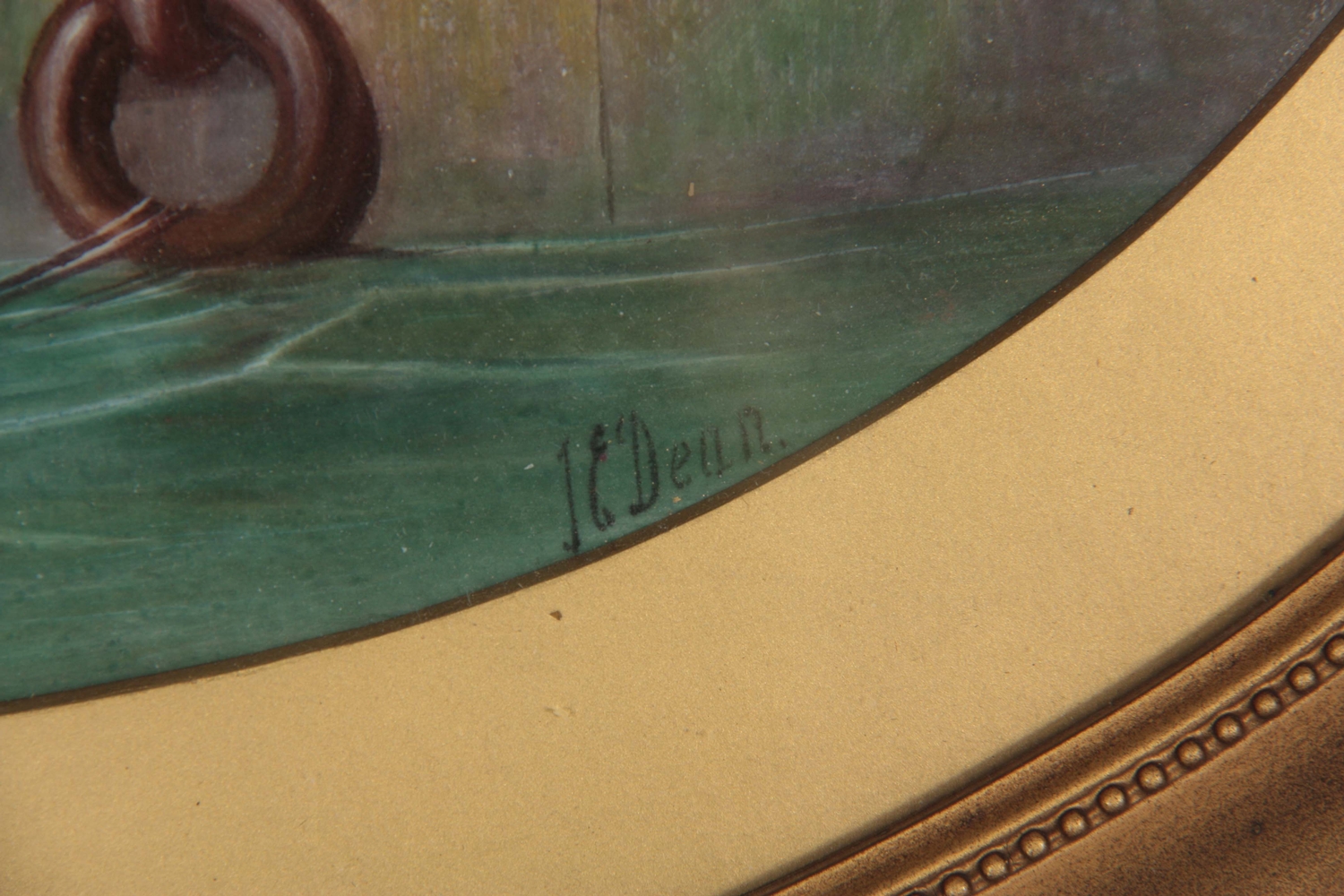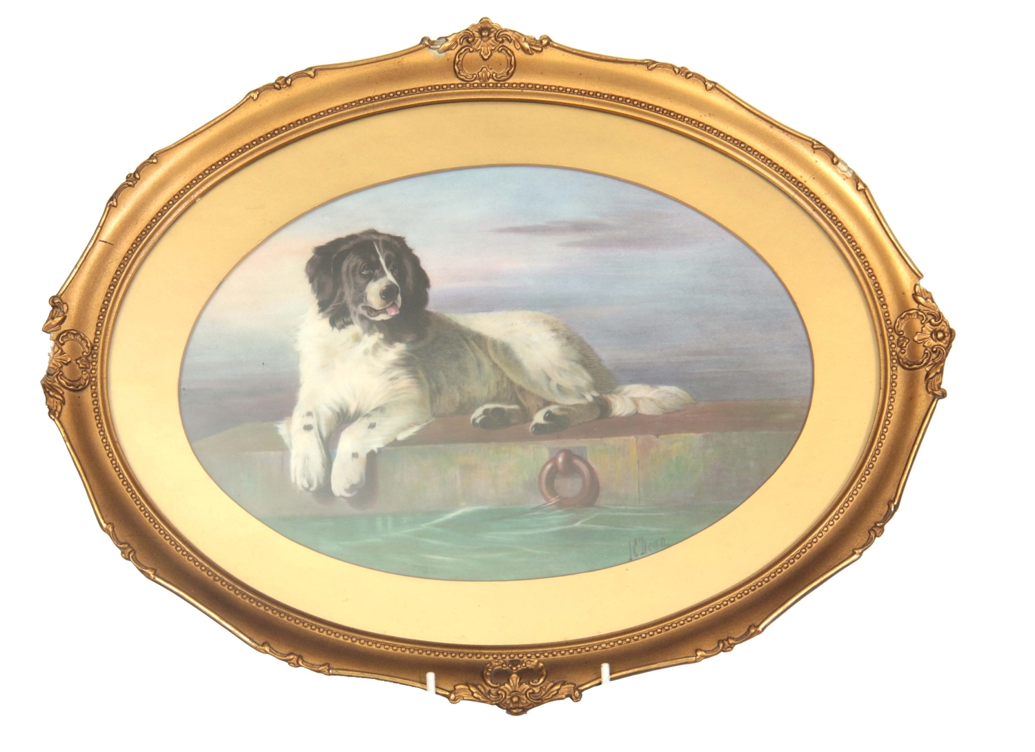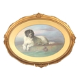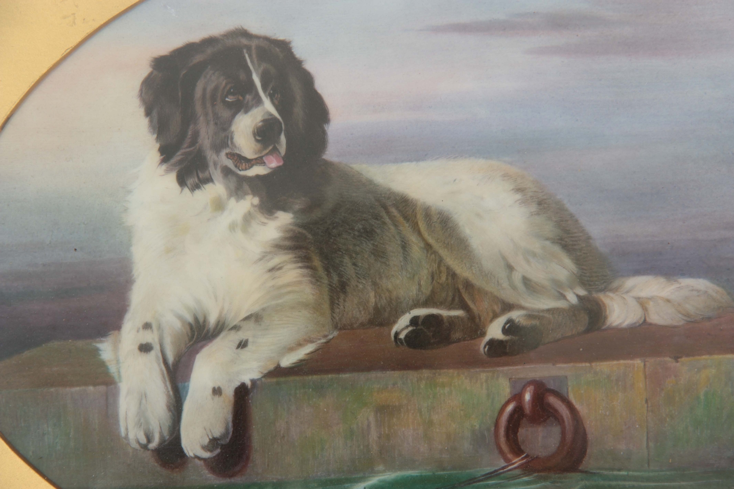 J.E.DEAN, A 19th CENTURY DERBY OVAL PORCELAIN PLAQUE DEPICTING A ST.BERNARD DOG after a painting by Sir Edwin Landseer - mounted in a glazed swept frame with gilt slip, the plaque 22cm high 32cm wide, 37cm high 46cm overall.