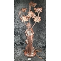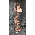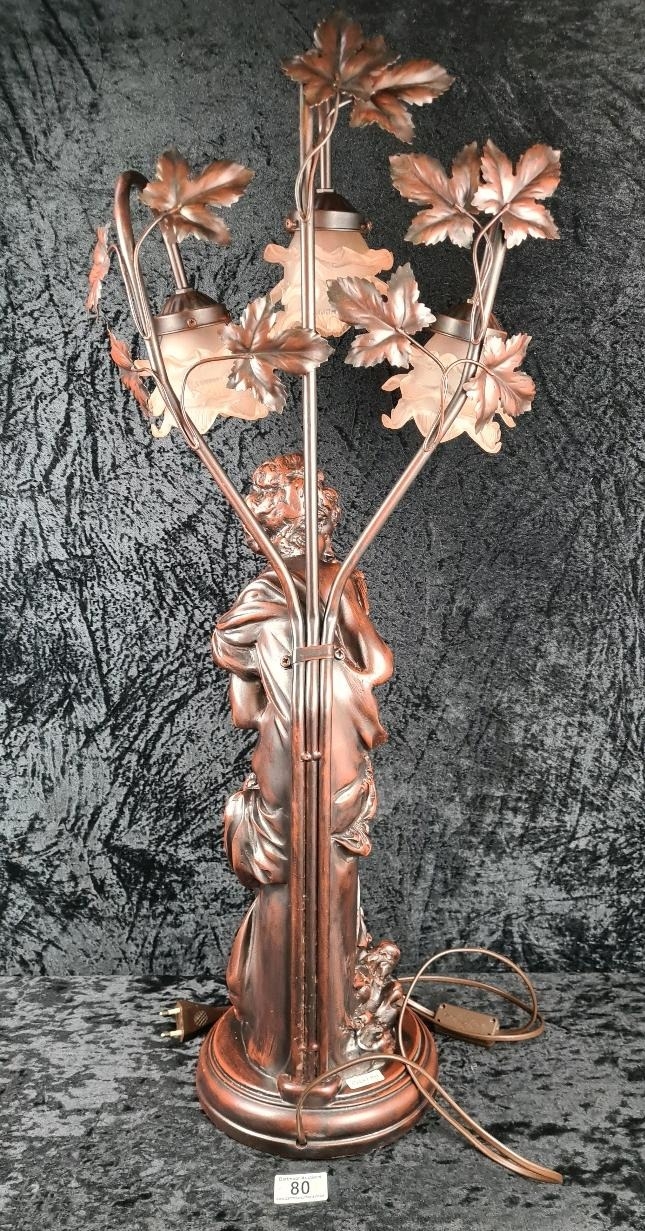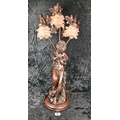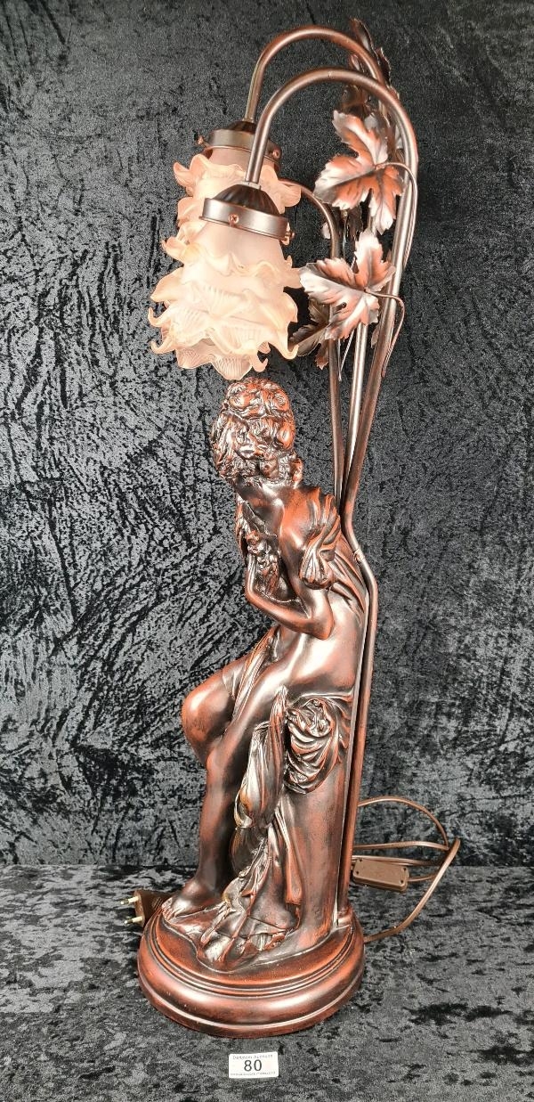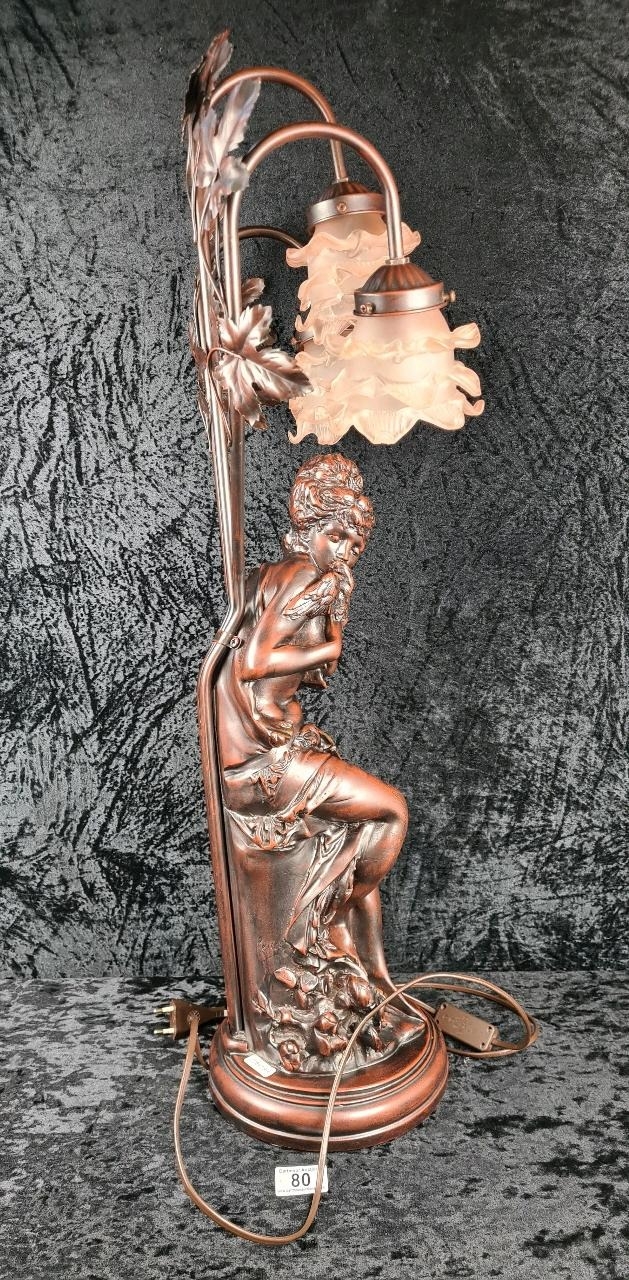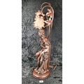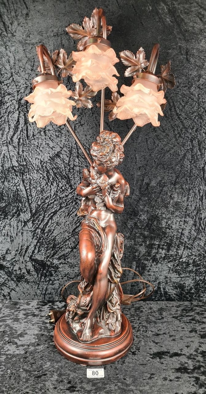 Tall Art Nouveau-style resin lamp featuring a woman holding two birds, with three lights and pale pink glass floral shades. Approx H80cm.