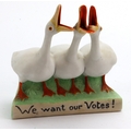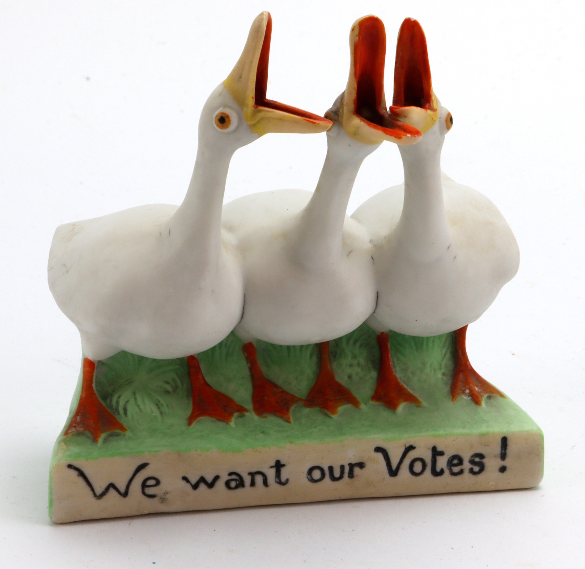 Suffragette interest: China Spill Holder, decorated with three geese and reading "We want our Votes!", bears a continental mark on the base, either German or Austrian made