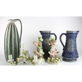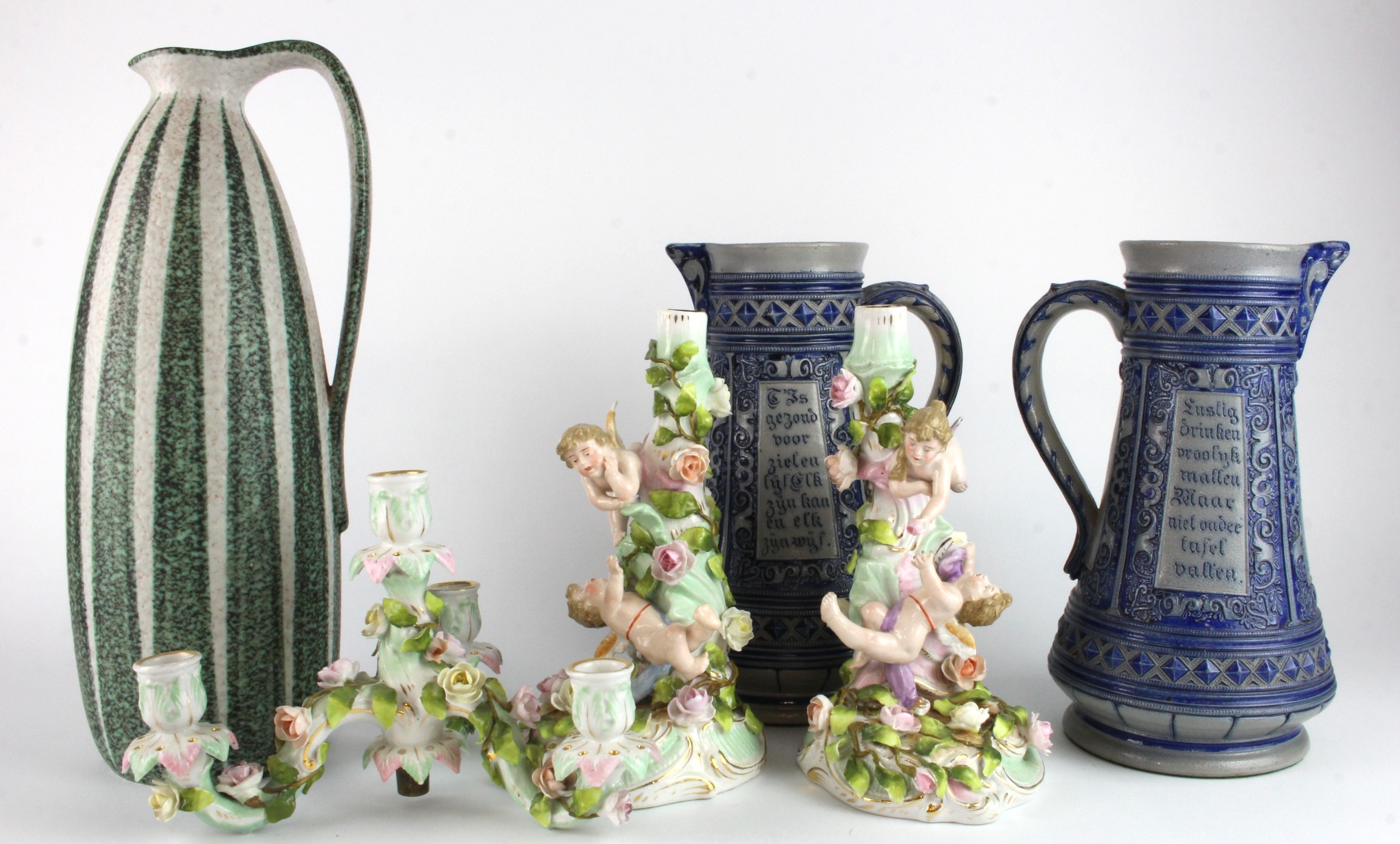 Ceramics. A group of various ceramics & poreclain, including an ornate three arm candelabra, decorated with cherubs and flowers, height 37.5cm; a large stone jug by Ruscha, height 38cm; two matching german stoneware jugs, height 28cm approx.