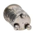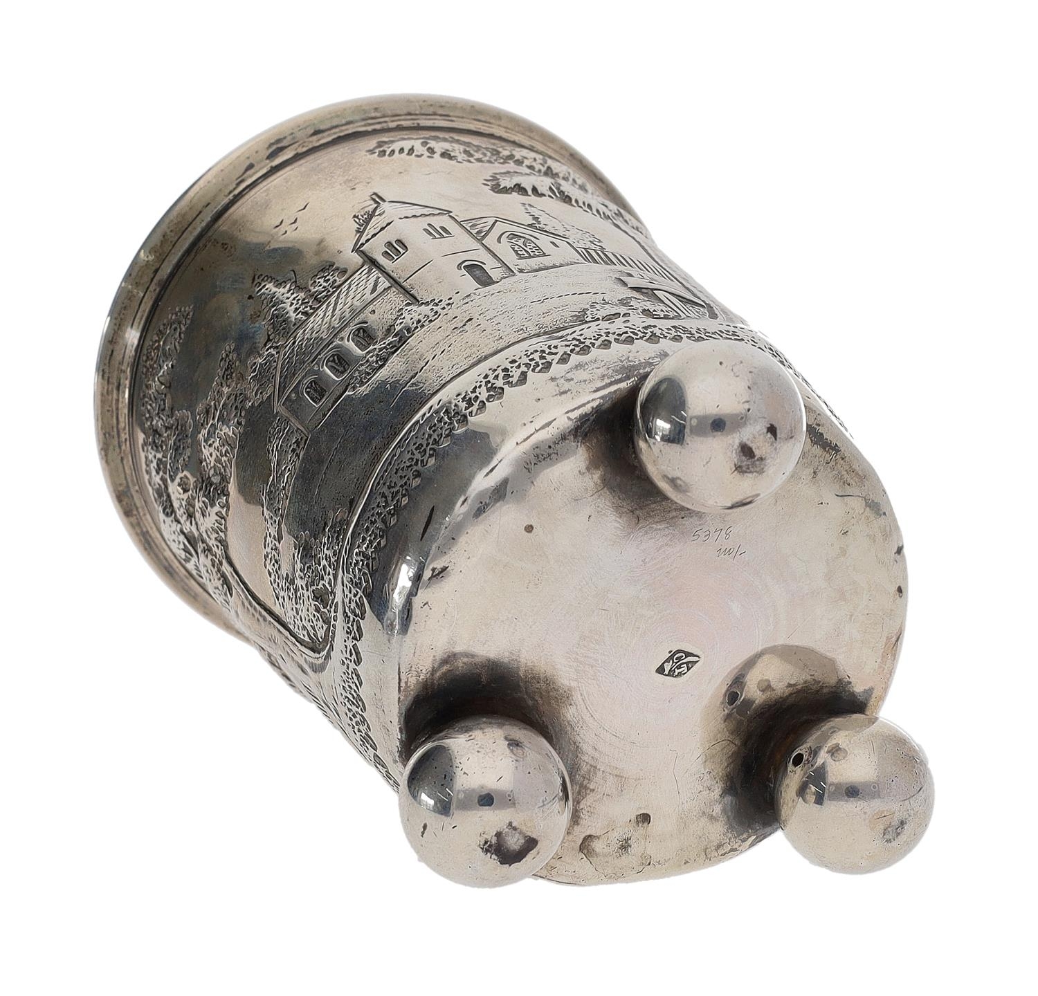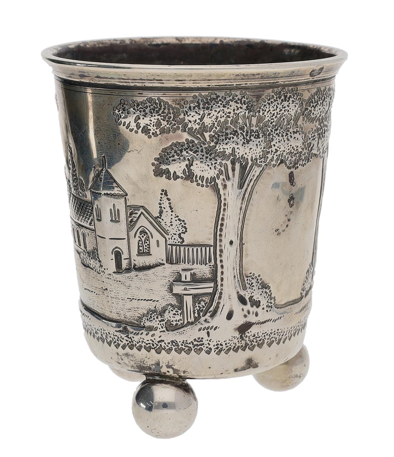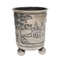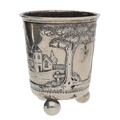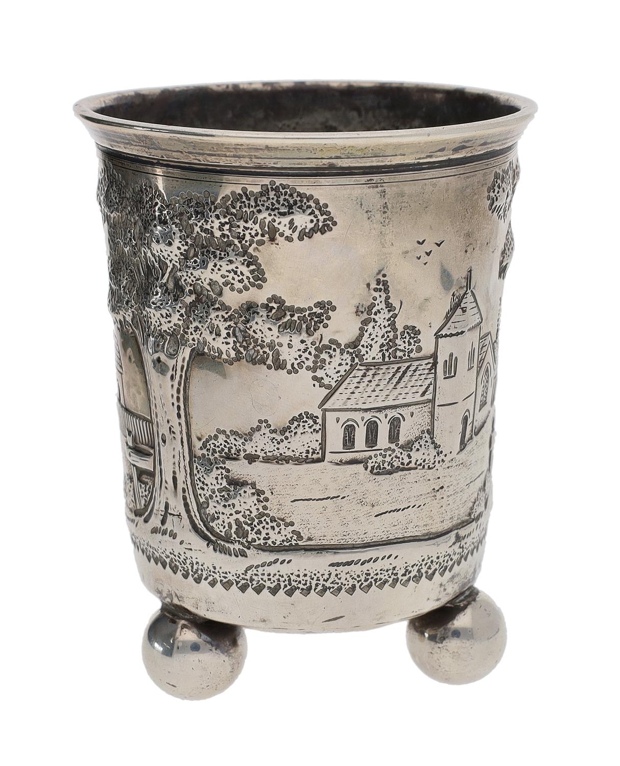19th century continental white metal beaker, worked in relief with a building and church among trees, on three ball feet, marked to underside CT in a lozenge, 3.5" high, 67gm