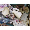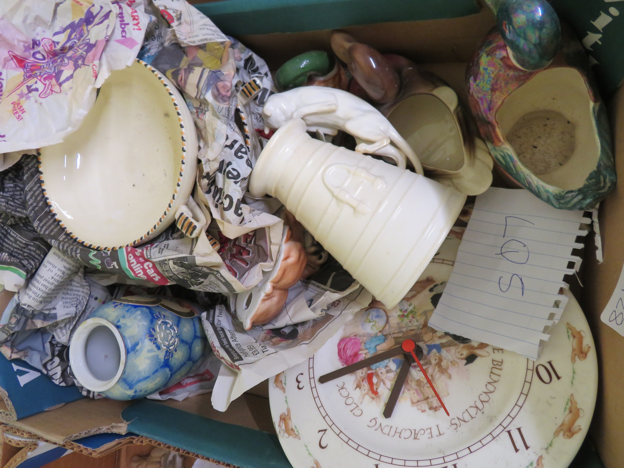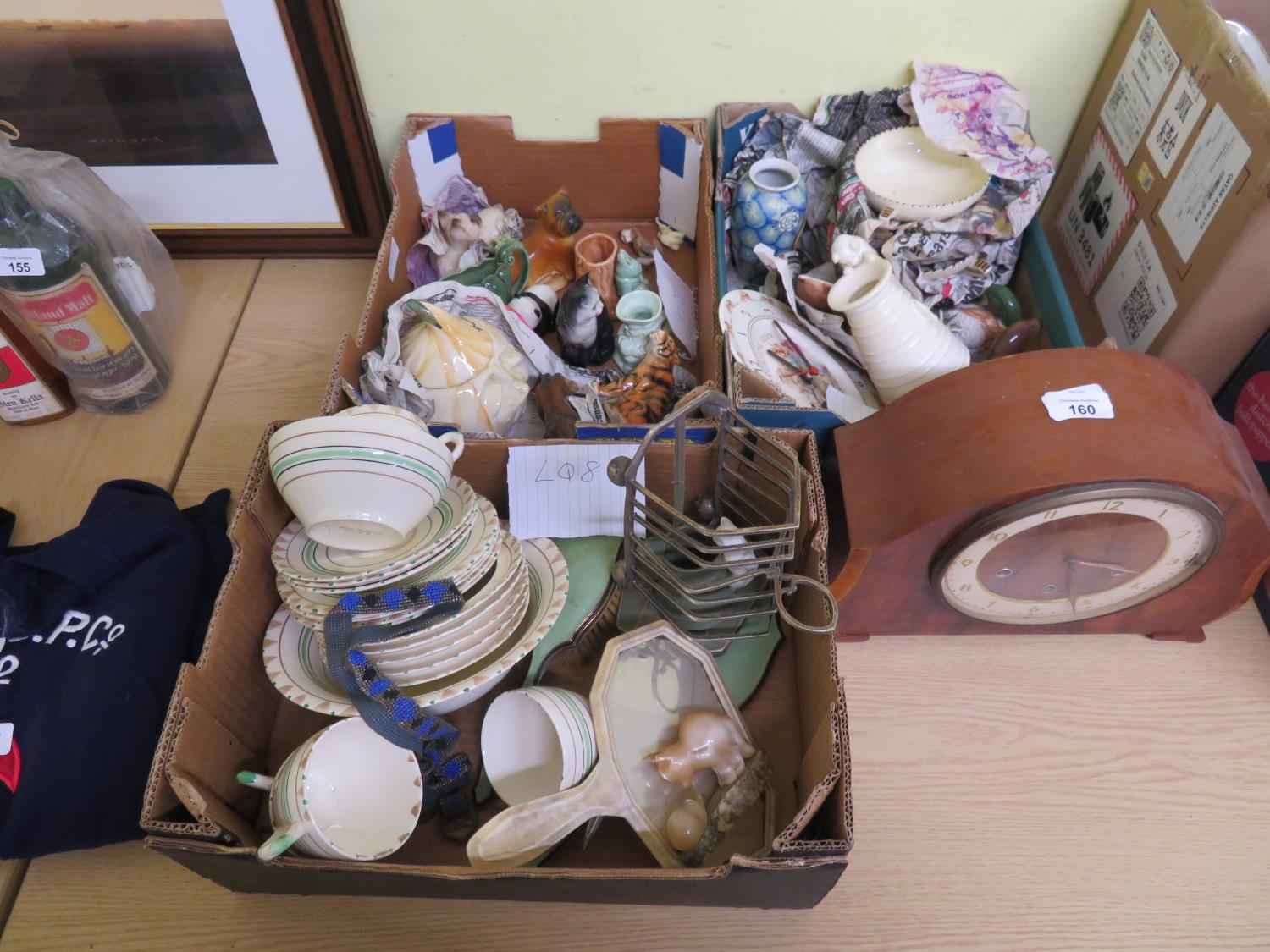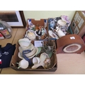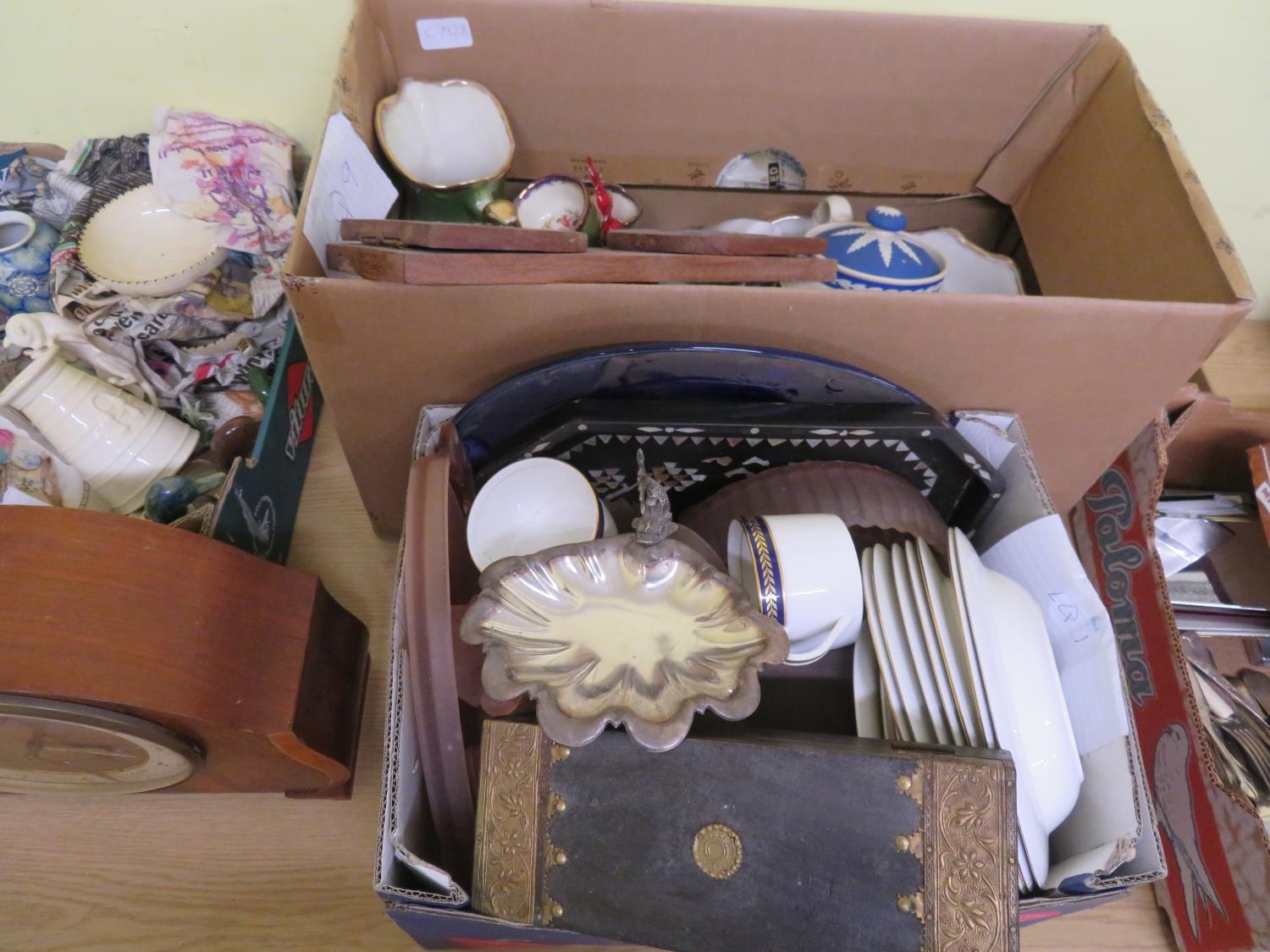 Five boxes of crockery, ornaments, knick knacks, trinket boxes plus a mantel clock