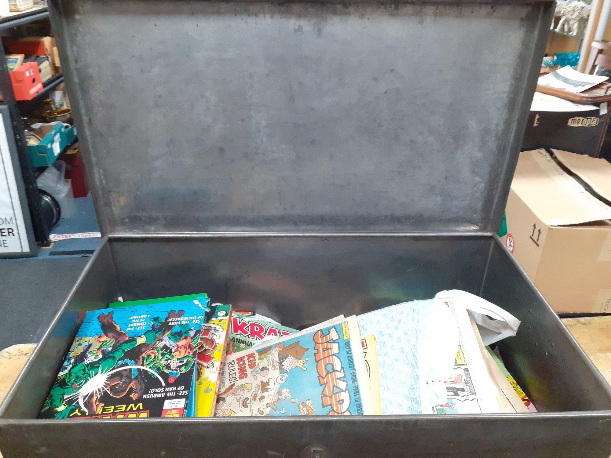 A large tin trunk, (excl contents) measures 77x45x41cm