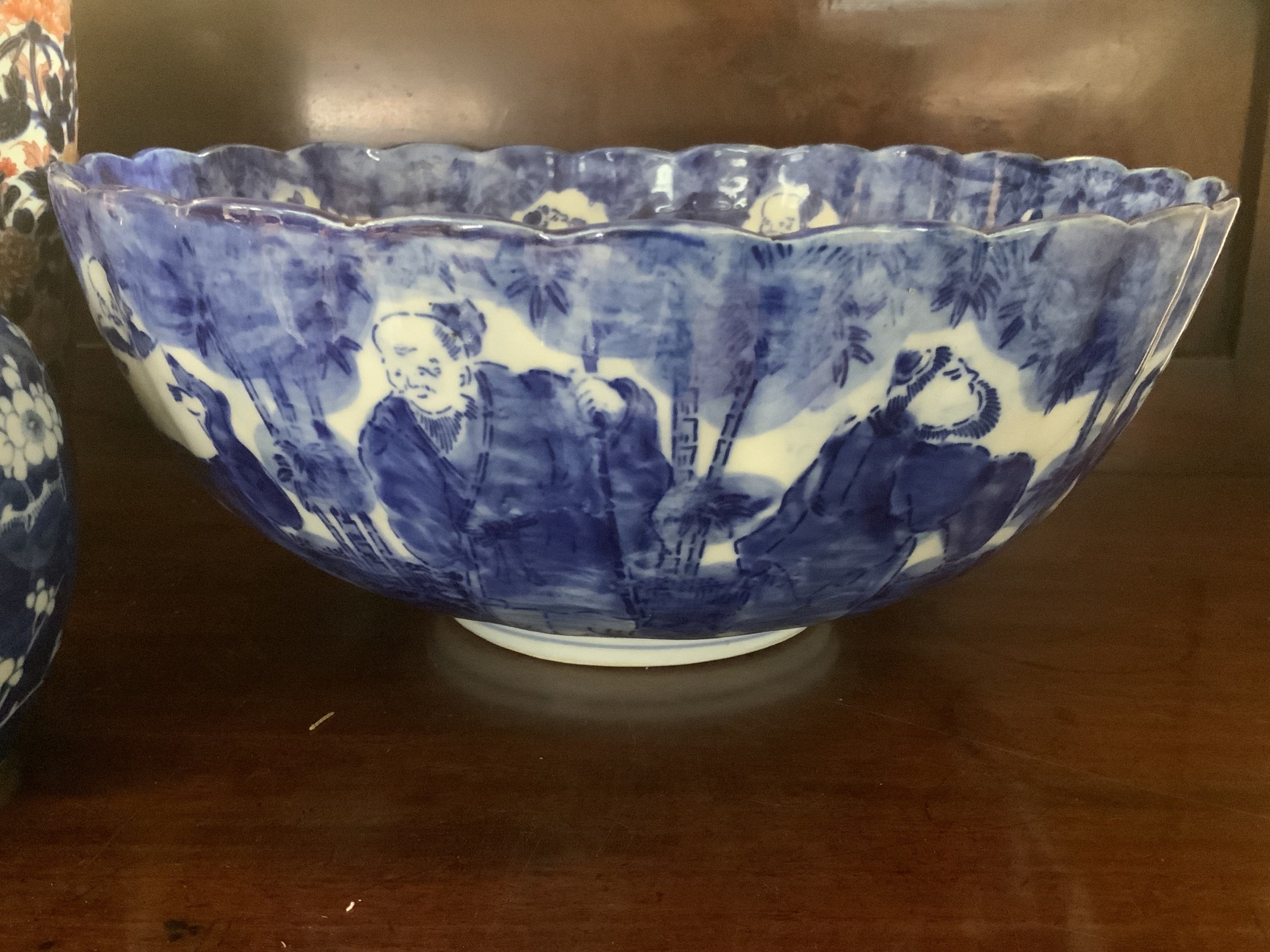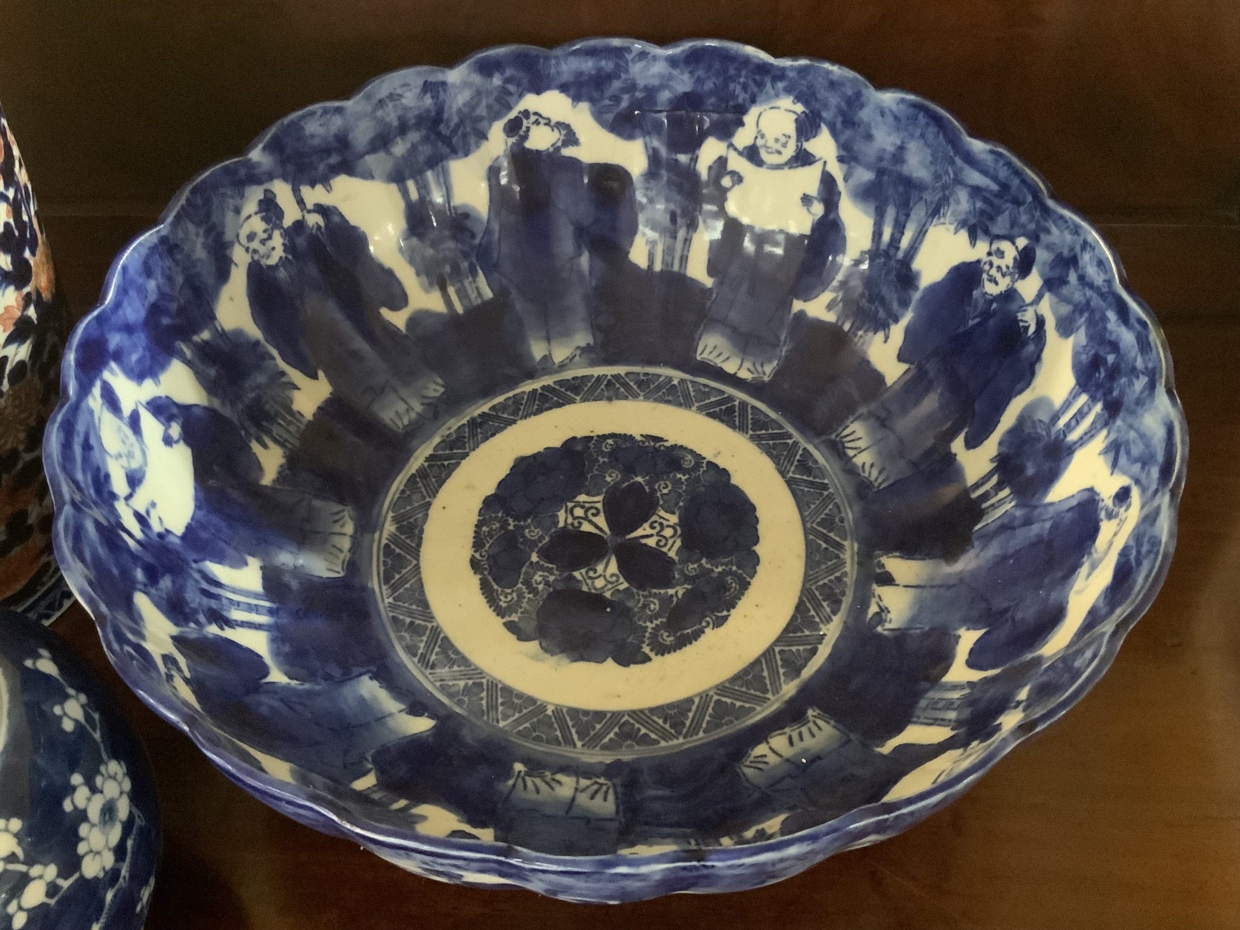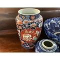 A 19thC Imari vase, Largew blue and white scalloped bowl, small ginger jar. (D)- NO RESERVE