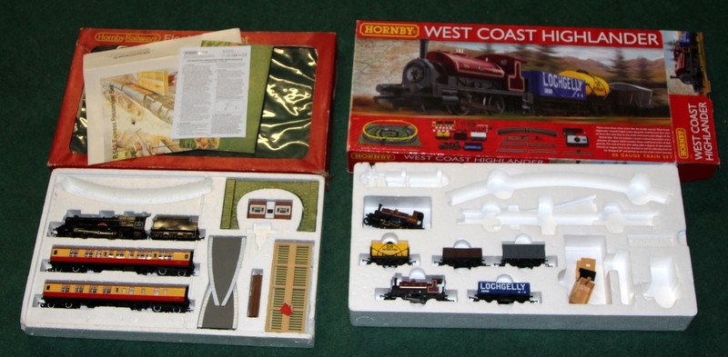 Hornby OO gauge train sets R1157 West Coast Highlander, Loco and rolling stock only, no track or controller, boxed c/w R543 Express Passenger Set, appears complete apart from track in tatty box