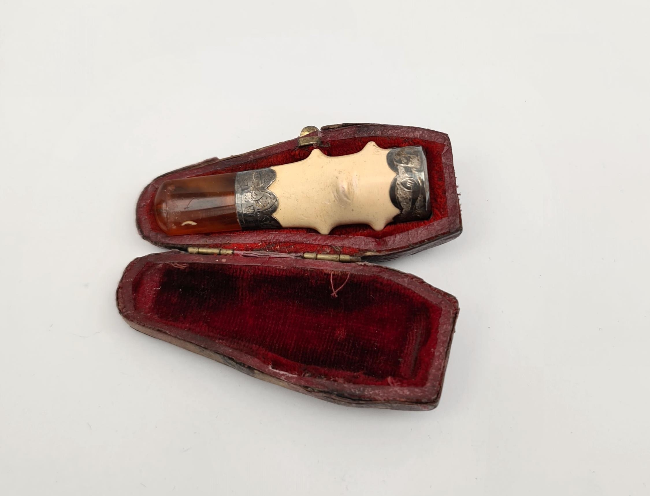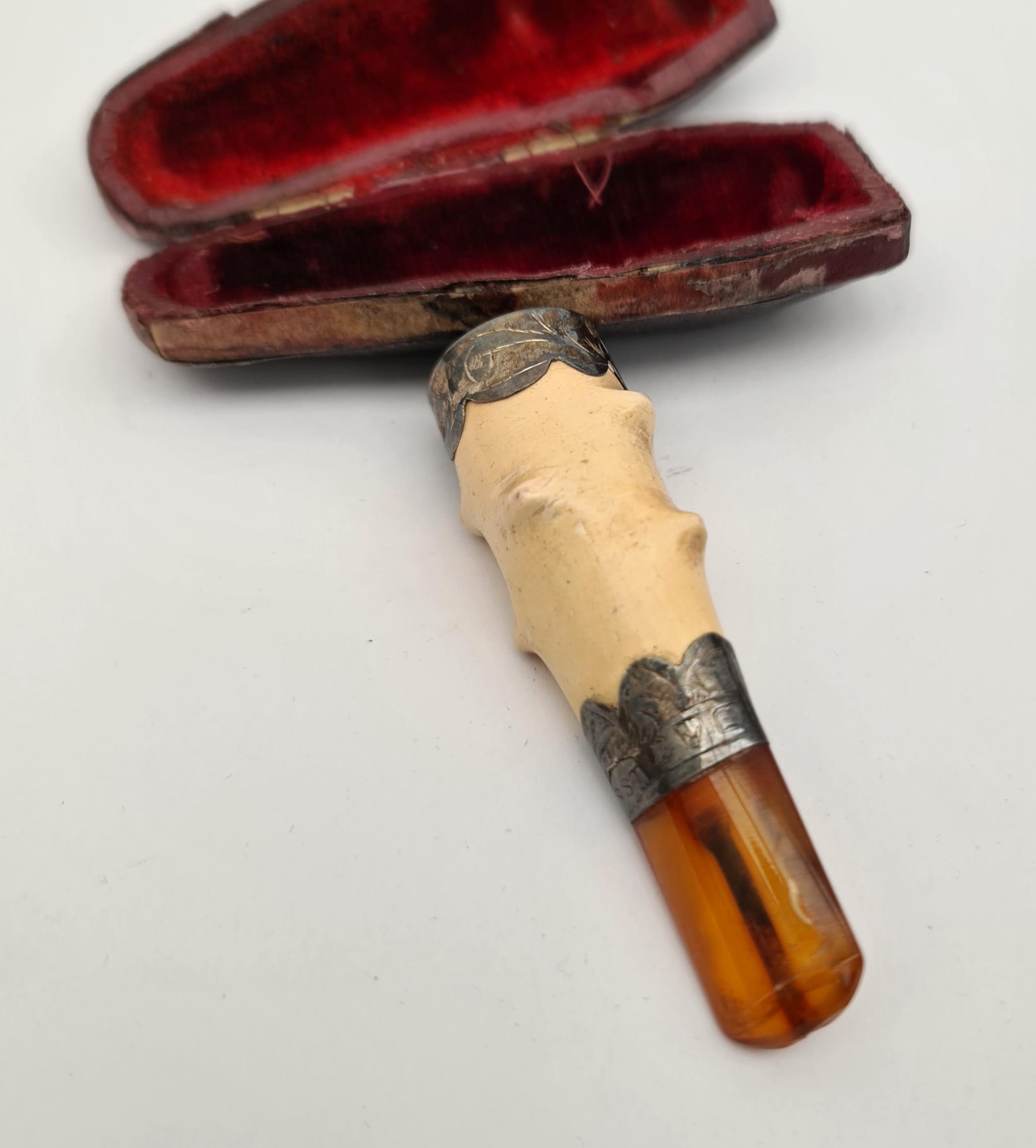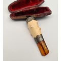Antique Bone Silver and Amber Cased Cheroot. Measures 3 inches long. Shipping is available. Please ask for a quote before bidding. Where possible we combine shipping costs. Remember, if you are the highest bidder above reserve on this Lot you have bought the item and are legally responsible for the item. Viewing is recommended in either person or via video link. Contact us to arrange.
