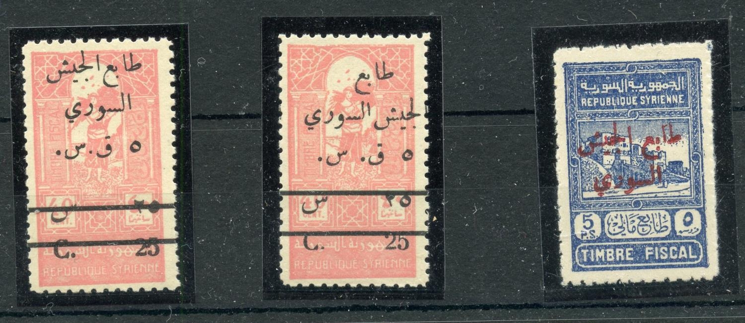 SYRIA OBLIGATORY TAX STAMPS 1945 - 9 5p on 25p on 40p rose types 57 and 59 plus 5p blue type 60 all um. SG T419, 421, 423. Cat £560.