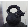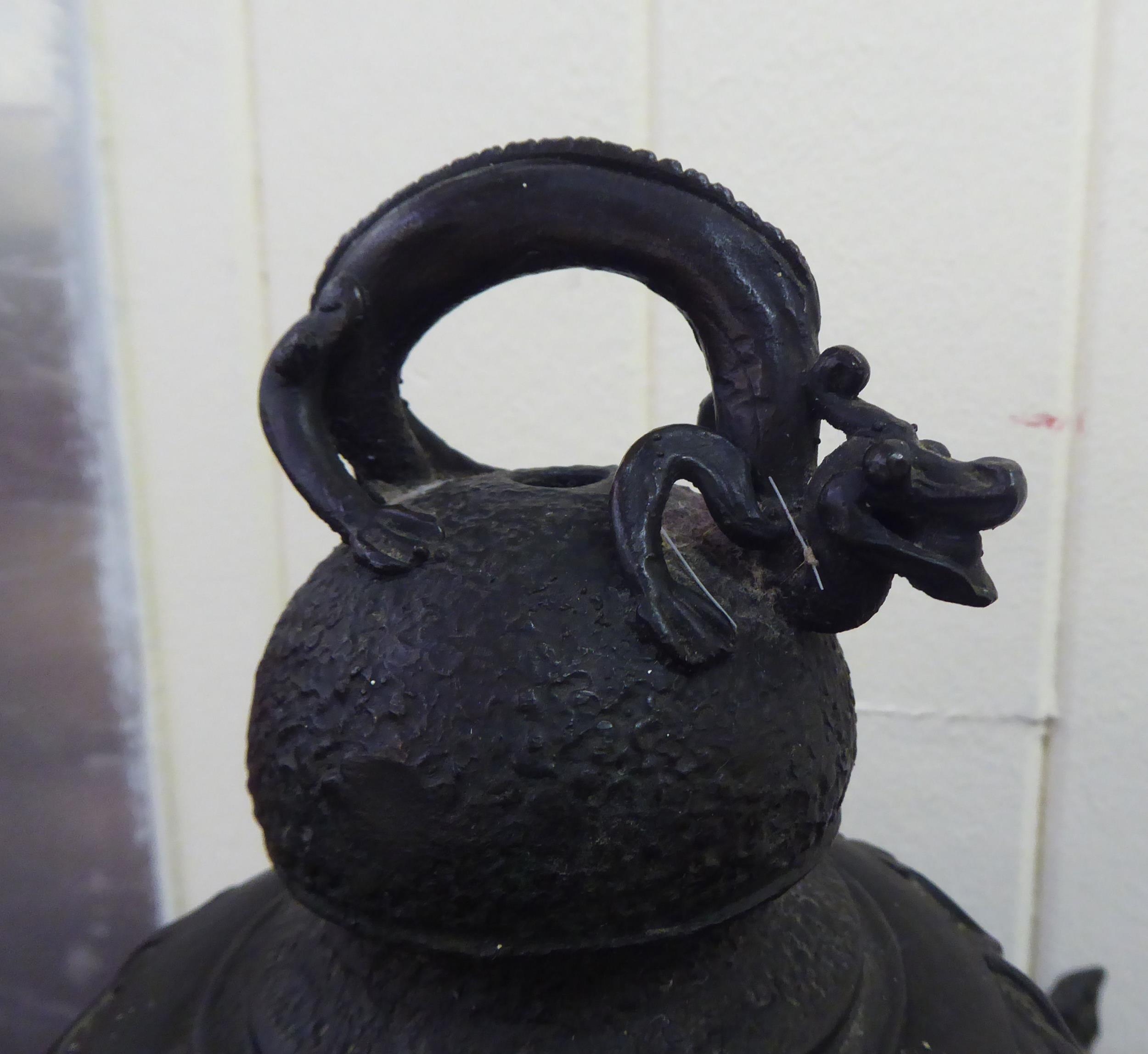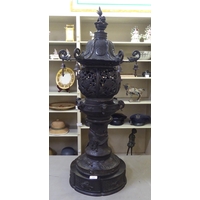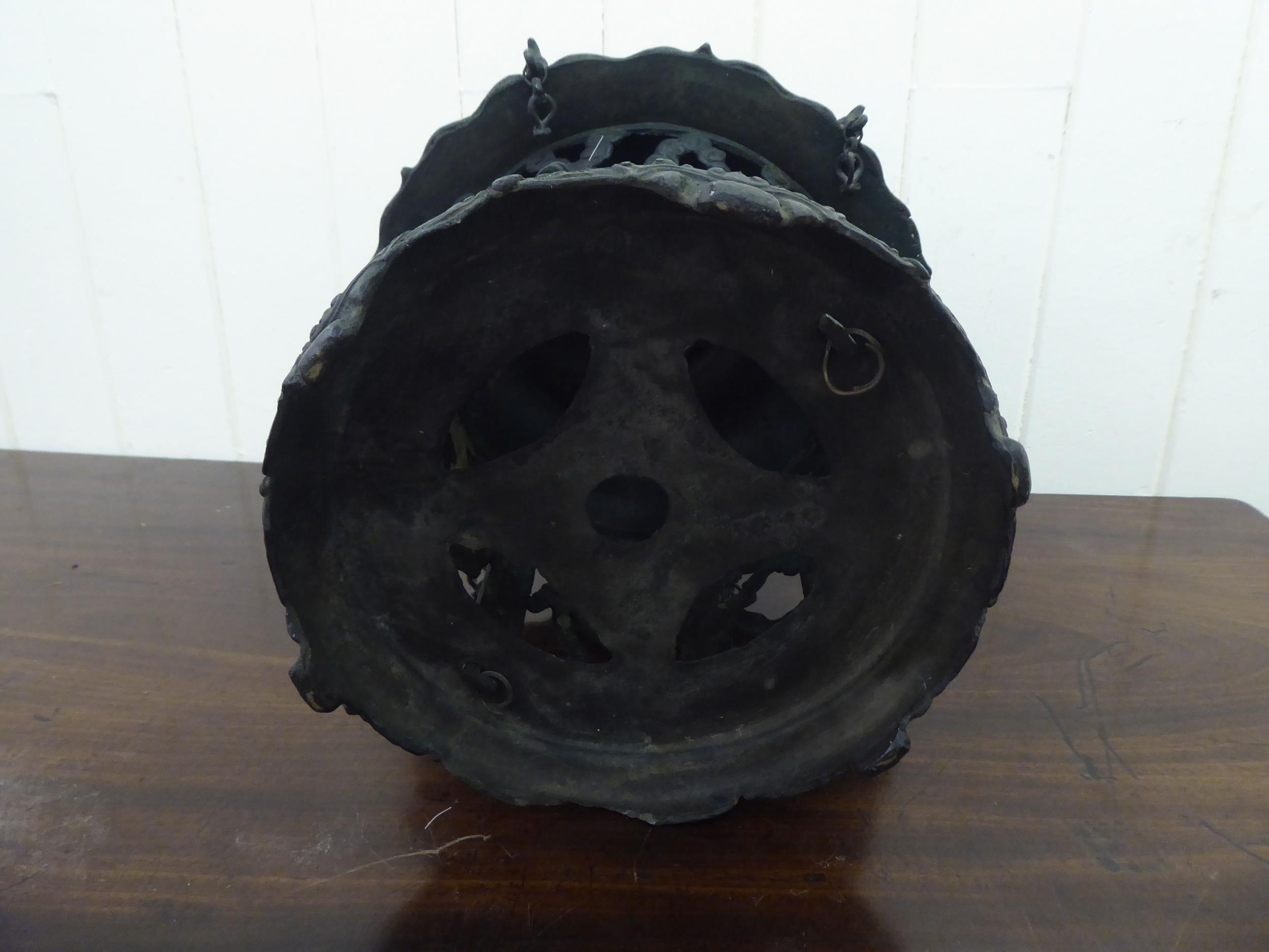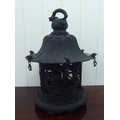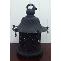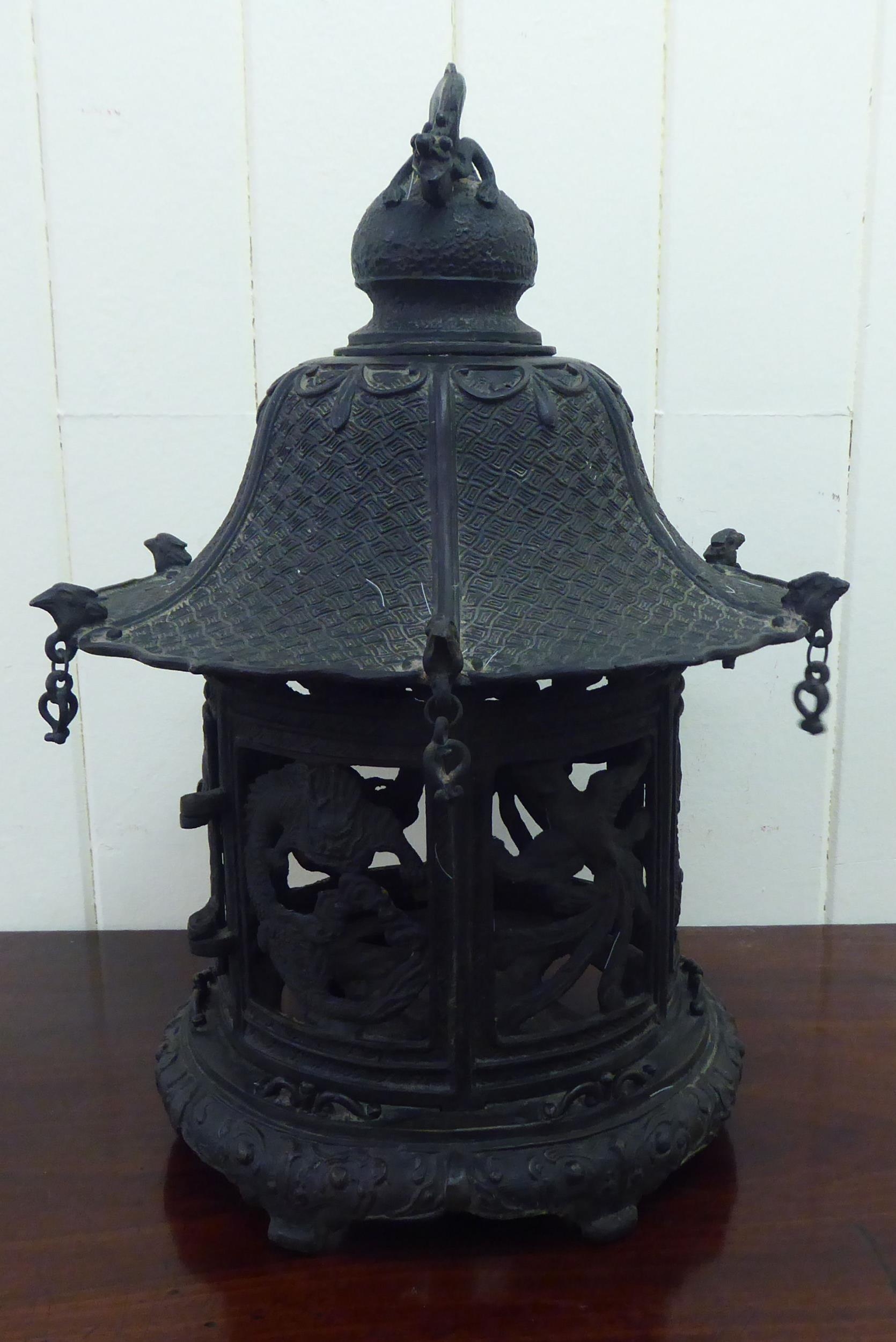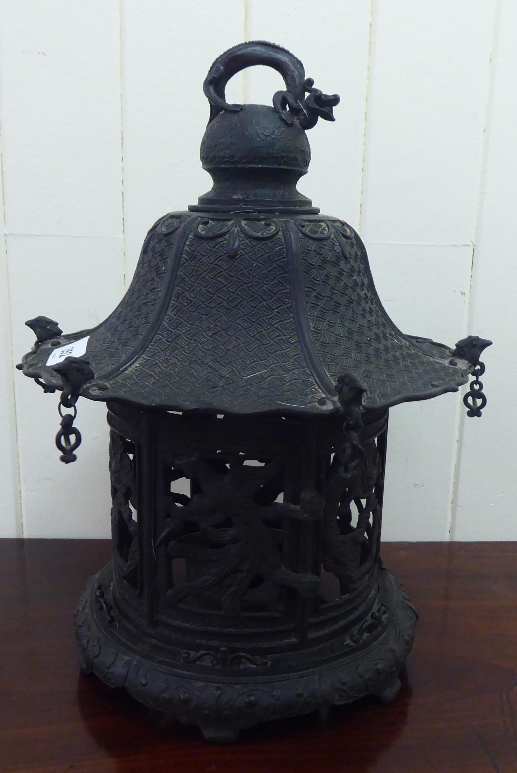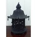A Chinese bronze finished, metal hanging lantern of pagoda design 14"h