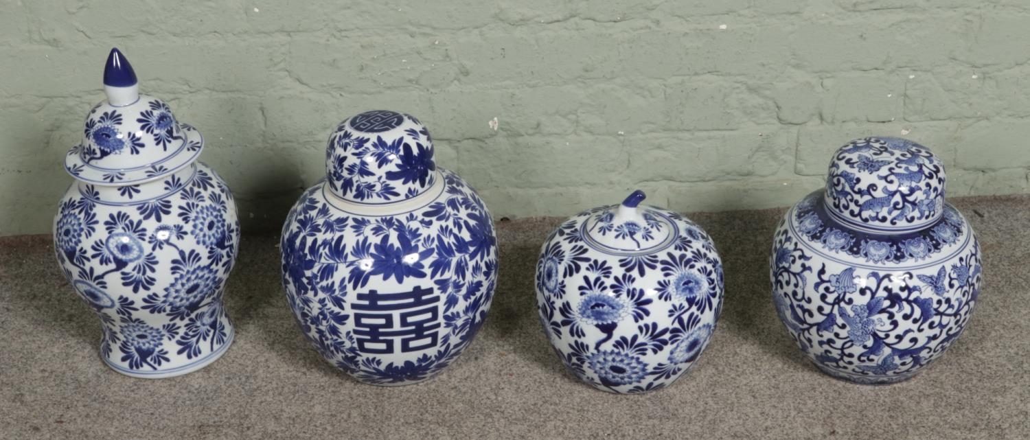 Four large oriental blue and white lidded jars to include happiness jar example.