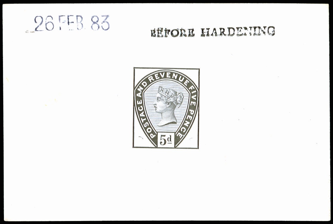 1883 5d Die proof (Unissued design with line under "d"). Very fine and fresh example printed by DLR in black on white glazed card (92 x 60mm) endorsed "BEFORE HARDENING" and dated "26 FEB. 83". Very scarce.