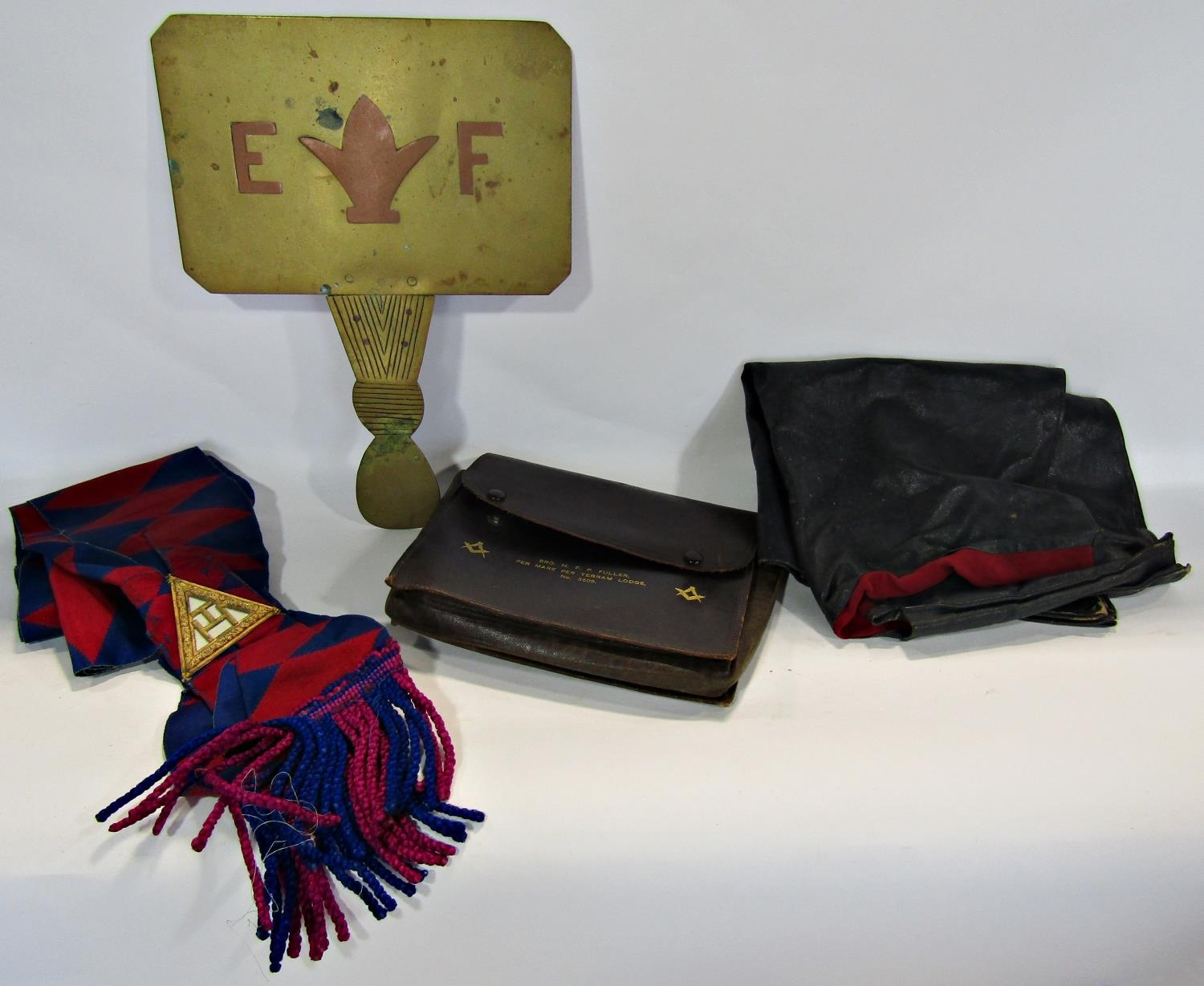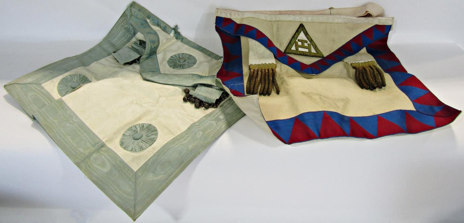 A selection of pewter and silver plated tankards together with some masonic items including aprons, etc
