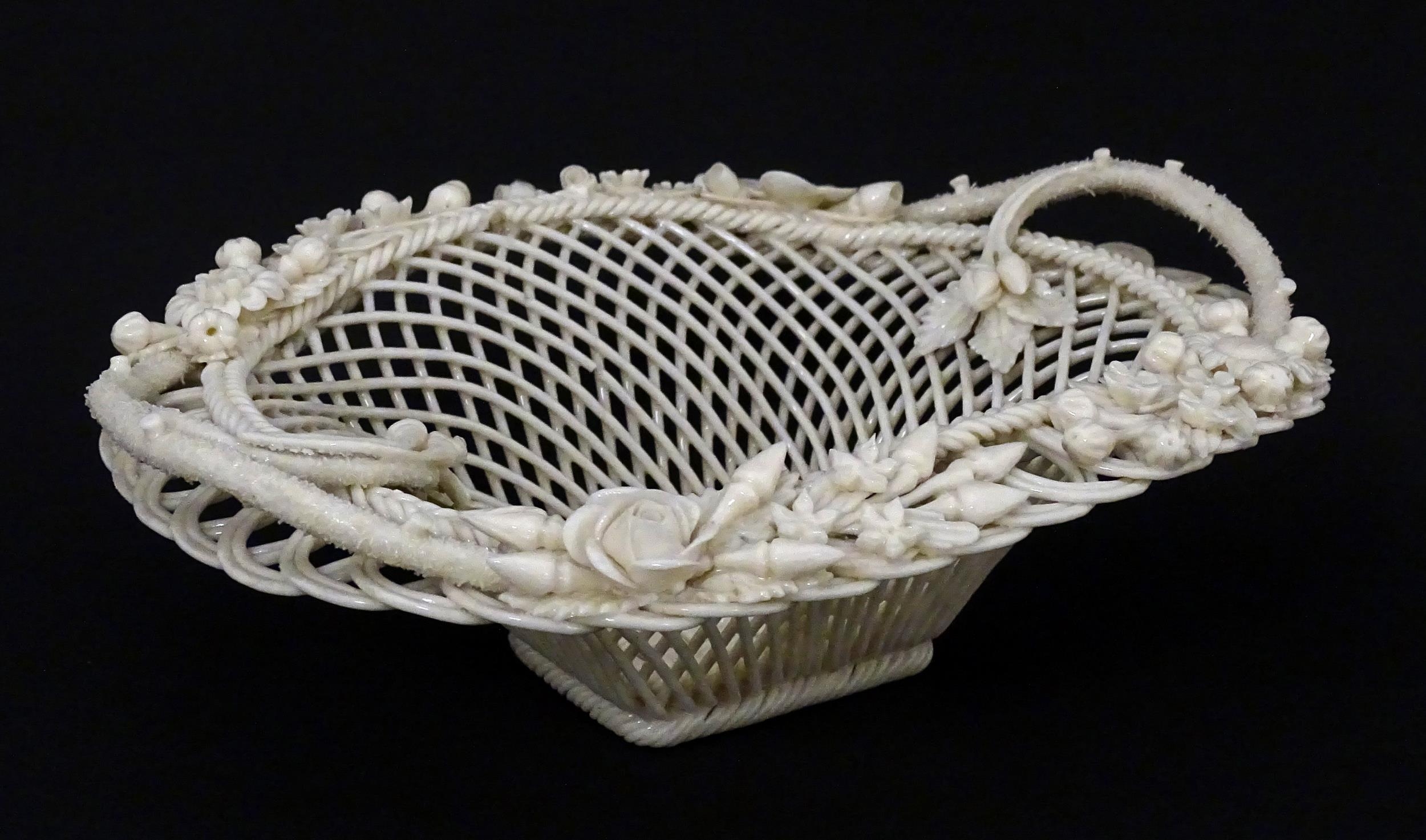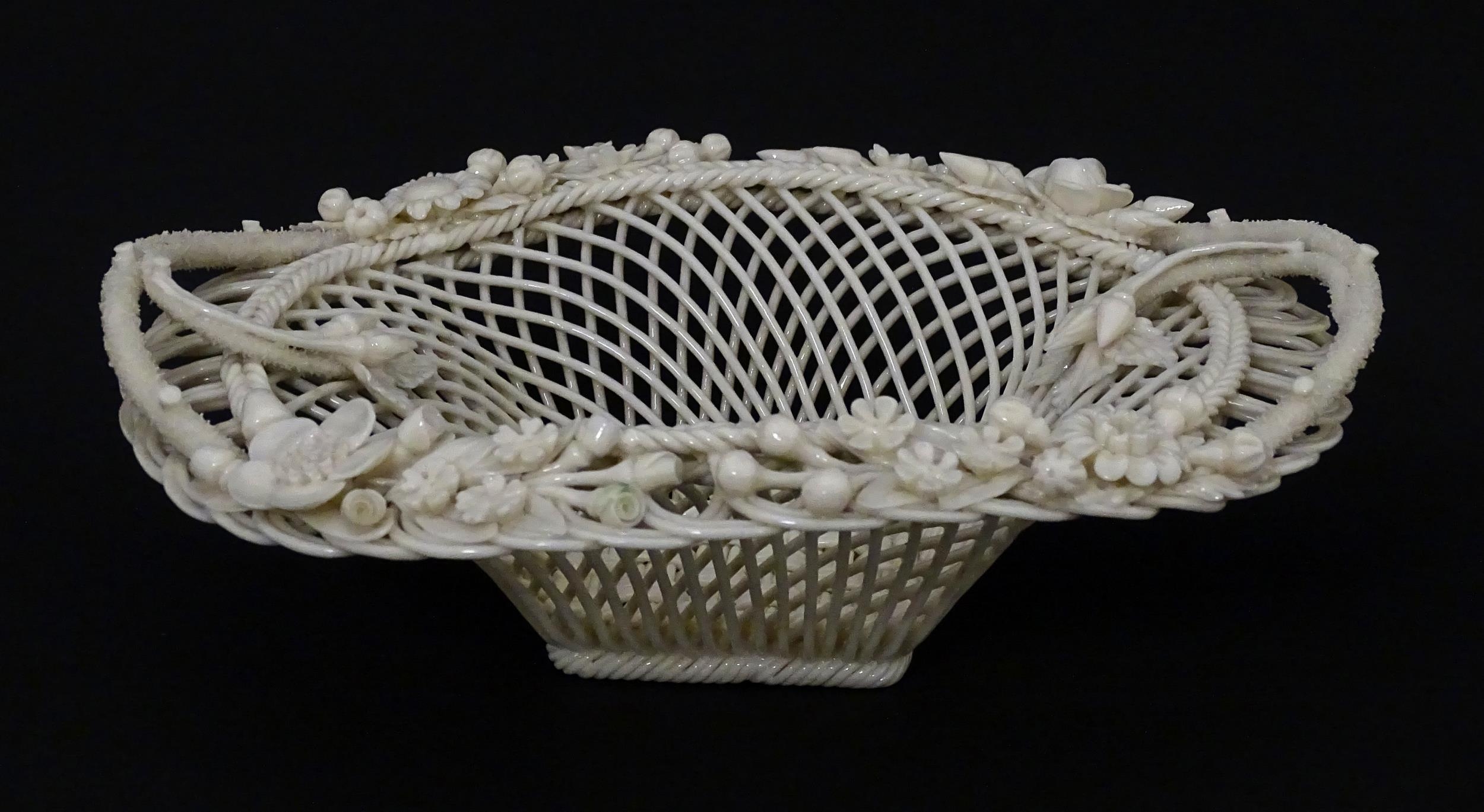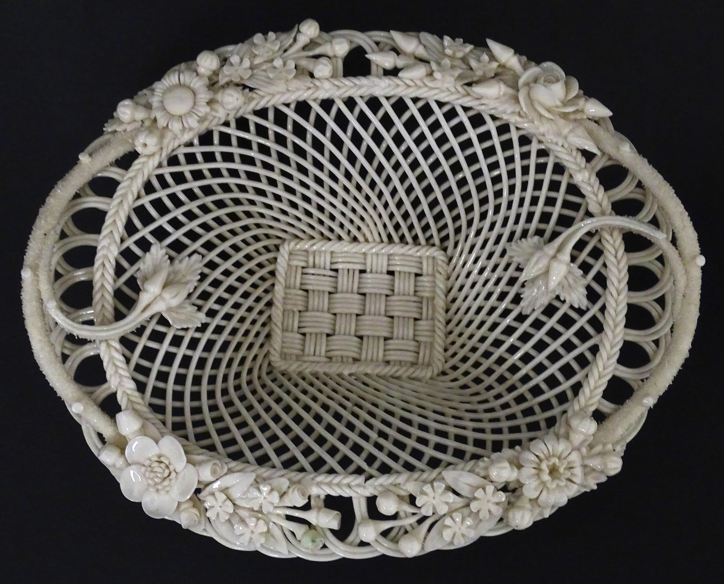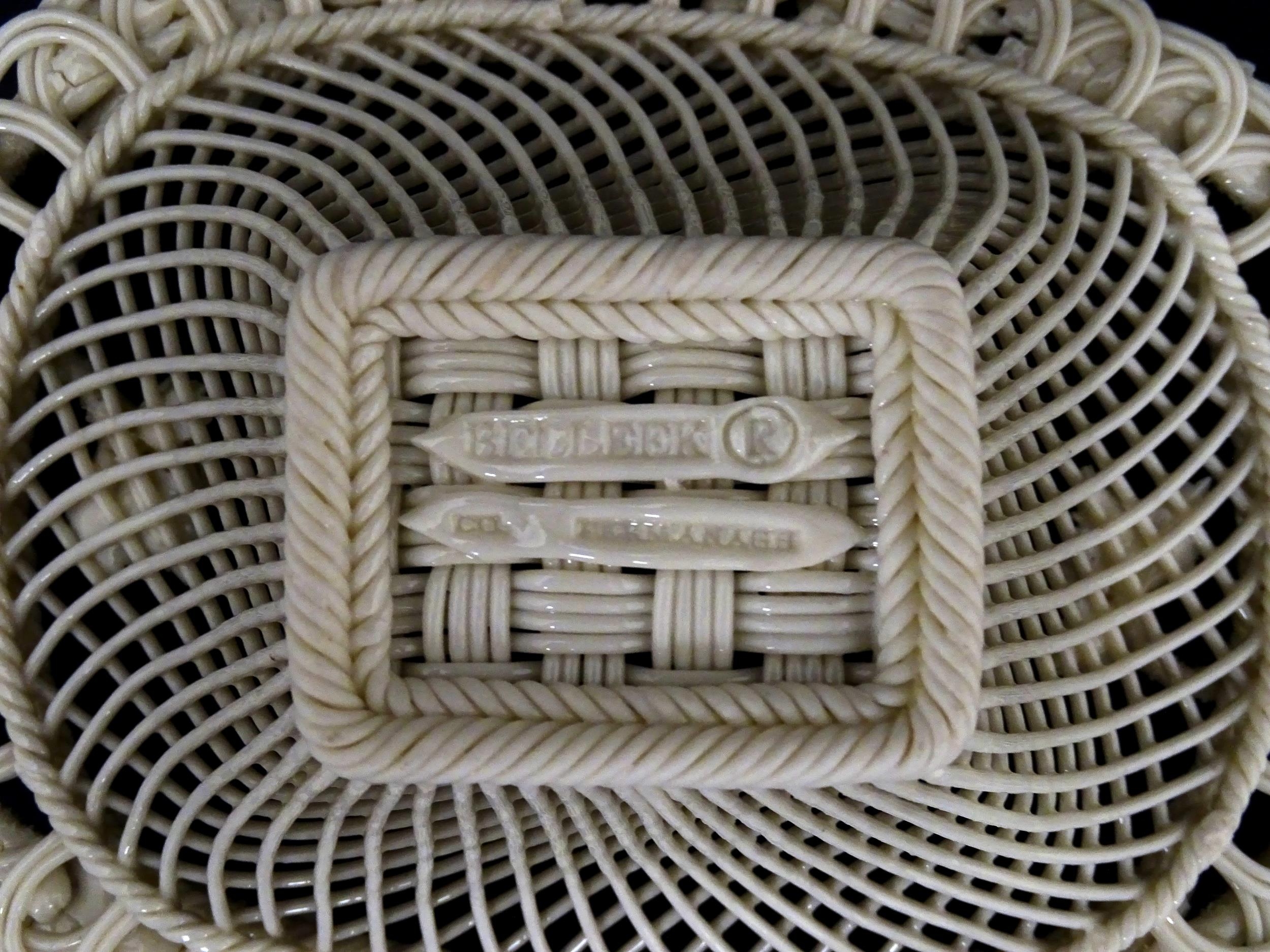 A Belleek four strand Henshall Basket having lattice work with ribbon edges, decorated with flowers and foliage. Impressed marks under. Approx. 8 1/4" wide