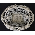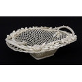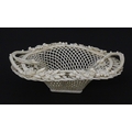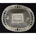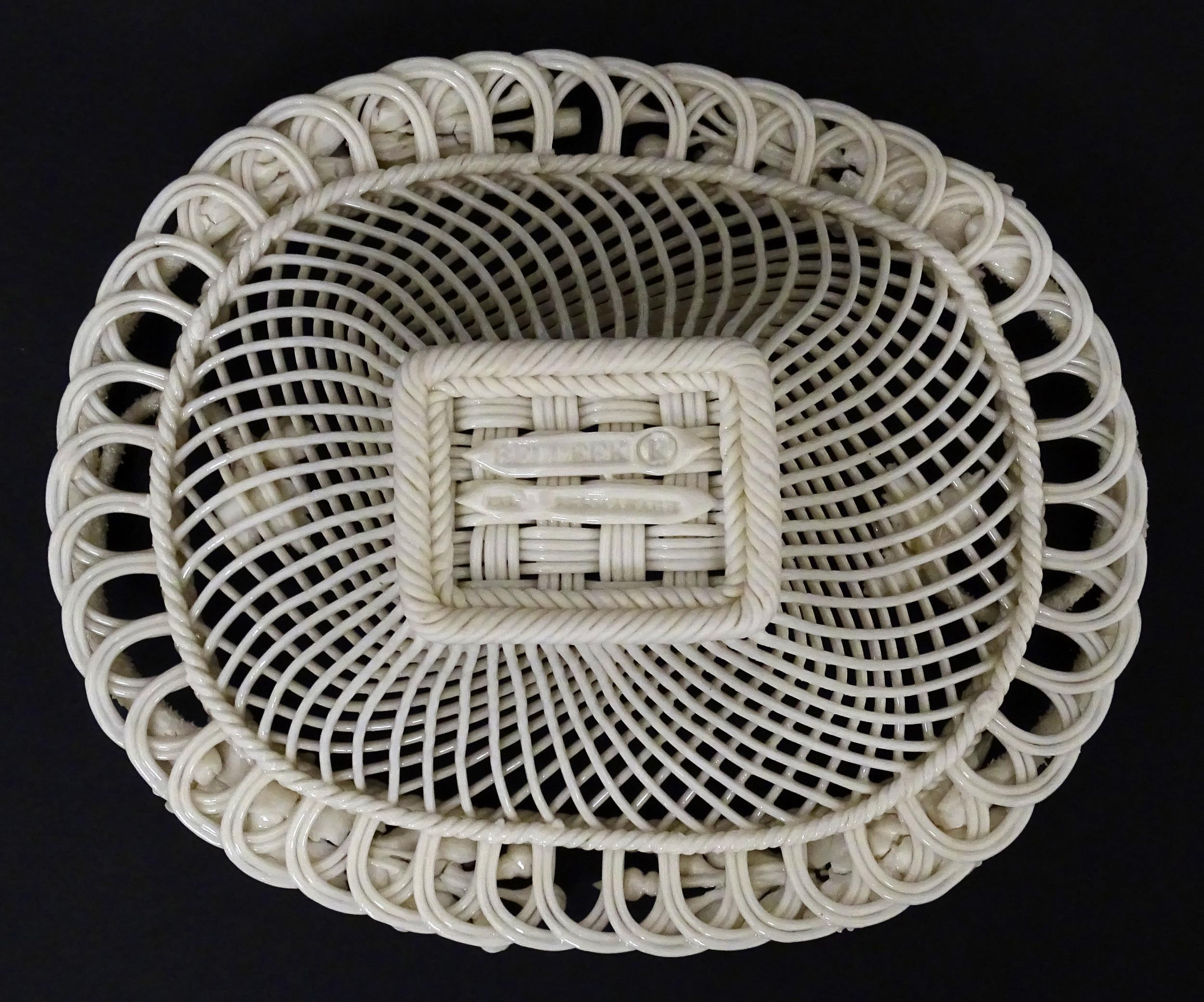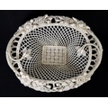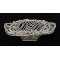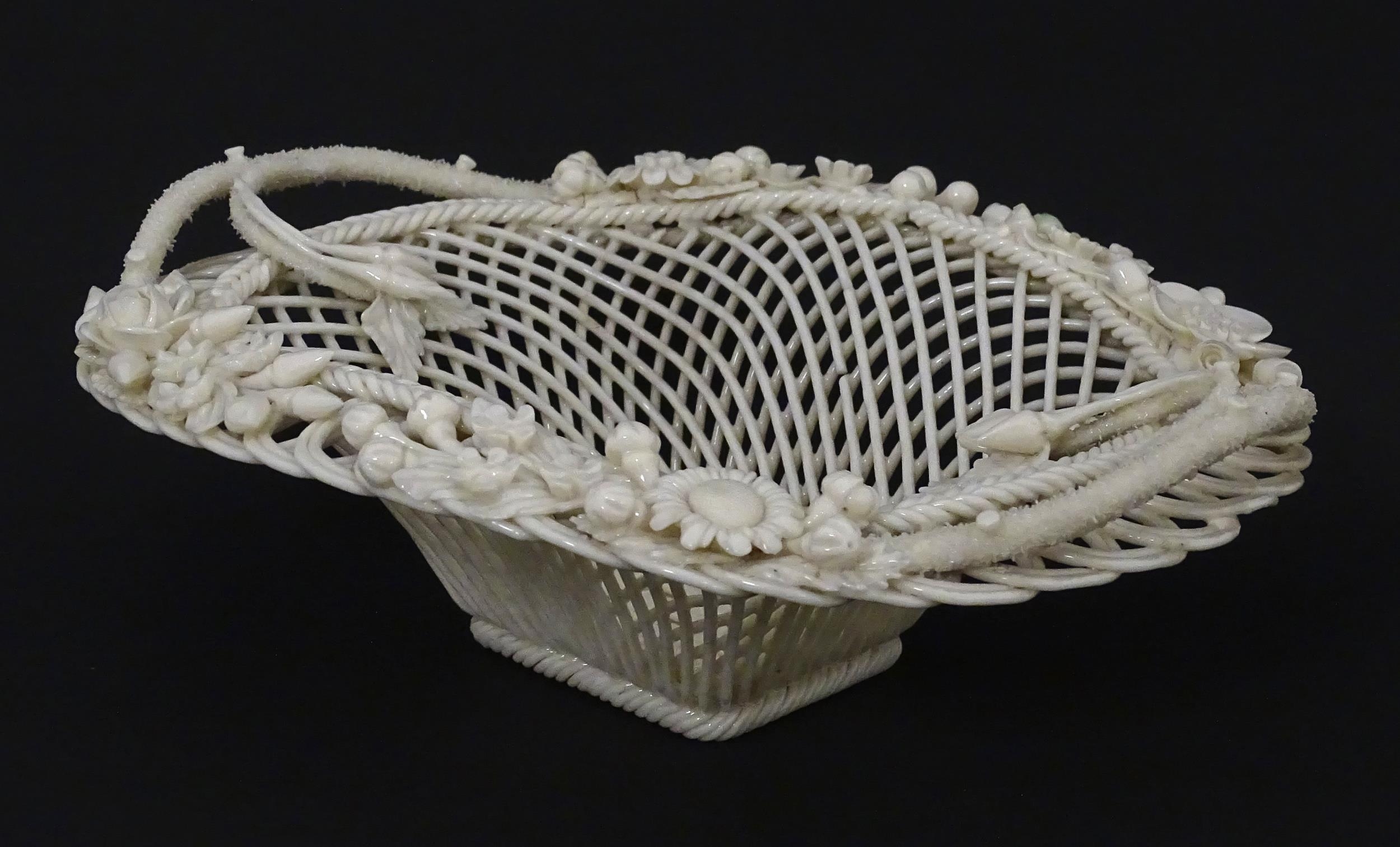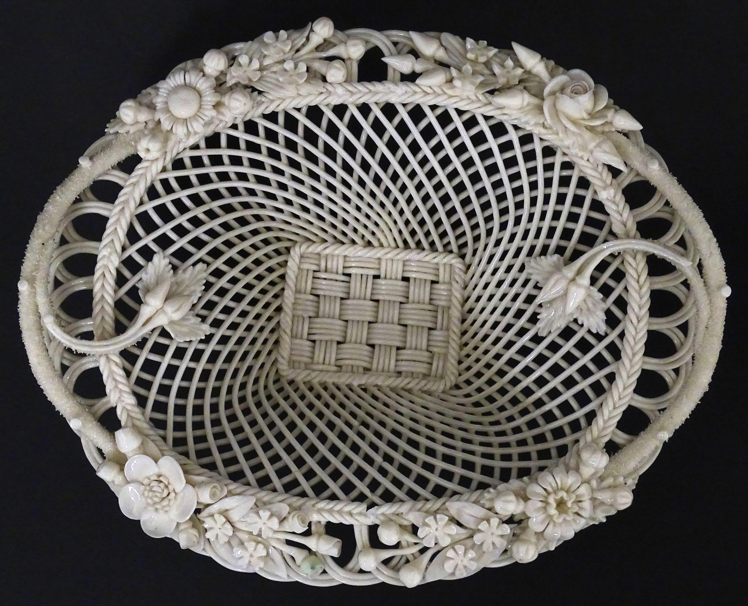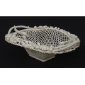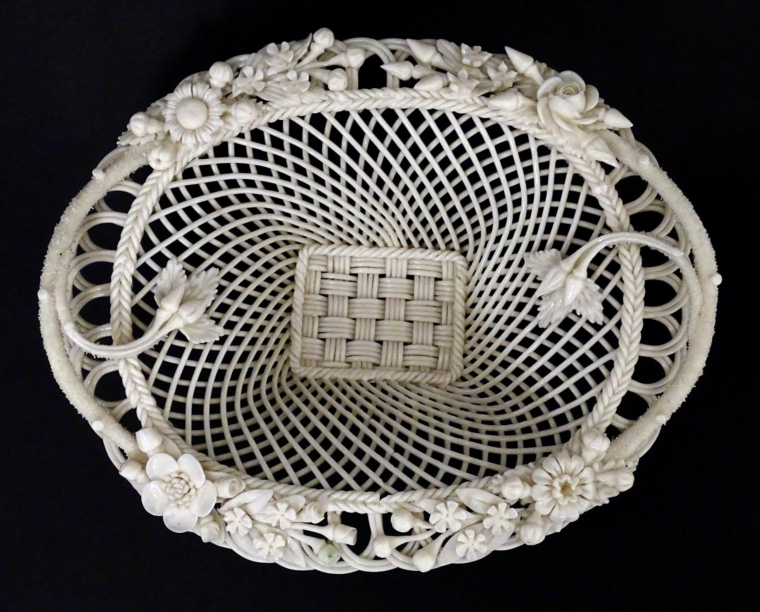 A Belleek four strand Henshall Basket having lattice work with ribbon edges, decorated with flowers and foliage. Impressed marks under. Approx. 8 1/4" wide
