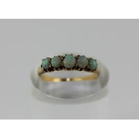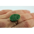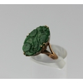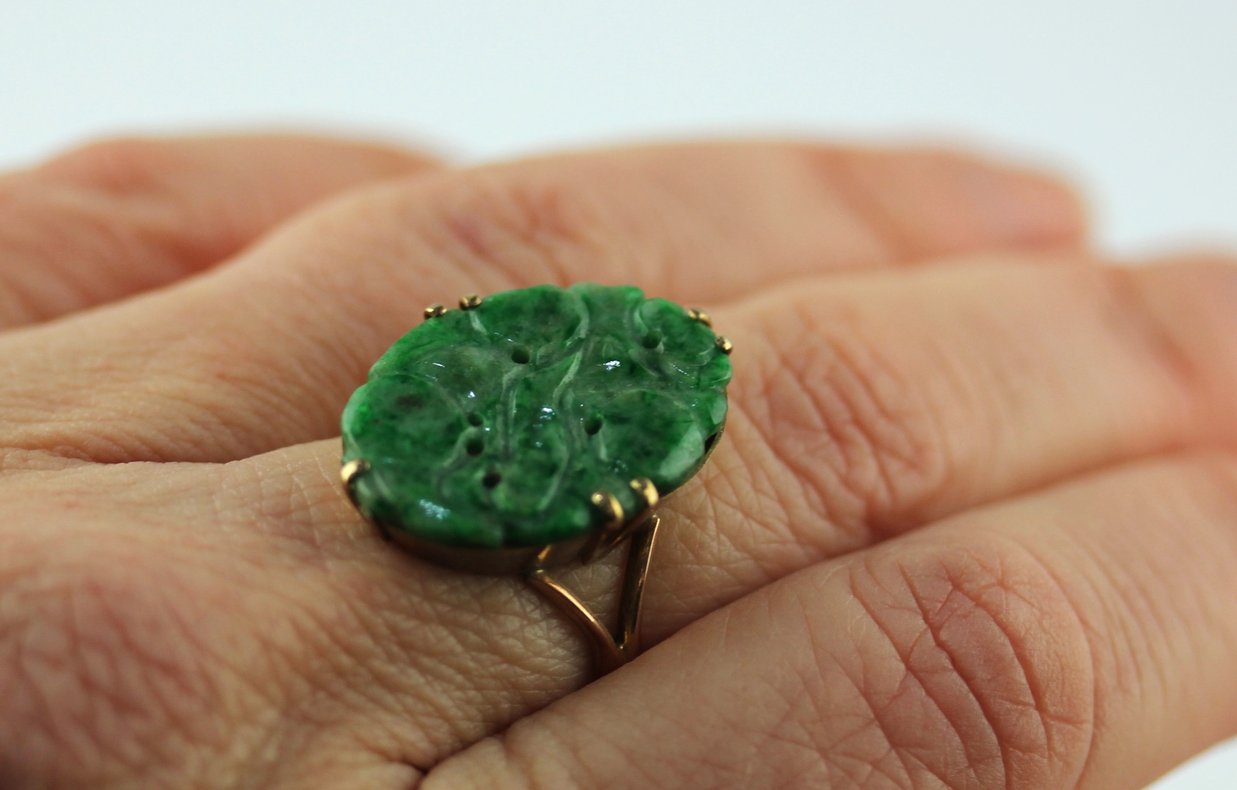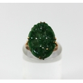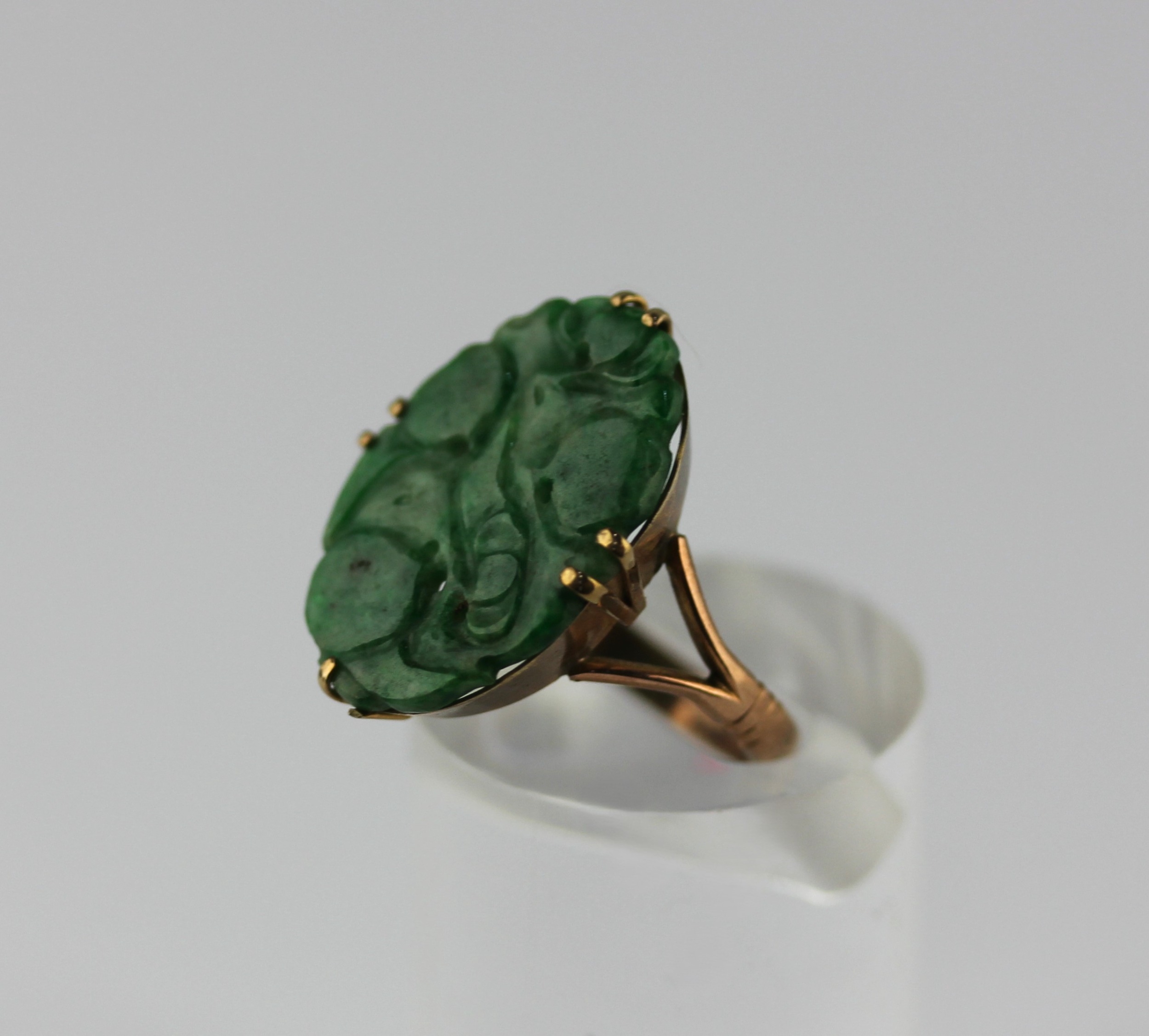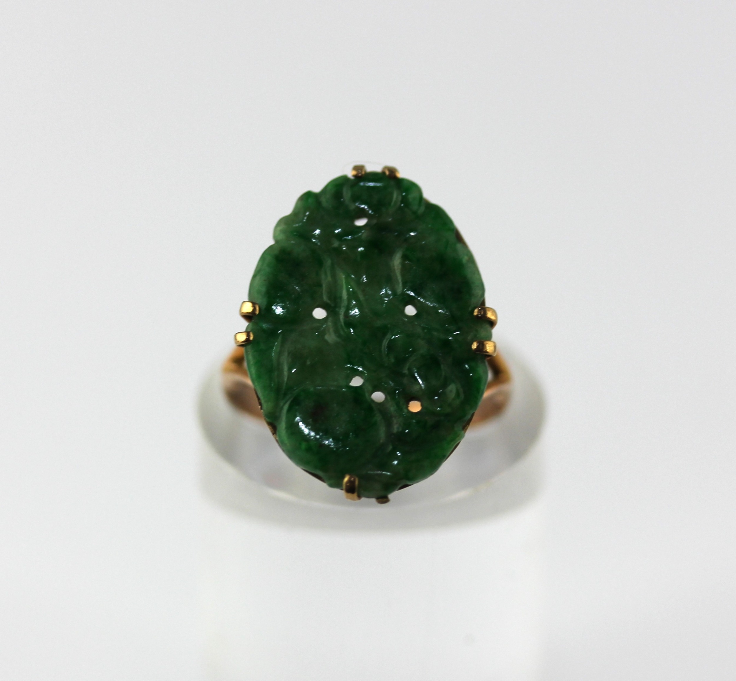 A gold ring claw set with an oval jade carved and pierced with fruit in an Asian design unmarked ring size P, gross weight 3.9g circa 1930 with a case