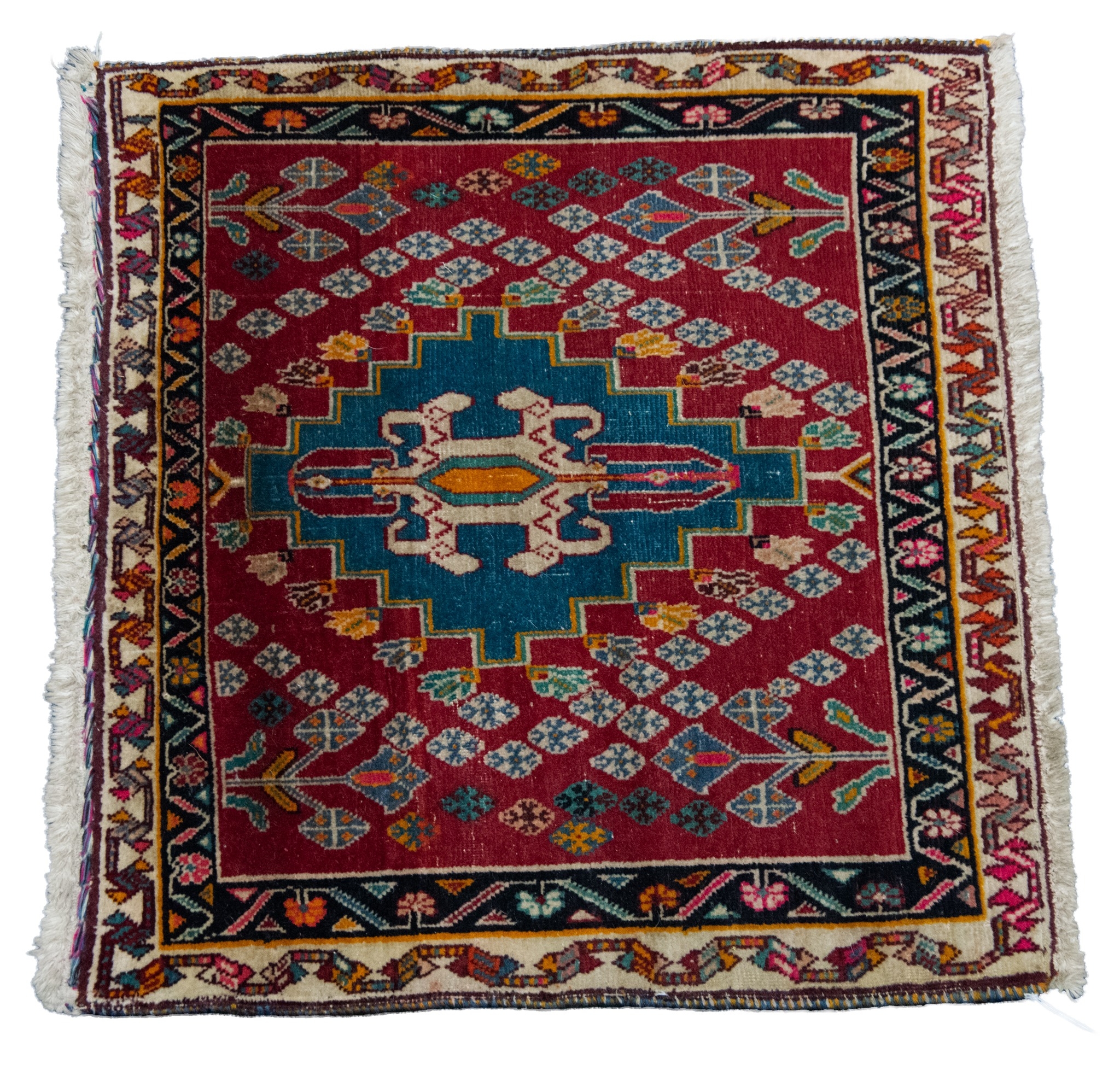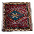 SHIRAZ PERSIAN SMALL RUG with stepped centre, sky blue medallion on a crimson ground with two narrow border stripes, 2' x 2'2" (61cm x 66cm)