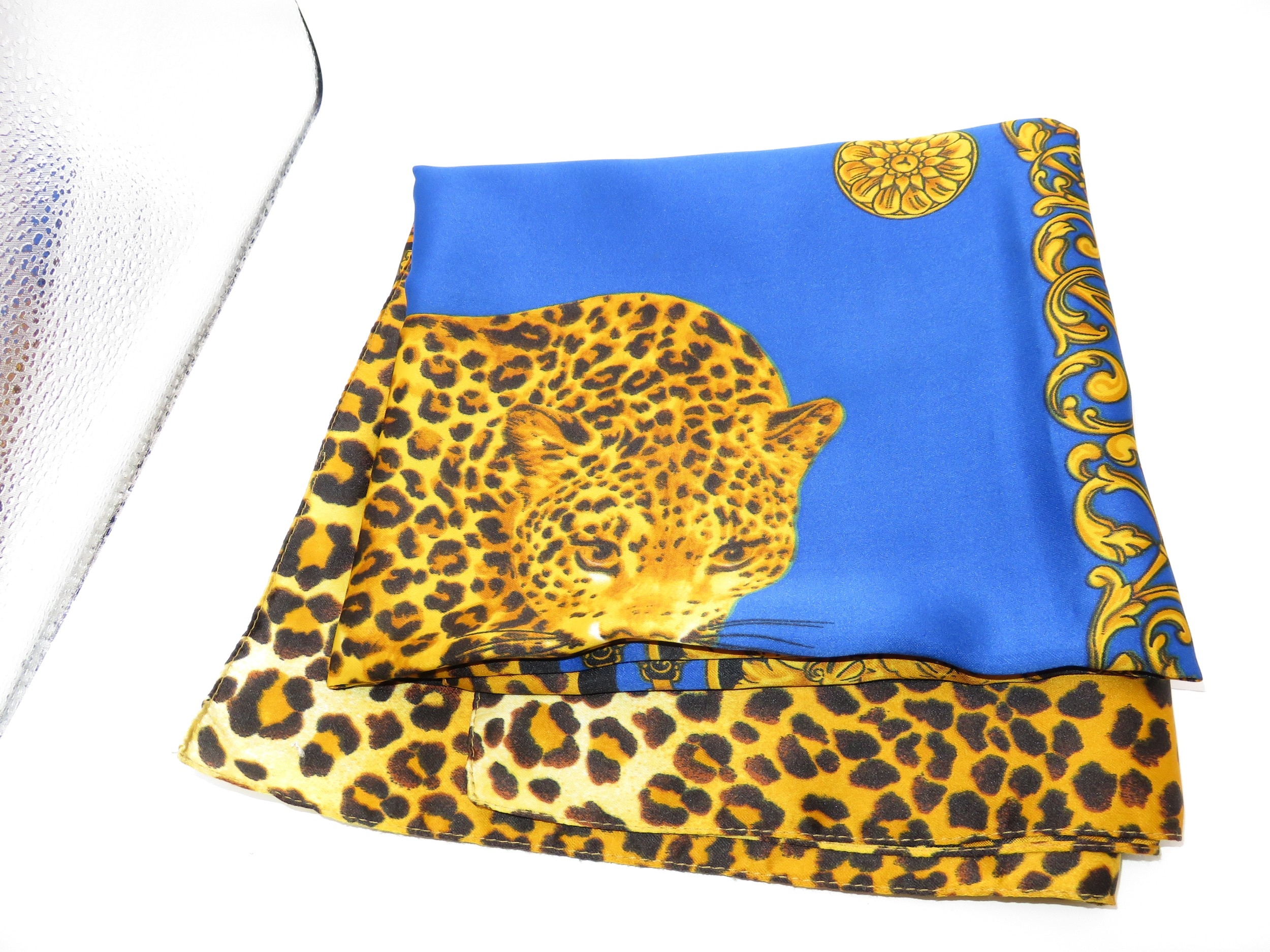 Silk scarf with central leopard in blue panel bordered with black and leopard print, measures 88cm square