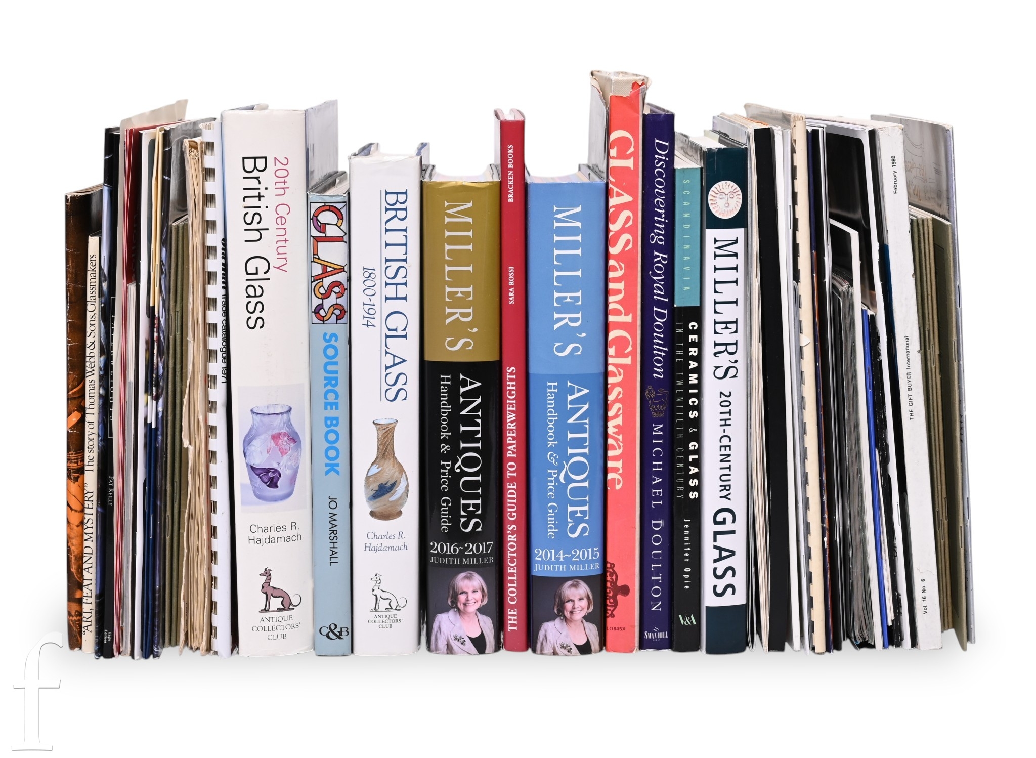 A large quantity of glass and ceramic reference books, trade and auction catalogues, to include "British Glass 1800-1914" Hajdamach C, ACC Ltd, 1991; "20th Century British Glass" Hajdamach C, ACC 2009; "Art, Feat and Mystery" Woodward H W, Mark & Moody, 1978; assorted Millers Guides etc.