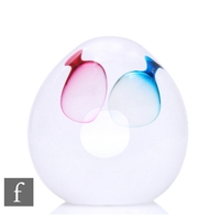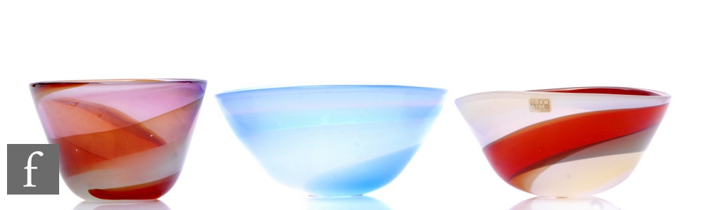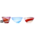 Hanne Dreutler - Studio Ahus - Three later 20th Century Anglahrak glass bowls, circa 1977-1981, each decorated with internal spiral lines, Tabac, in red and opal, Hed, in tonal brown and opal, and Queen, in blue and opal, width of largest 20cm, all with engraved signatures. (3)