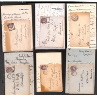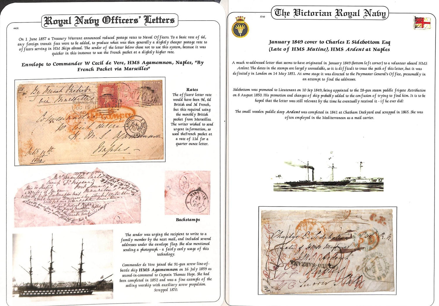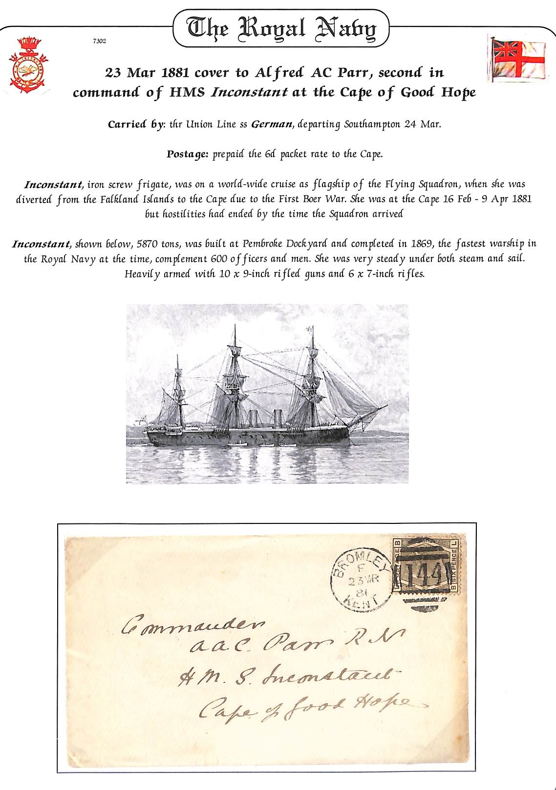 1849-81 Covers to naval ships comprising 1849 stampless cover from Worcester to "Charles Sidebottom (late of H.M.S Mutine), H.M.S Ardent, Naples", much redirected, various British and Sardinian handstamps including large "SCARTO"; 1860 cover from Swansea to "Commander W. Cecil de Vere, H.M.S Agamemnon, Naples" with 1d + 4d + 6d paying the 11d rate via Marseille; and 1881 cover from Bromley to "Commander A.A.C Parr, H.M.S Inconstant, Cape of Good Hope" franked 6d, the "Inconstant" diverted from the Falkland Islands to the Cape due to the First Boer War arriving after hostilities had ended. (3).