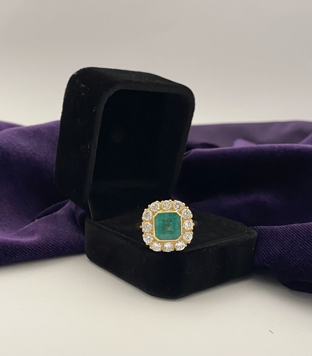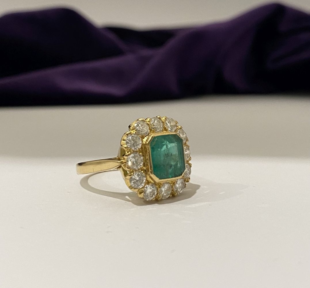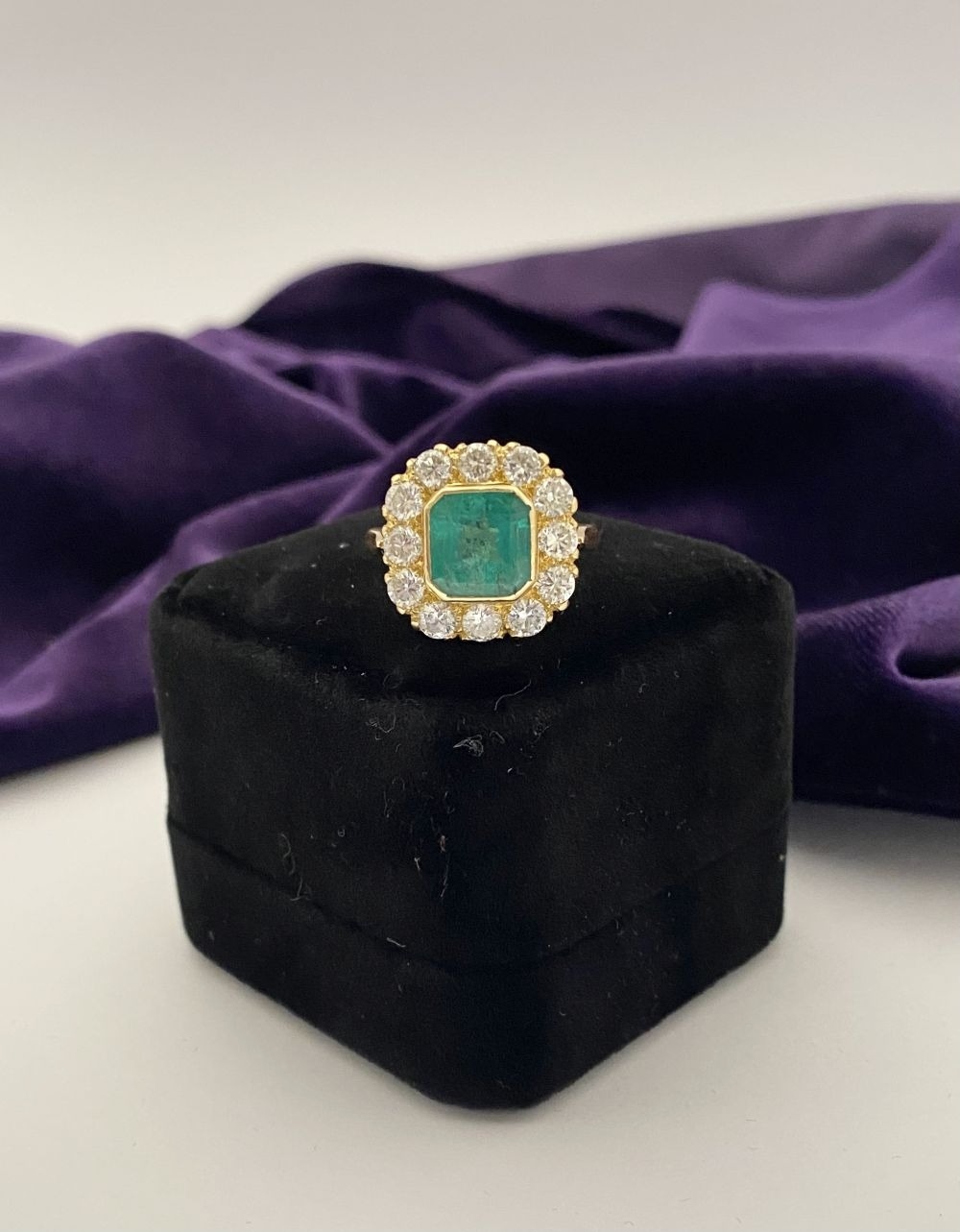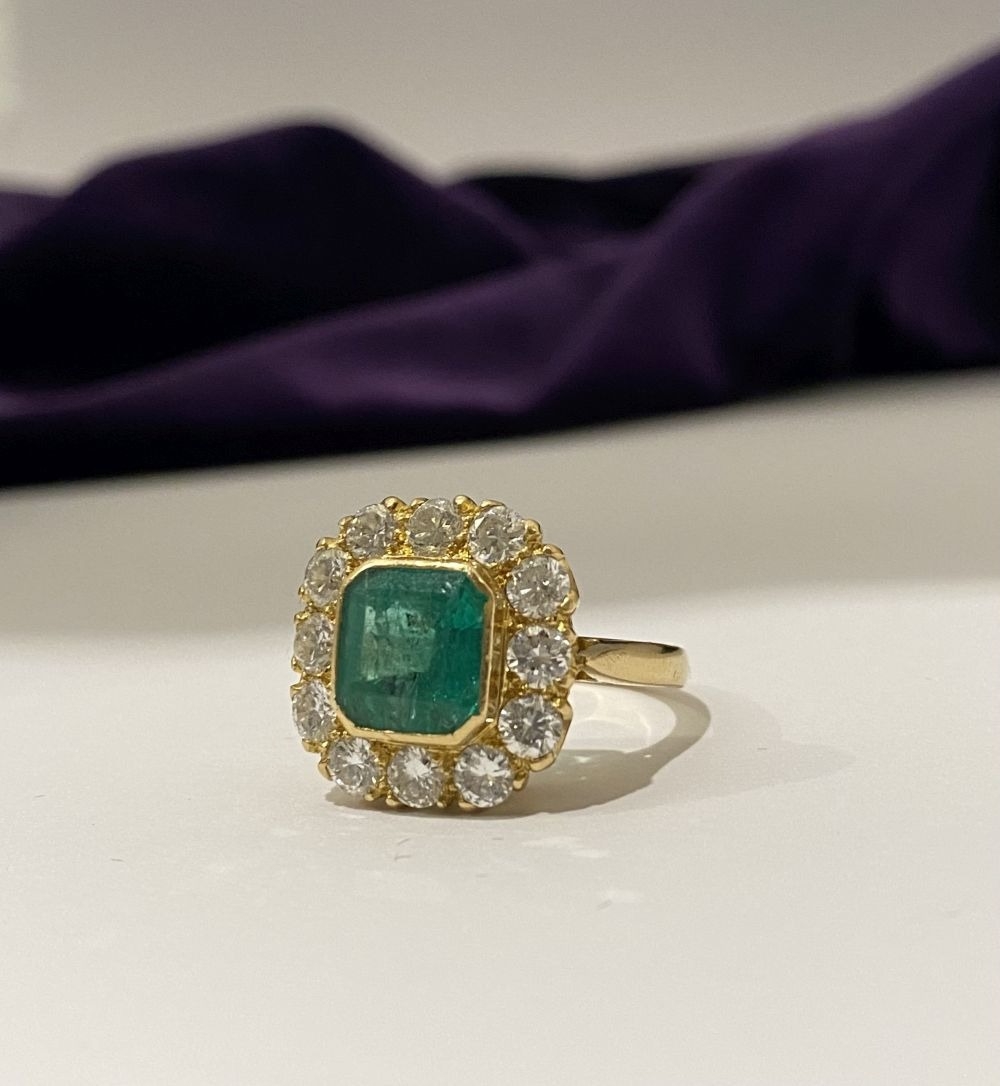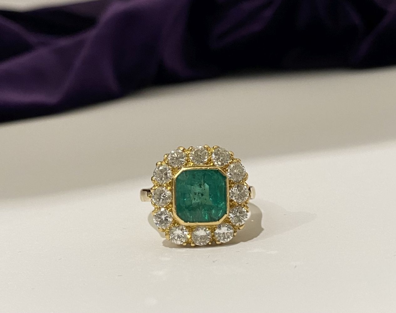 AN EXCEPTIONAL 18CT GOLD EMERALD & DIAMOND CLUSTER RING, with central vibrant emerald in bezel setting, surrounded by twelve round cut diamonds, claw set in raised setting. With split shank design to shoulders of 18ct yellow gold band, hallmarked to interior band 750, London date letter P, Makers mark B&G. Emerald weight: 2.6ct approx. Each diamond is approx. .10ct, making the total diamond weight: 1.2ct approx. Ring size: P/Q. Total Ring weight: 7.79g approx.