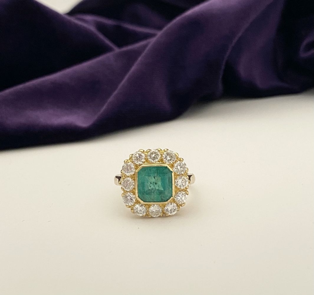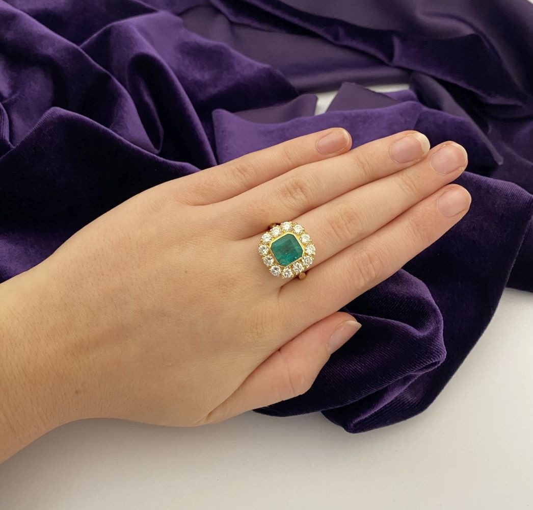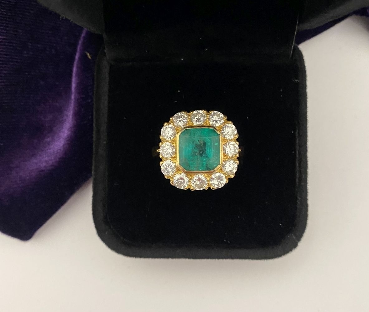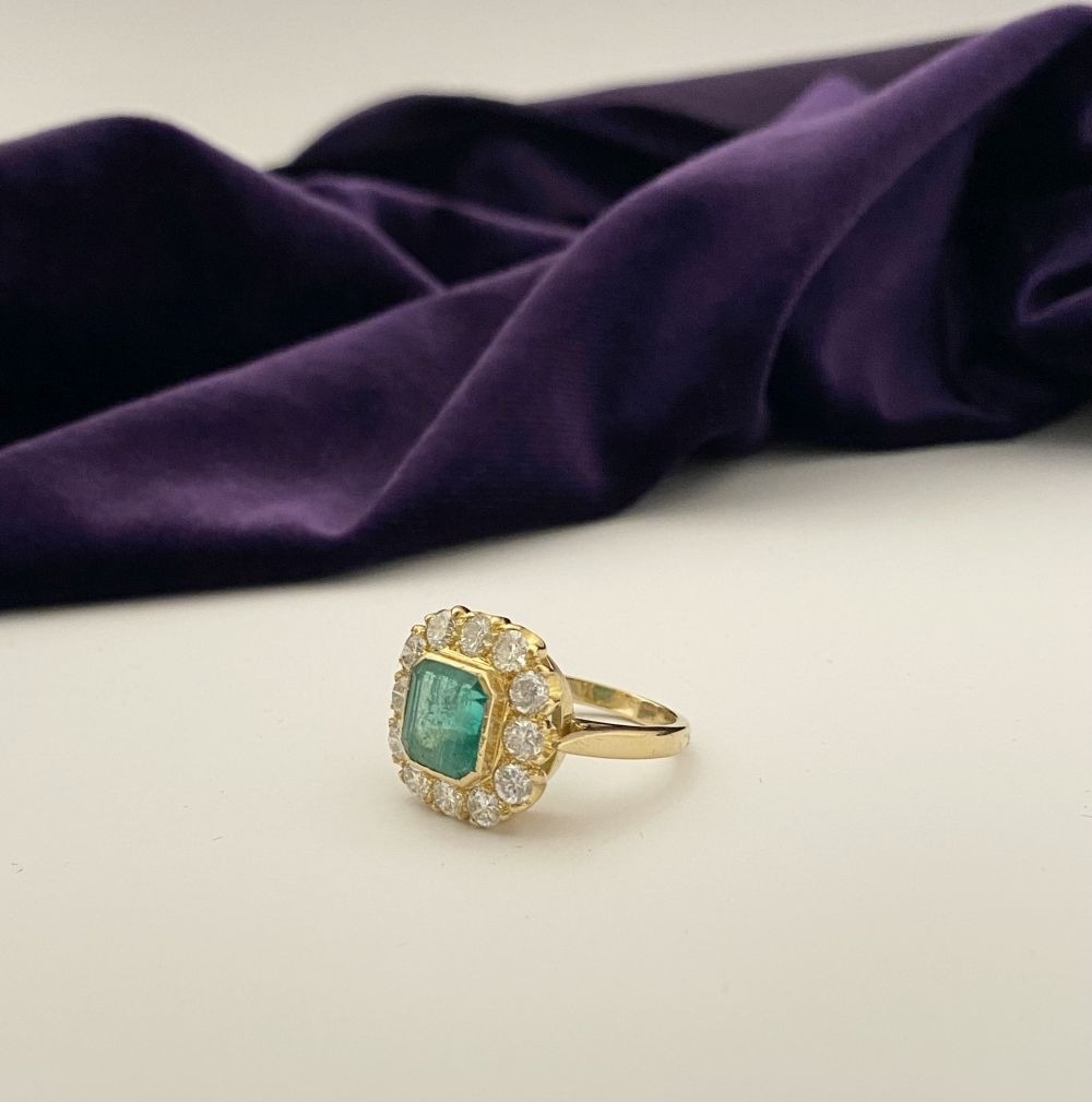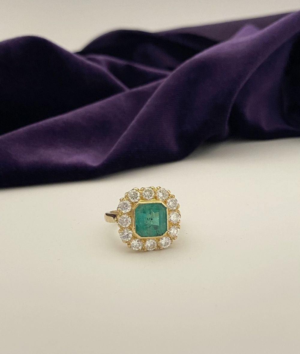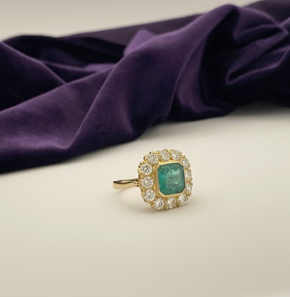 AN EXCEPTIONAL 18CT GOLD EMERALD & DIAMOND CLUSTER RING, with central vibrant emerald in bezel setting, surrounded by twelve round cut diamonds, claw set in raised setting. With split shank design to shoulders of 18ct yellow gold band, hallmarked to interior band 750, London date letter P, Makers mark B&G. Emerald weight: 2.6ct approx. Each diamond is approx. .10ct, making the total diamond weight: 1.2ct approx. Ring size: P/Q. Total Ring weight: 7.79g approx.