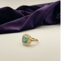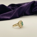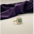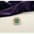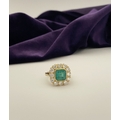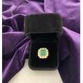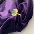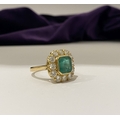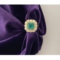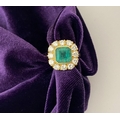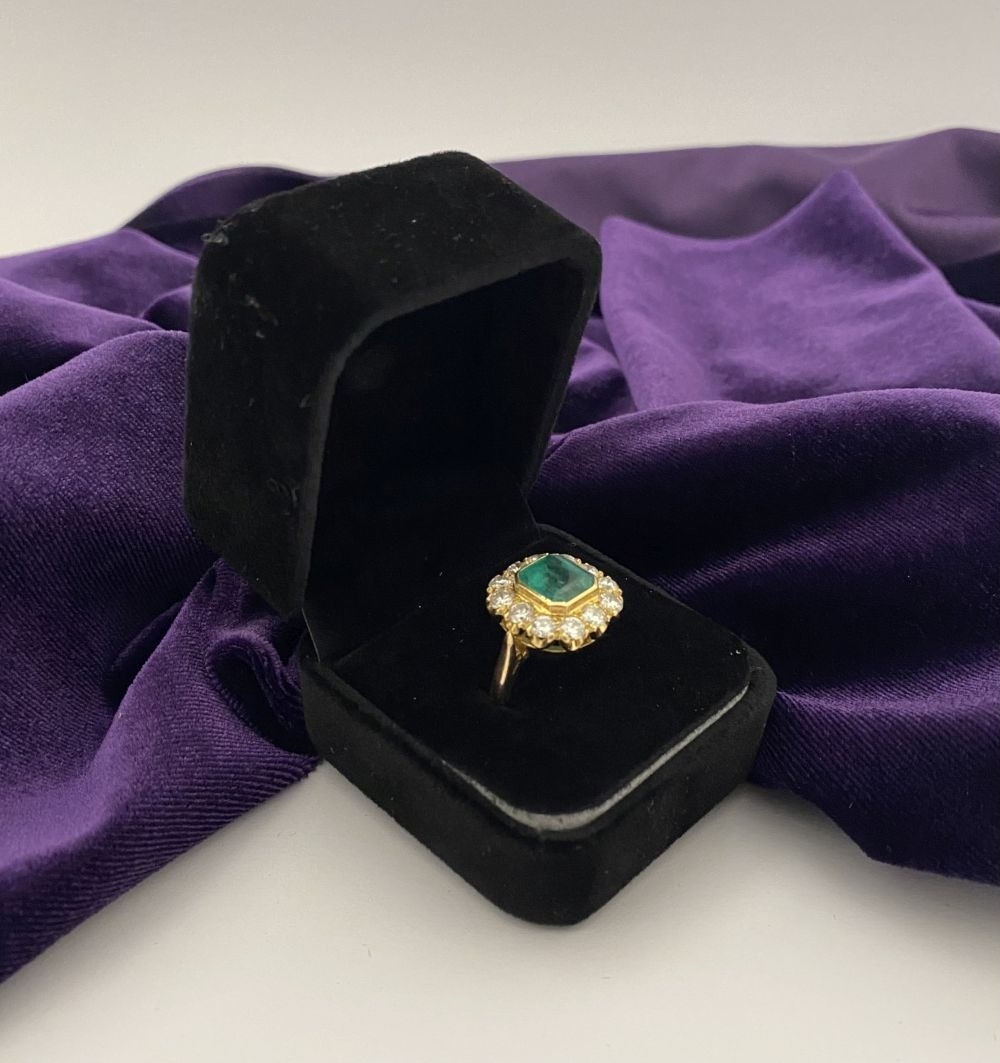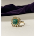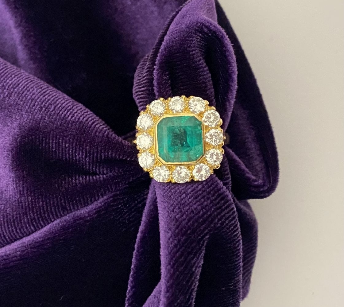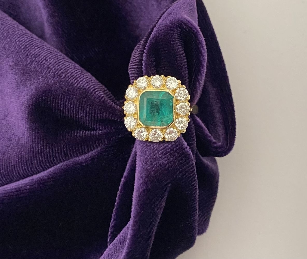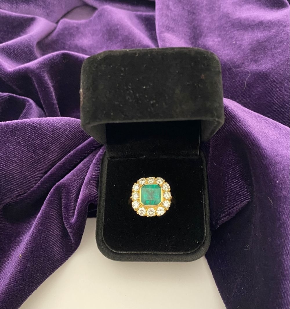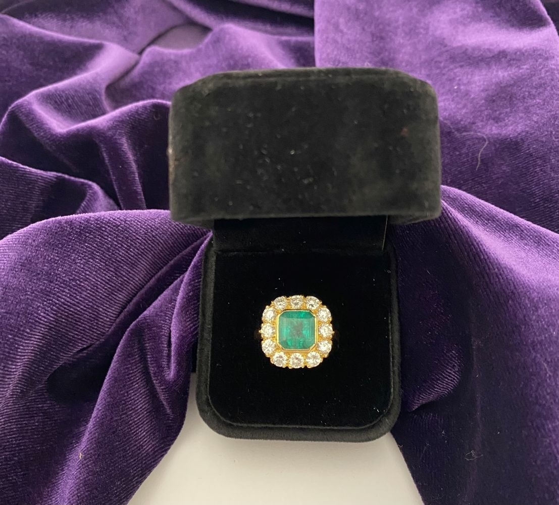 AN EXCEPTIONAL 18CT GOLD EMERALD & DIAMOND CLUSTER RING, with central vibrant emerald in bezel setting, surrounded by twelve round cut diamonds, claw set in raised setting. With split shank design to shoulders of 18ct yellow gold band, hallmarked to interior band 750, London date letter P, Makers mark B&G. Emerald weight: 2.6ct approx. Each diamond is approx. .10ct, making the total diamond weight: 1.2ct approx. Ring size: P/Q. Total Ring weight: 7.79g approx.