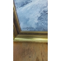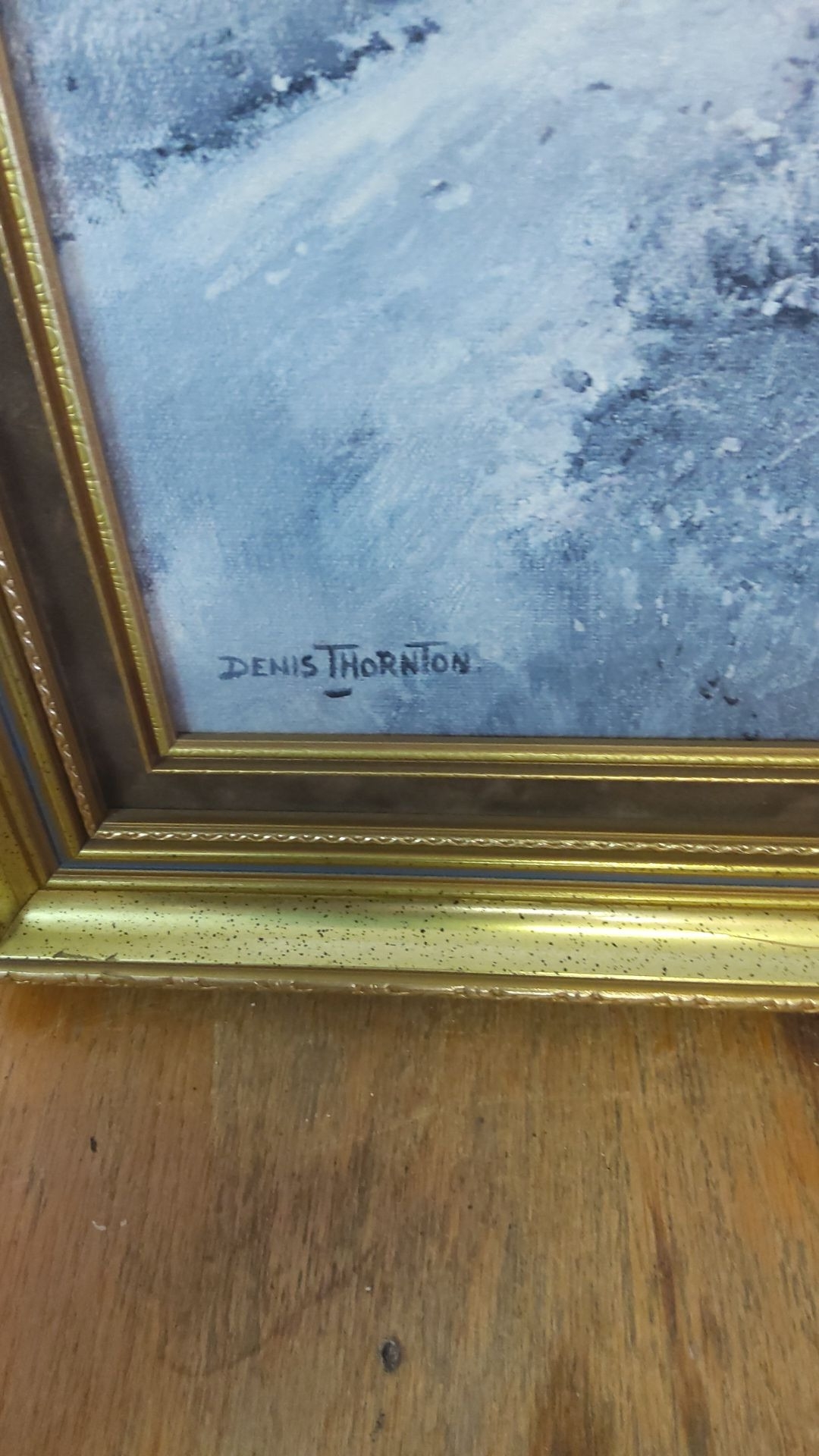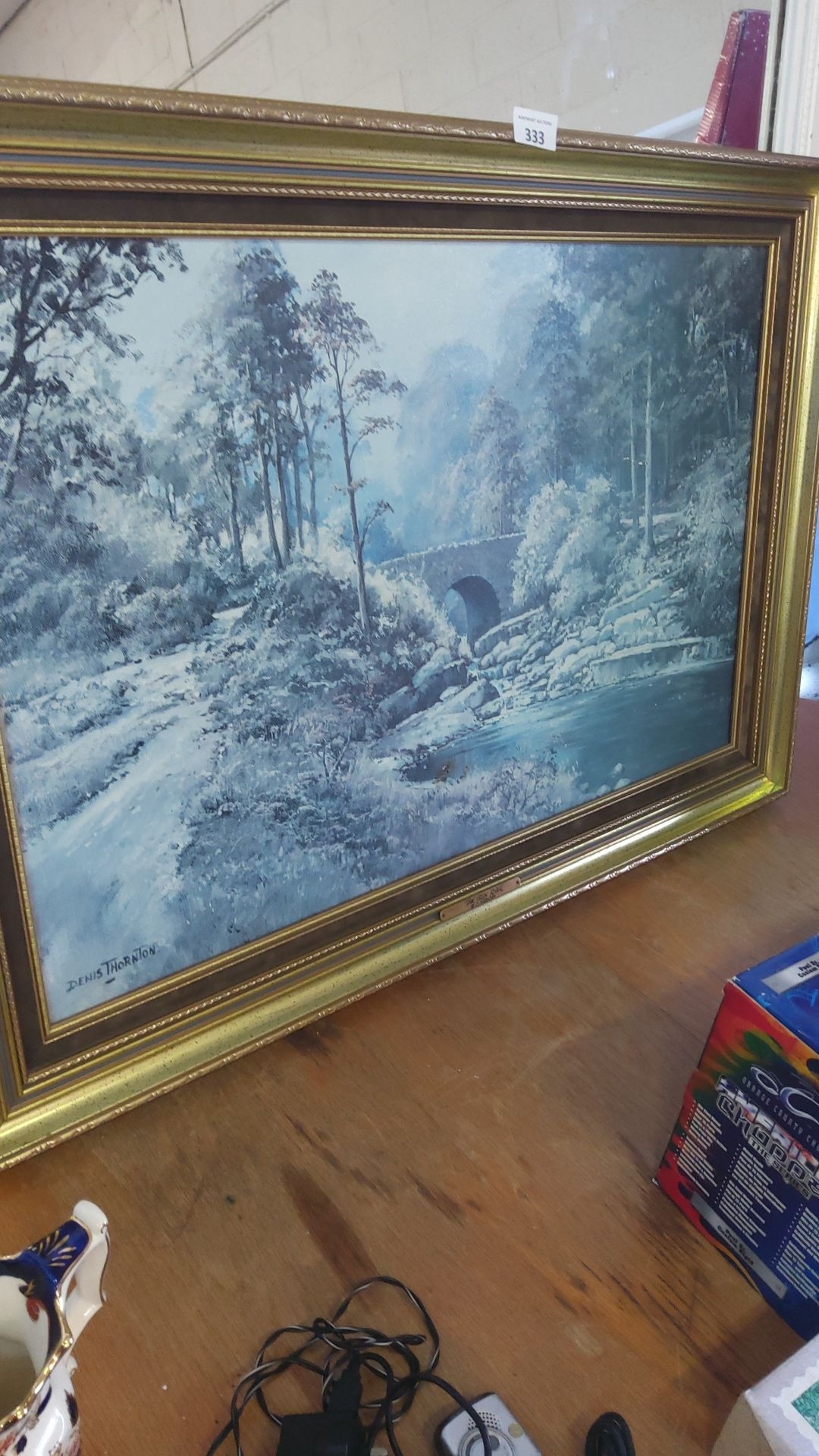 Oil painting by Denis Thornton, featuring a serene winter landscape with a stone bridge. Framed.