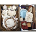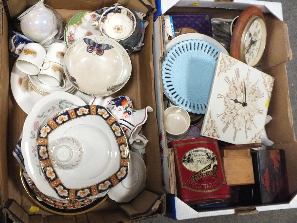 TWO TRAYS OF CERAMICS AND COLLECTABLES TO INCLUDE MODERN WALL CLOCKS, TRINKET BOXES AND A FRAMED AND GLAZED LIMITED EDITION PRINT OF MIDDLEFELL PLACE LANGDALE BY K ROWLAND -FORD 49/500