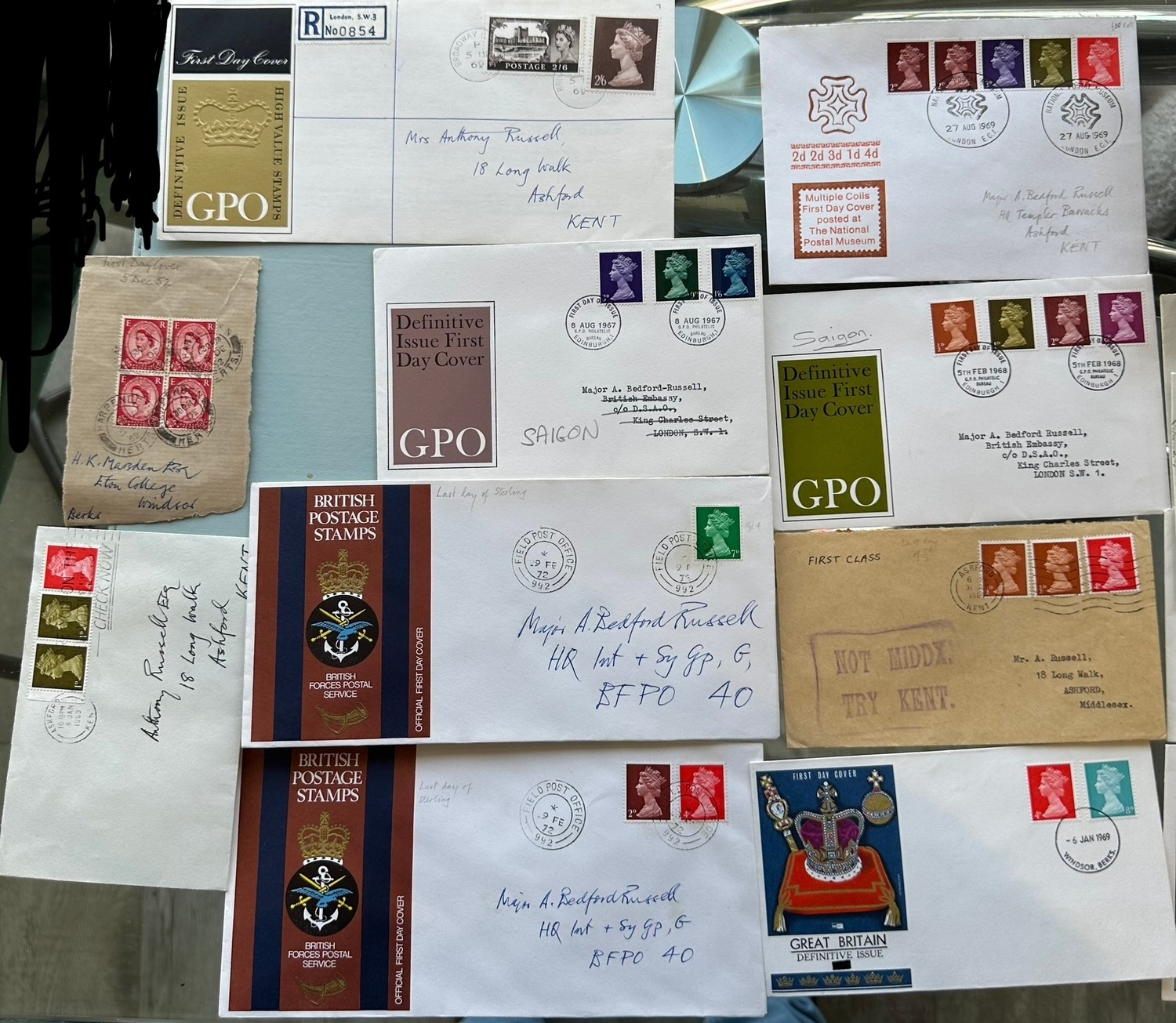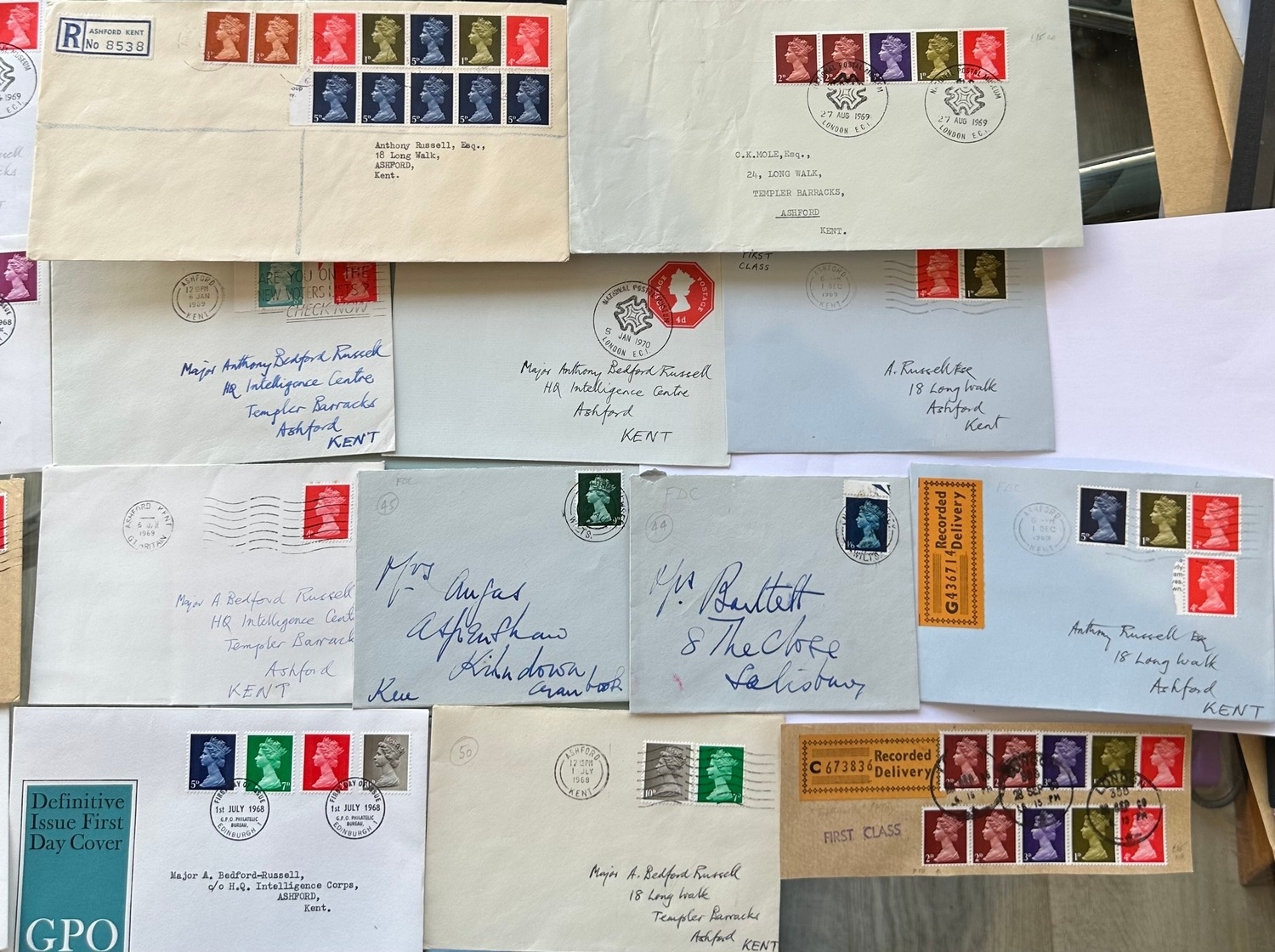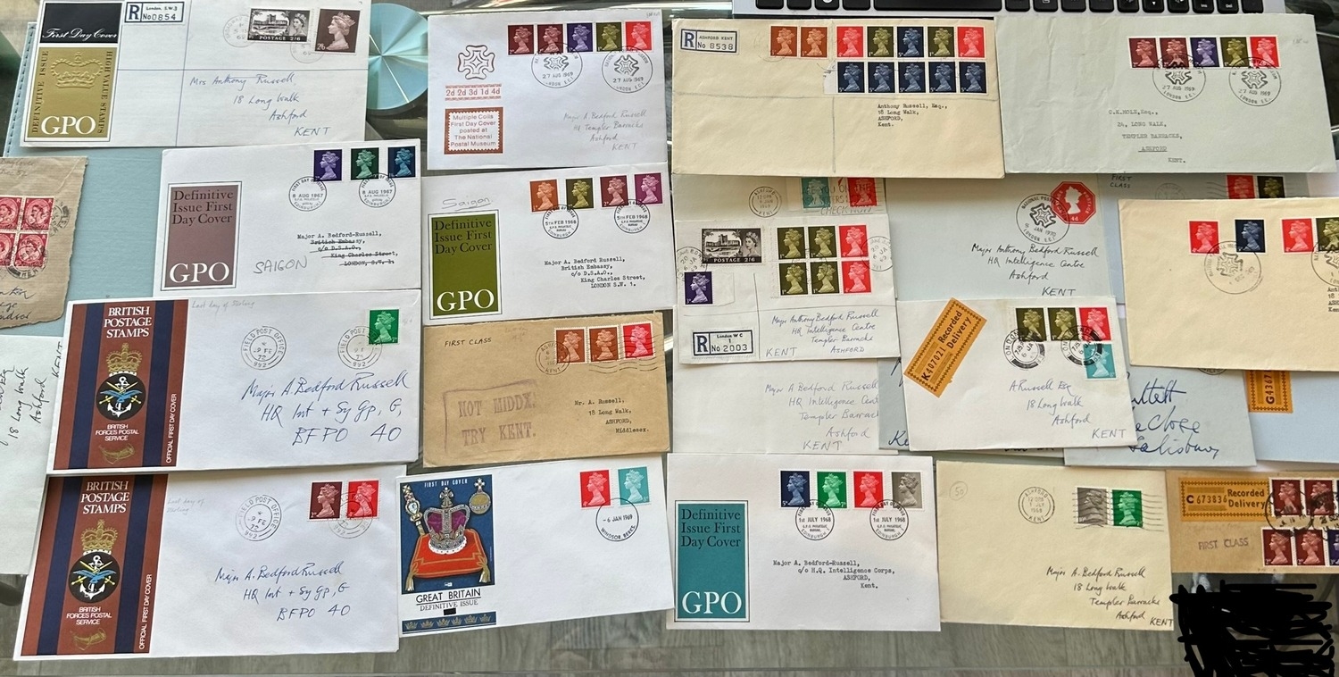 Definitive FDC and Last Day of Sterling covers with Machins stamps being part of small collection of Major Anthony Bedford Russell Dec'd military interest. "NOT MIDDX TRY KENT" post office handstamp. Multiple coils / rolls, booklet panes. Ashford, Kent. Field Post.