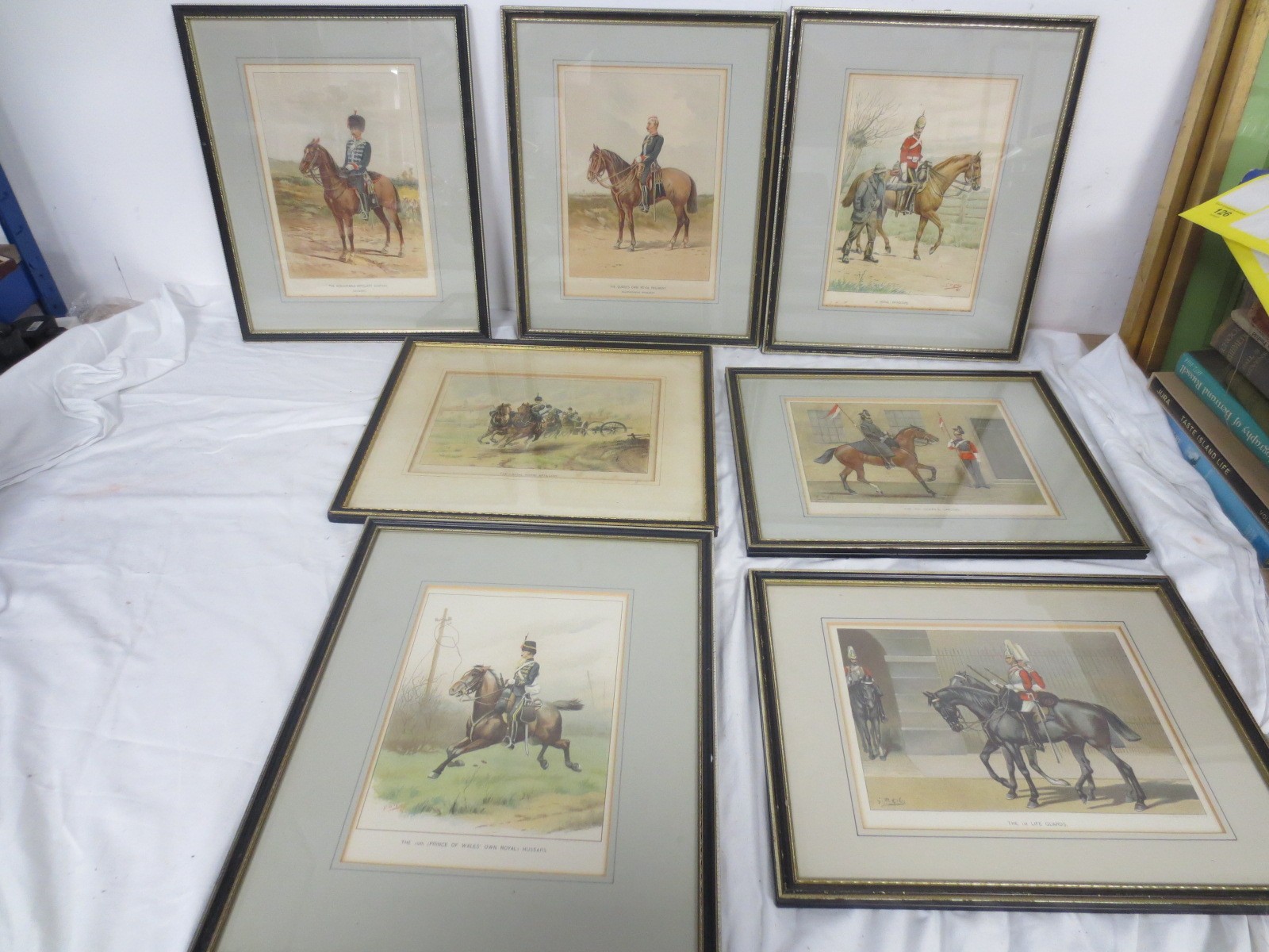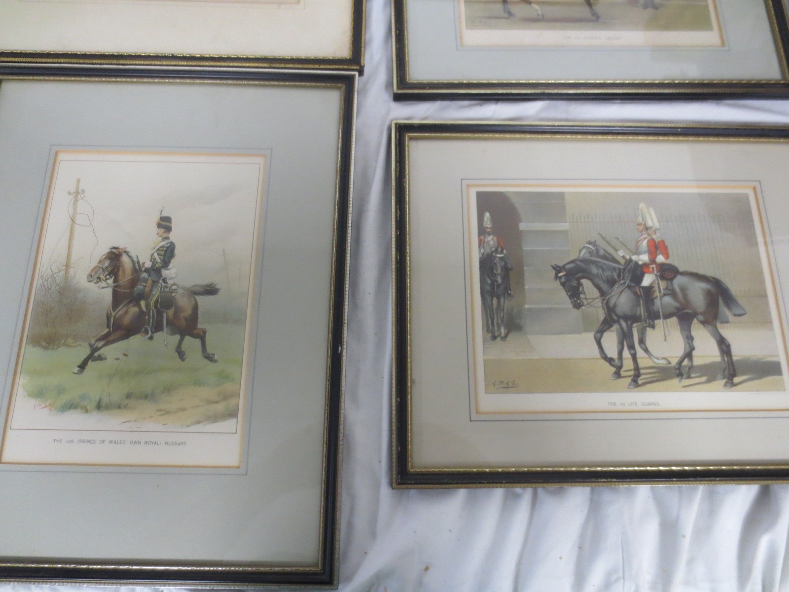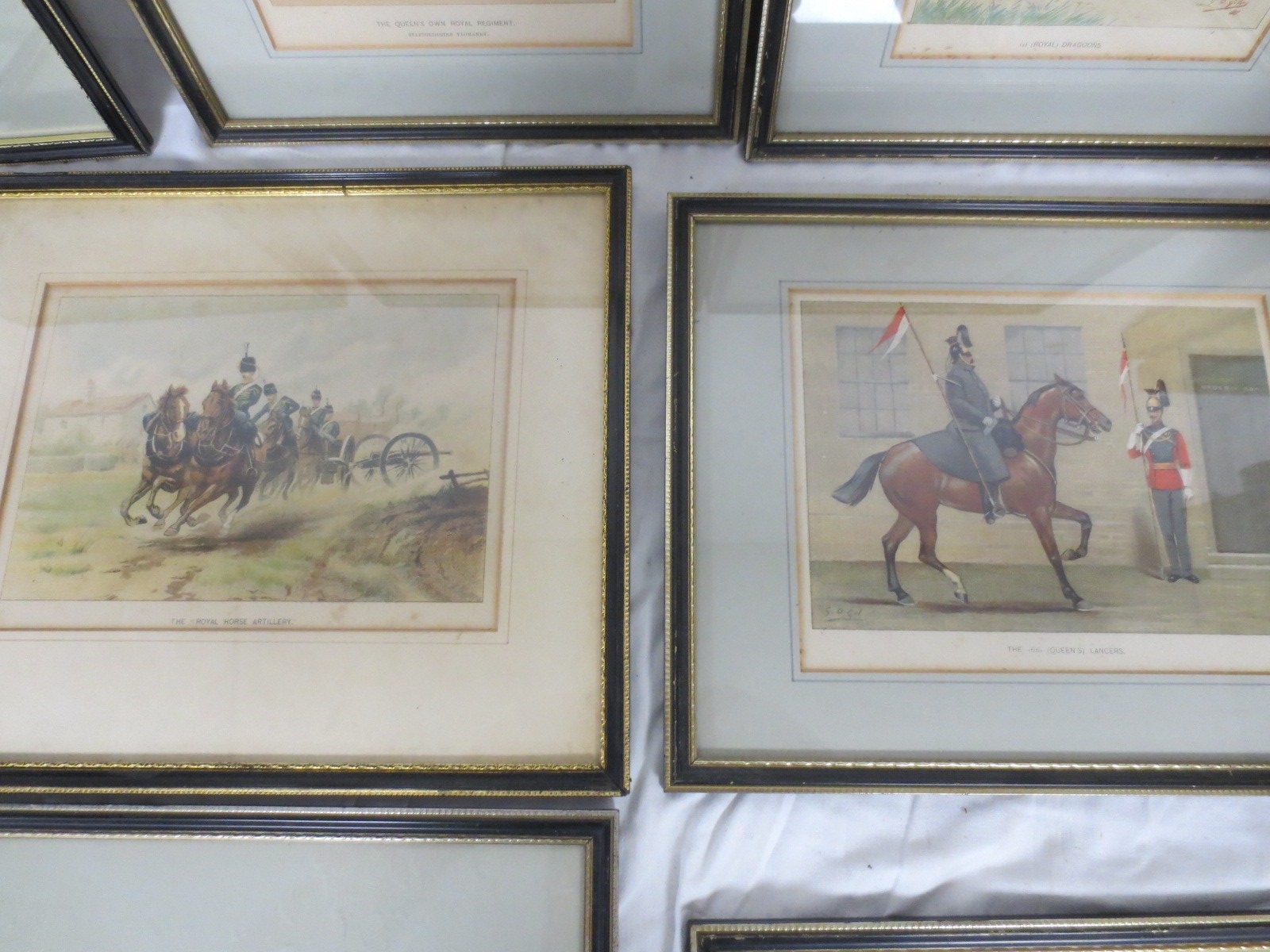 7 framed and glazed prints by J S Virtue & Sons Ltd after G M Giles showing cavalrymen from various regiments comprising the 1st (Royal) Dragoons, 10th (Prince of Wales' Own Royal) Hussars, The Honourable Artillery Company, The 1st Life Guards, The Royal Horse Artillery, the 16th (Queen's) Lancers and The Queen's Own Royal Regiment (Staffordshire Yeomanry).