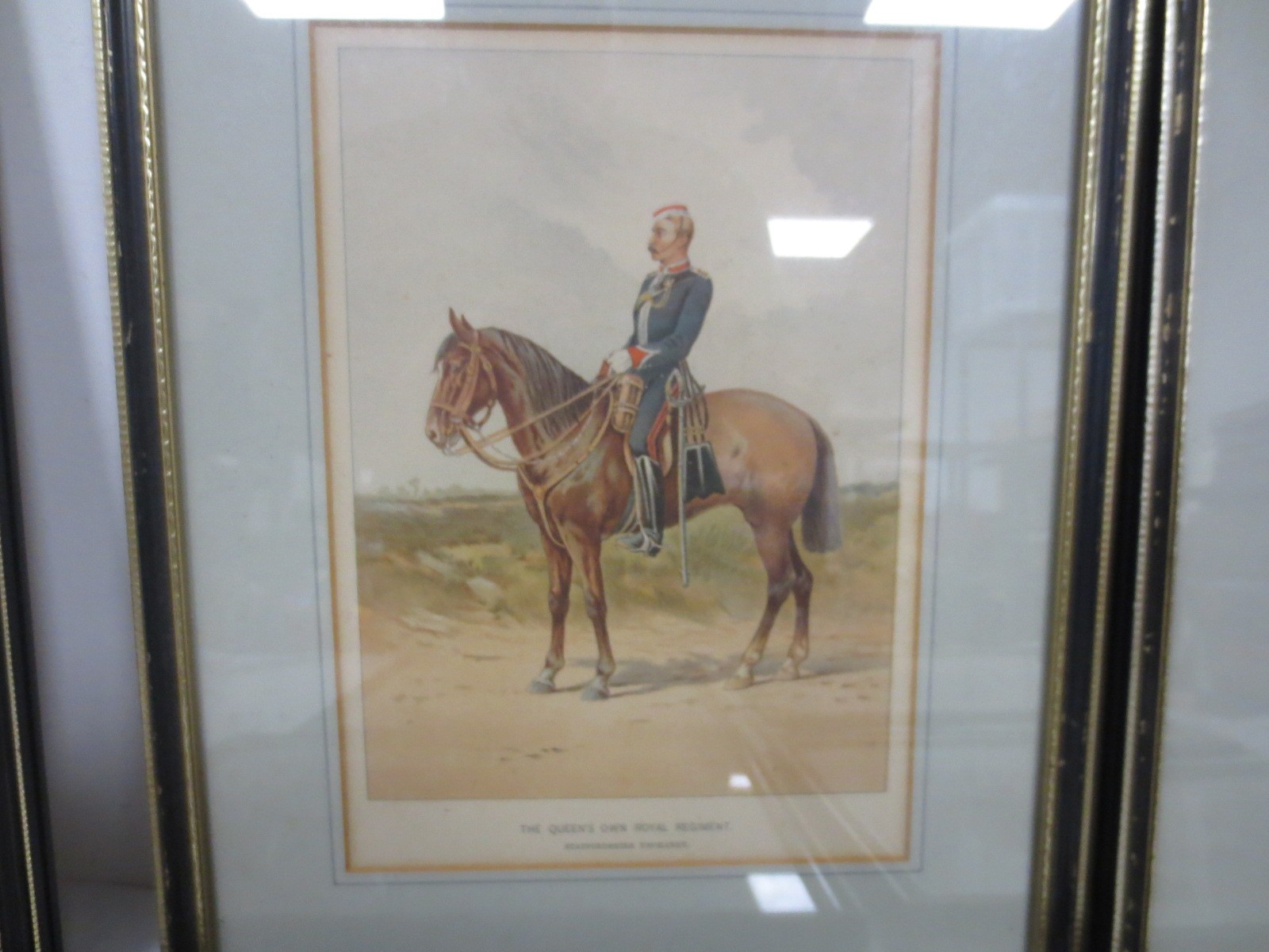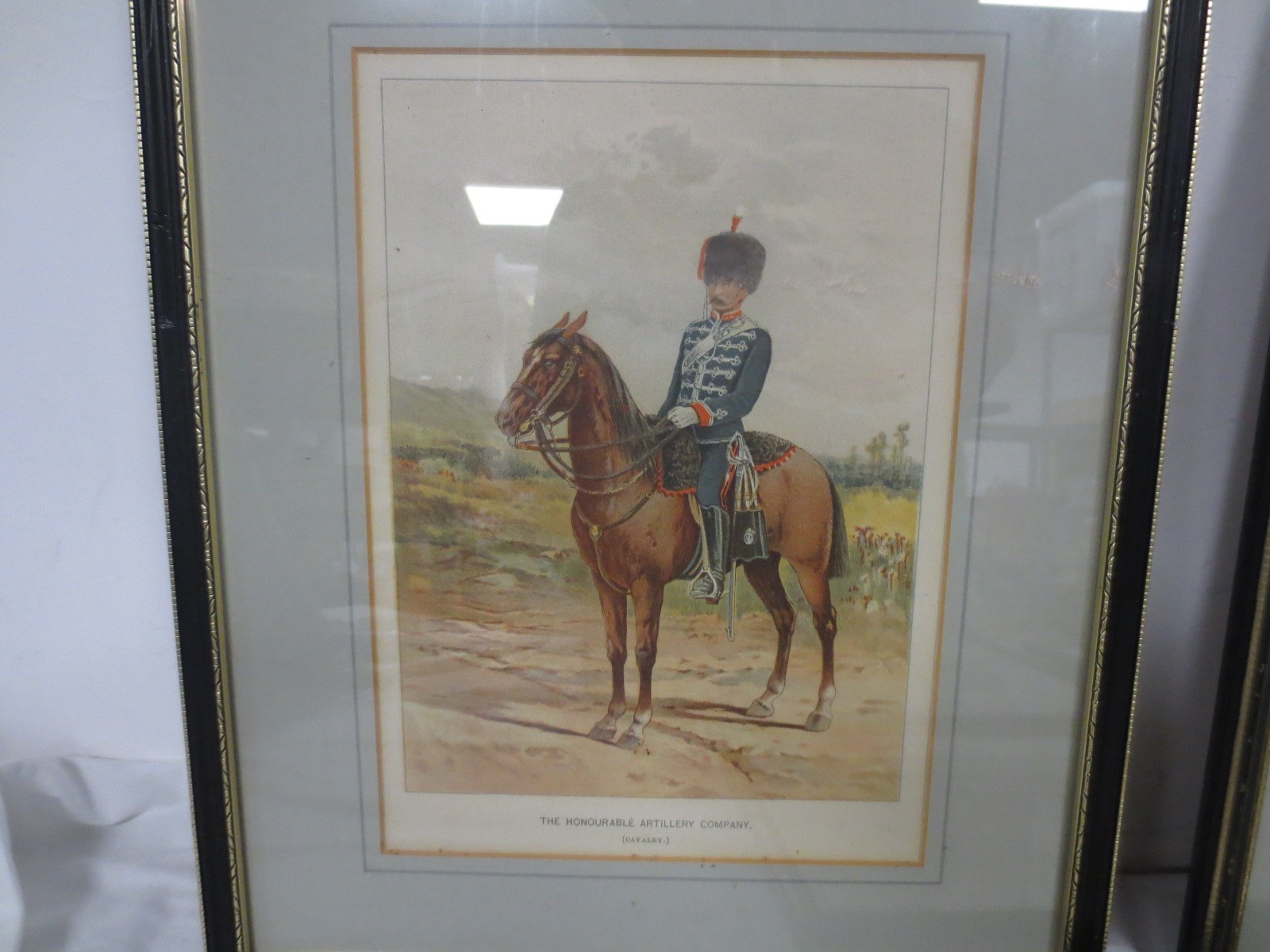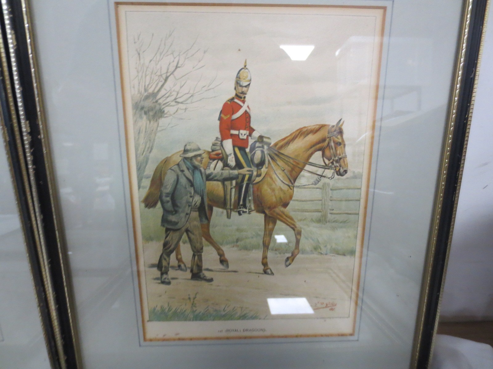 7 framed and glazed prints by J S Virtue & Sons Ltd after G M Giles showing cavalrymen from various regiments comprising the 1st (Royal) Dragoons, 10th (Prince of Wales' Own Royal) Hussars, The Honourable Artillery Company, The 1st Life Guards, The Royal Horse Artillery, the 16th (Queen's) Lancers and The Queen's Own Royal Regiment (Staffordshire Yeomanry).