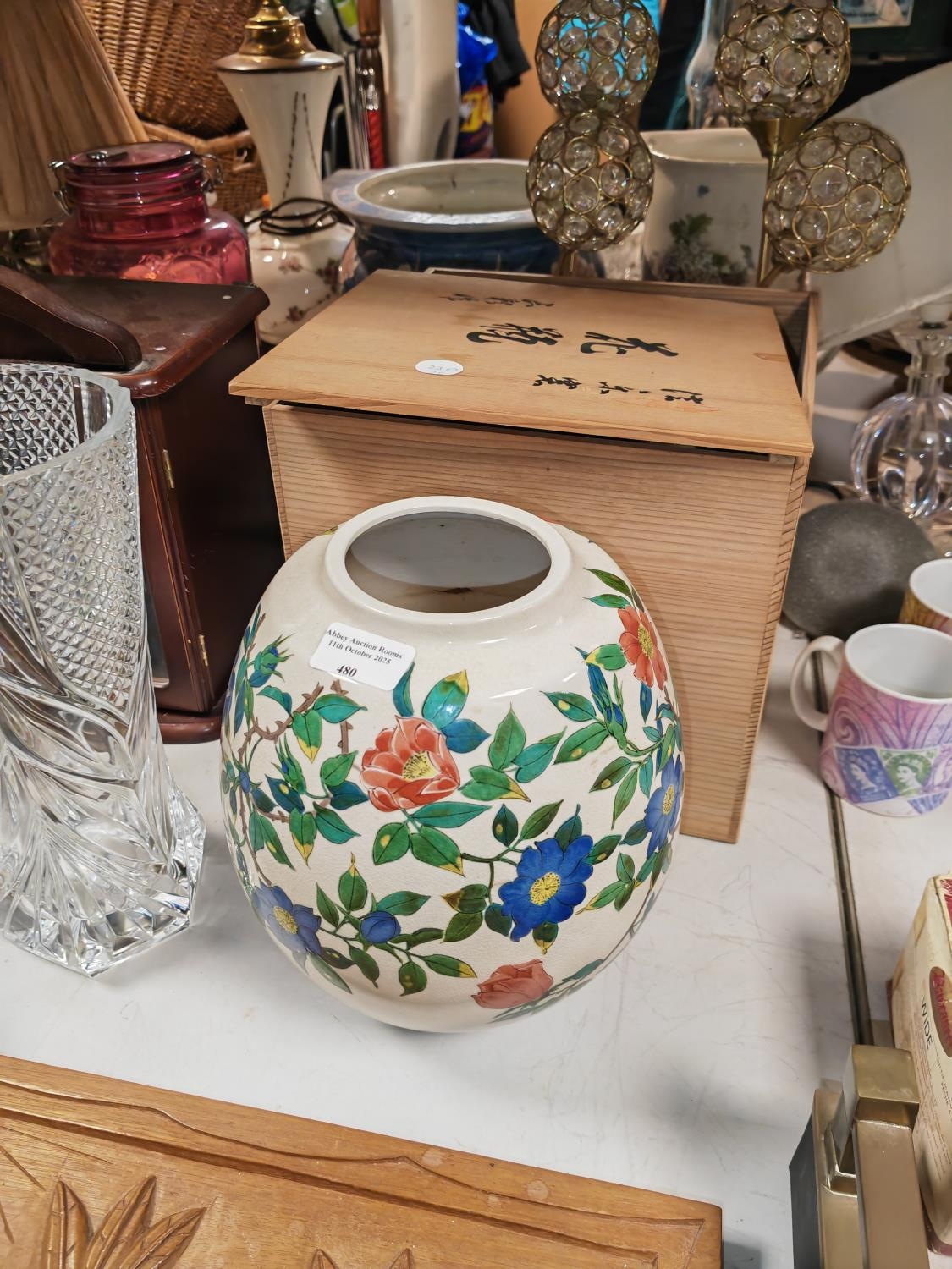 Large Oriental Rose Patterned Vase In Wooden Box