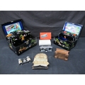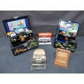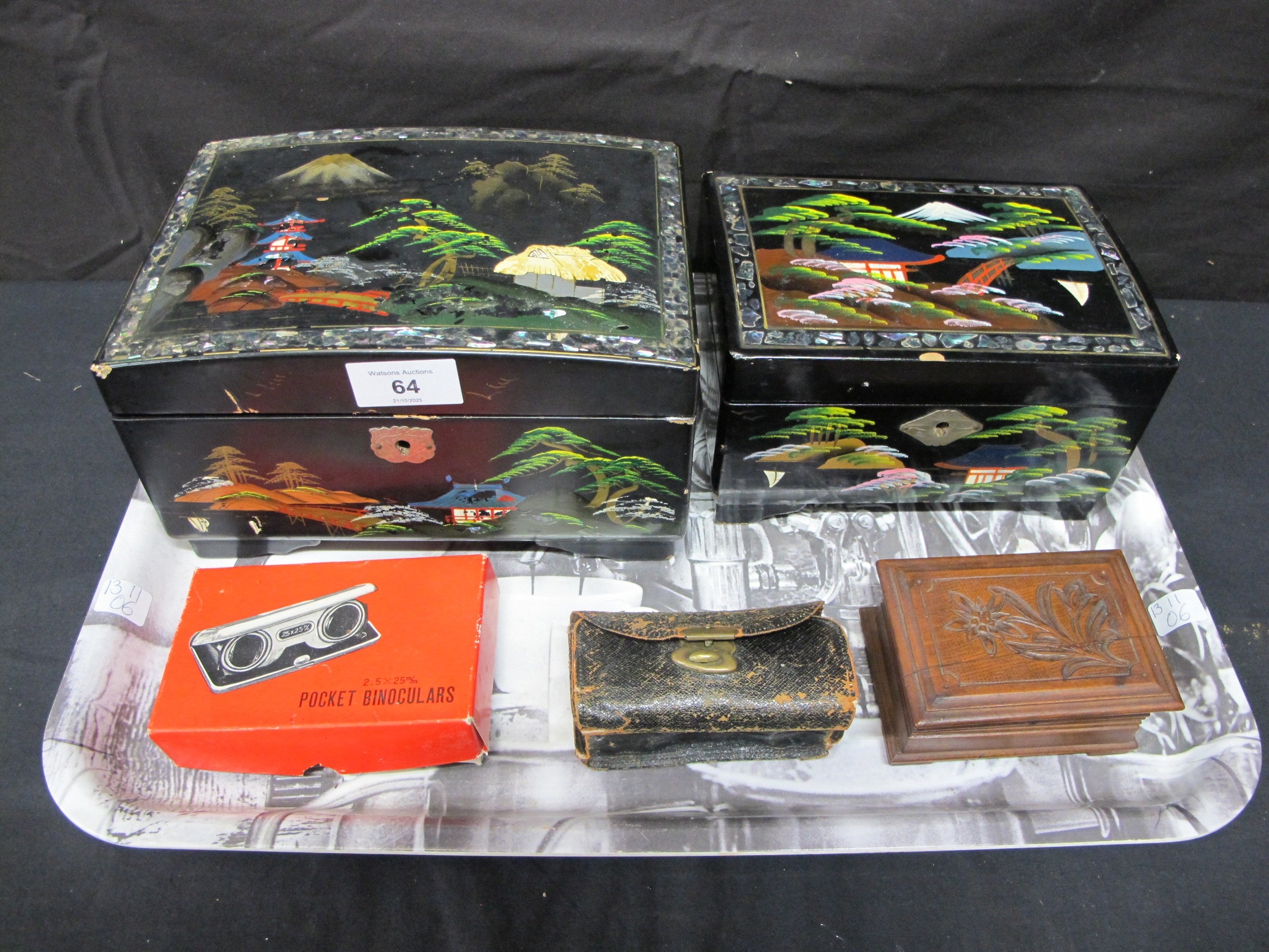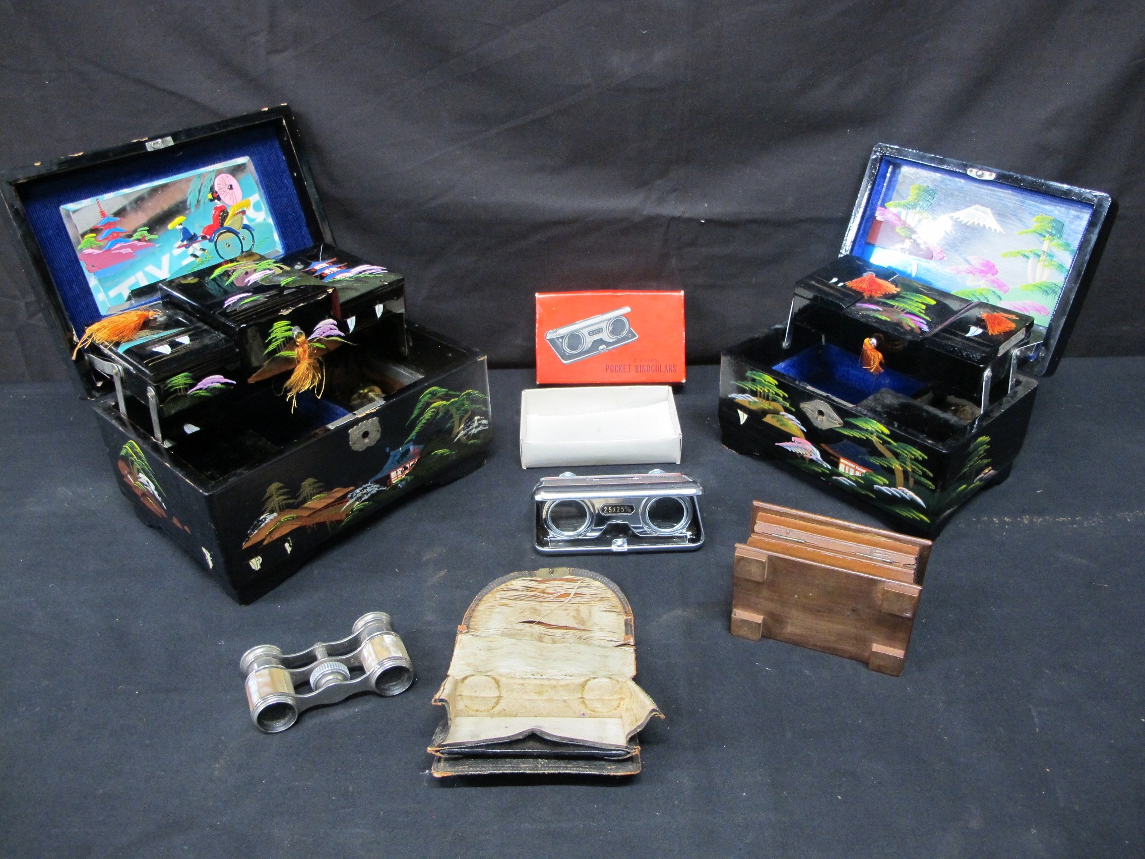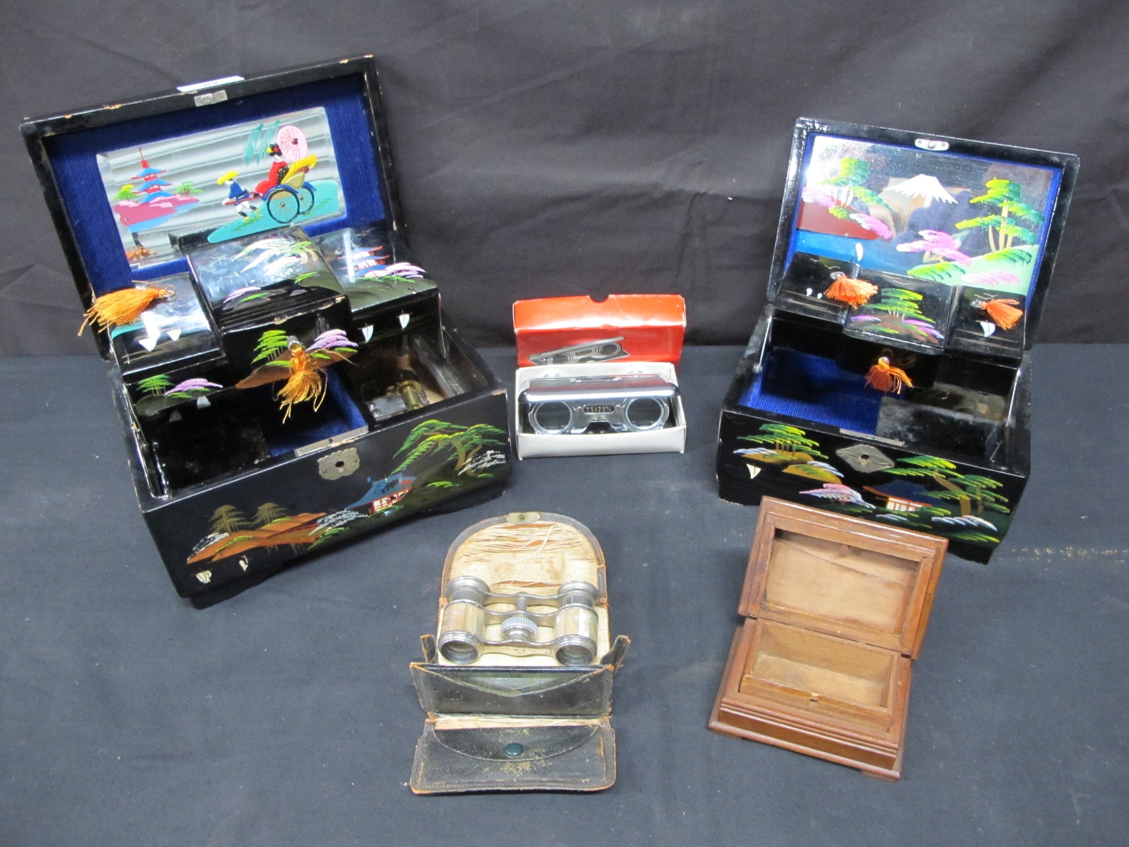 Group of items to include: two Oriental black lacquered inlaid Mother of Pearl musical jewellery boxes decorated with landscapes, inlaid Mother of Pearl opera glasses and a wooden carved trinket box