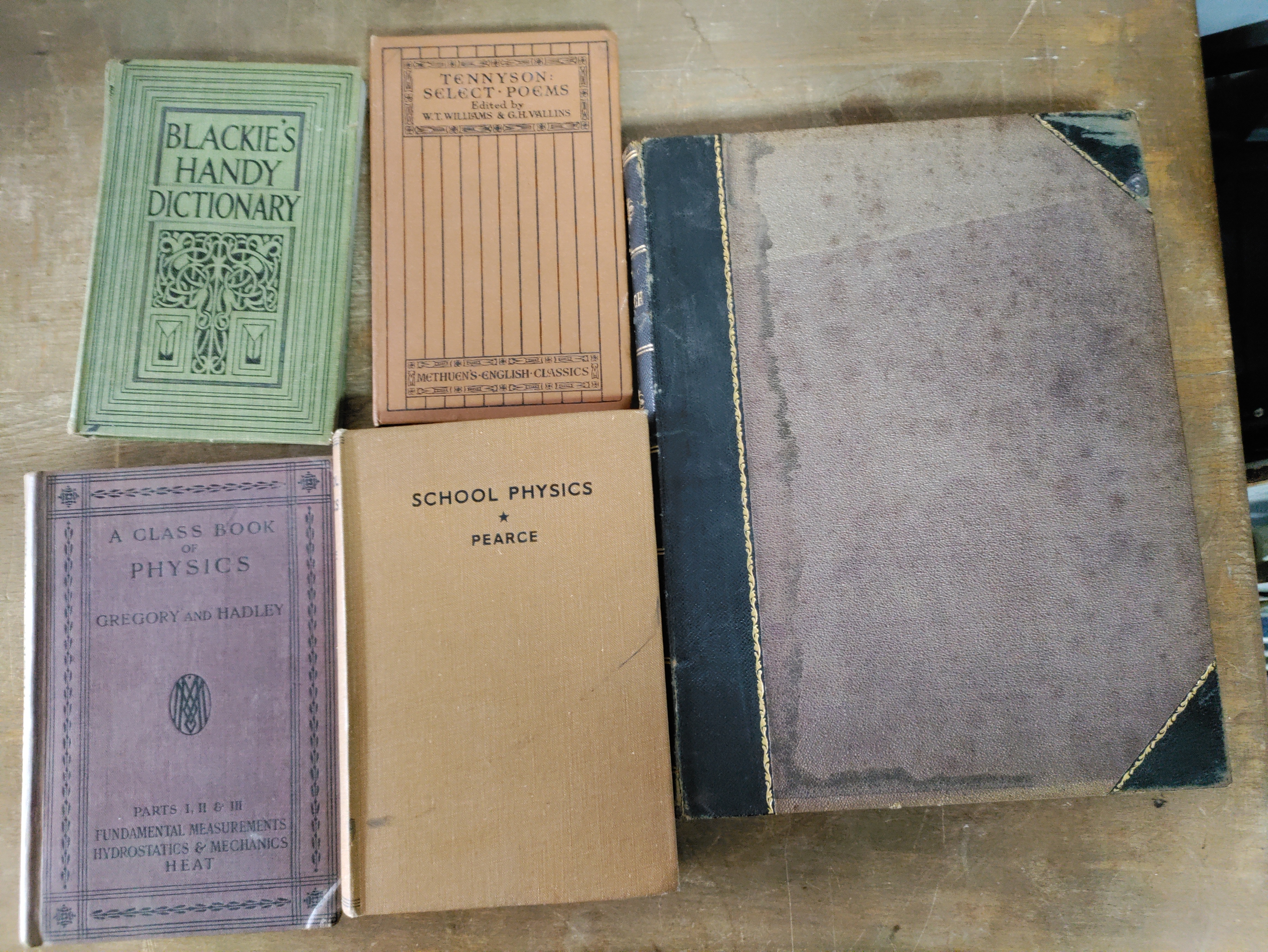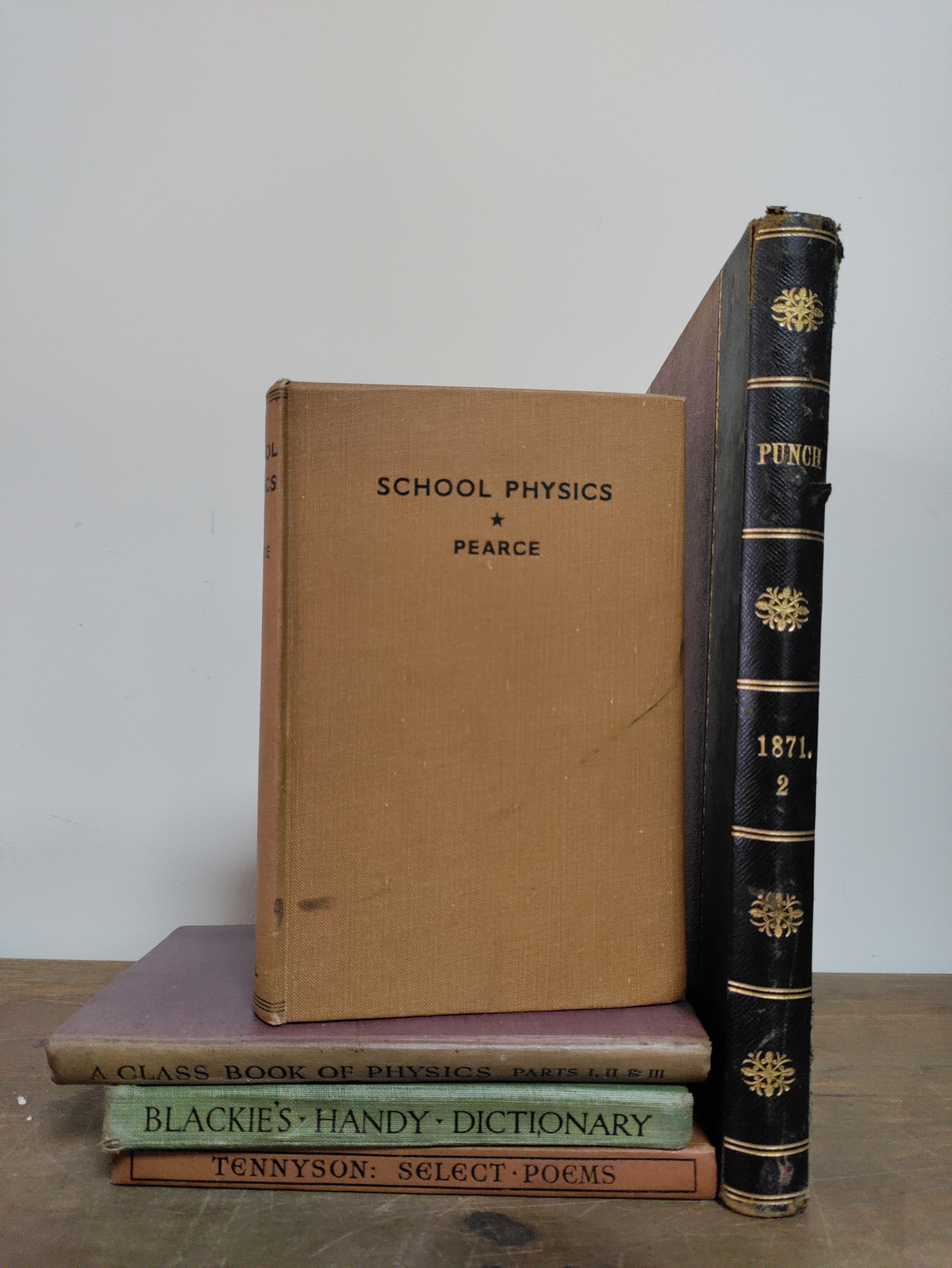 A collection of old books some antique to include "PUNCH" 1871 volume 2,blackies handy dictionary, a class book of physics, a school physics book, Tennyson select poems.