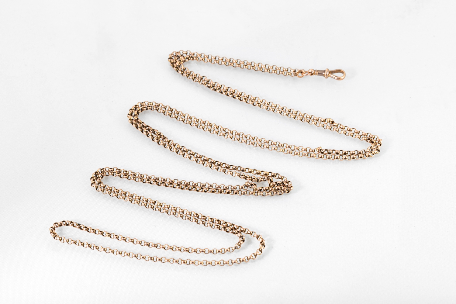 AN ANTIQUE 9CT ROSE GOLD BELCHER LINK MUFF CHAIN, ca 56" lon...
