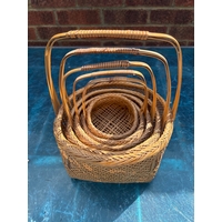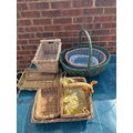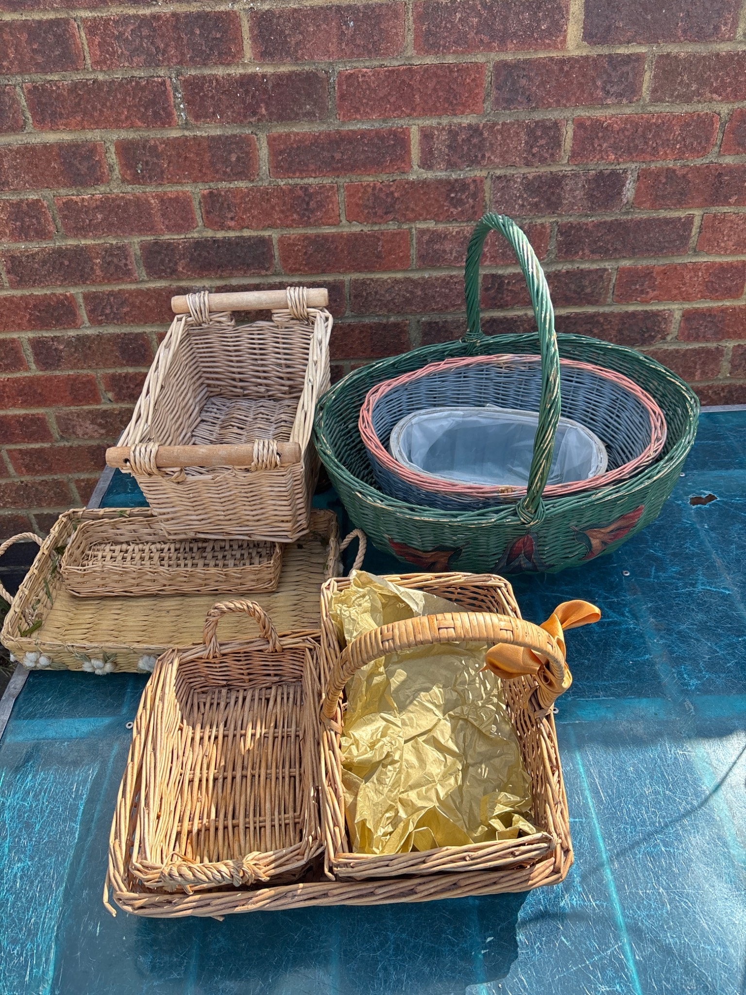 Woven wicker baskets, varying sizes, colors, and designs, including a green decorative basket with fabric lining.